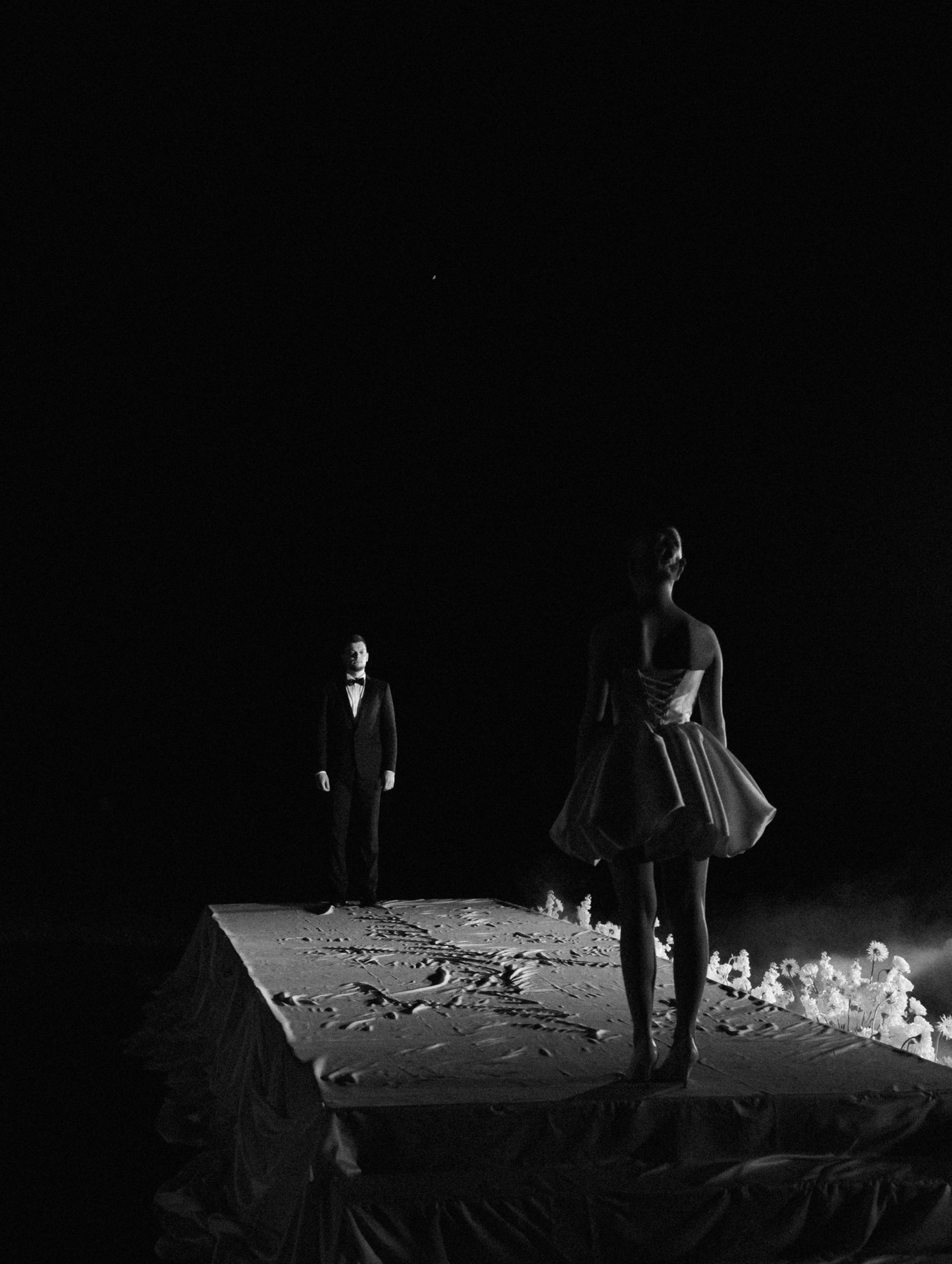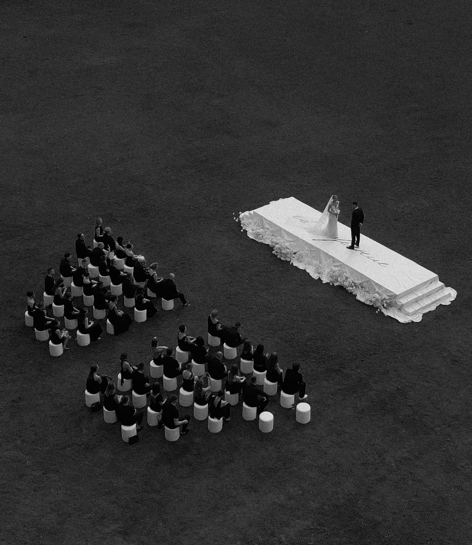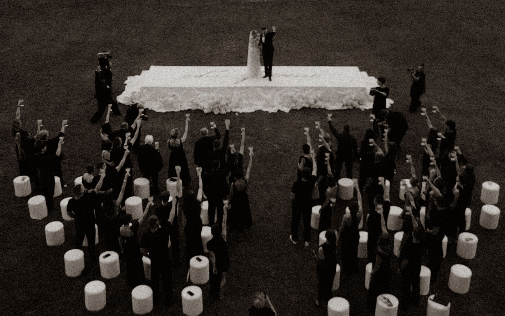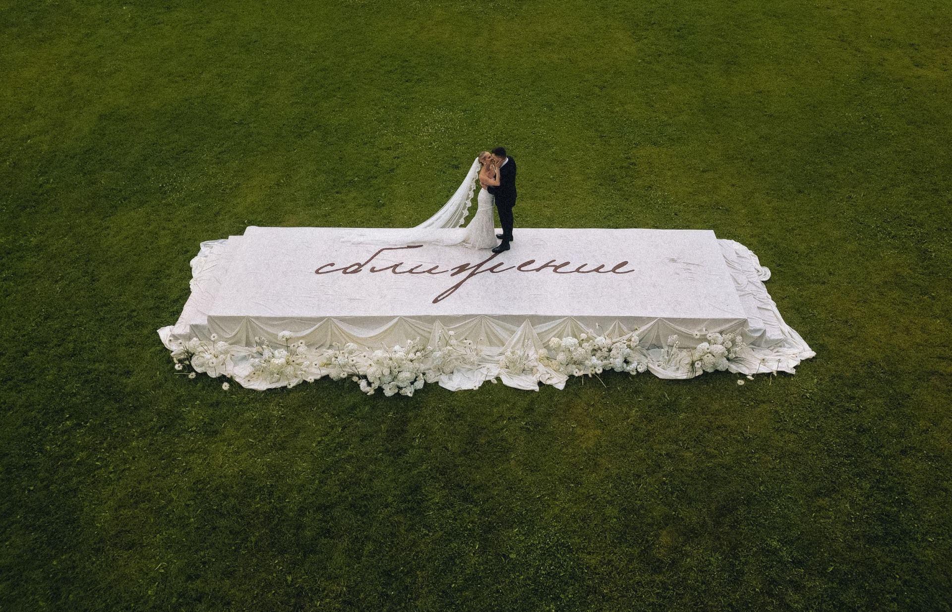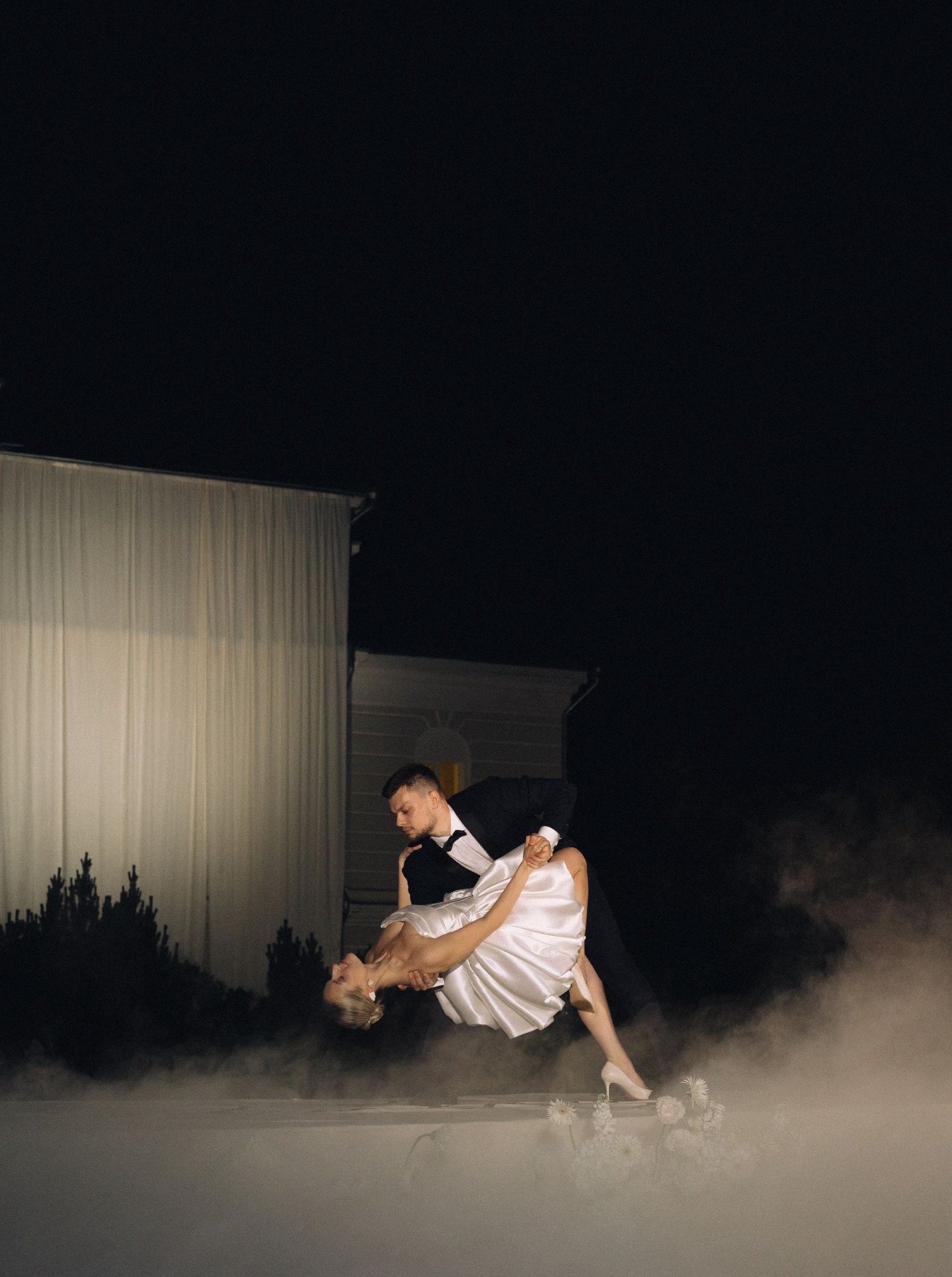 Самые жаркие обсуждения у нас были по поводу зоны церемонии. Мы смотрели референсы, эскизы, но во всём видели нюансы. И тут наши организаторы предложили: «Давайте сделаем церемонию на большом подиуме на фоне усадьбы? Рефы похожие мы найти не можем, но будет кайф! Вечером с подиума будет стекать тяжёлый дым, вы станцуете на нём первый танец, а над вами, за усадьбой, пустим салют!»