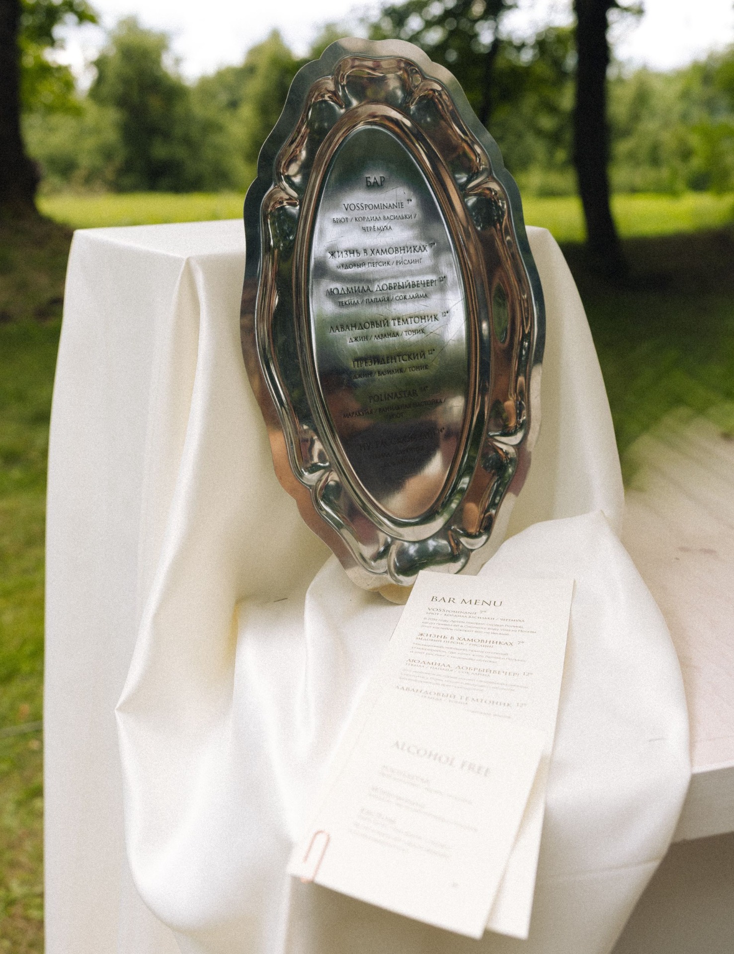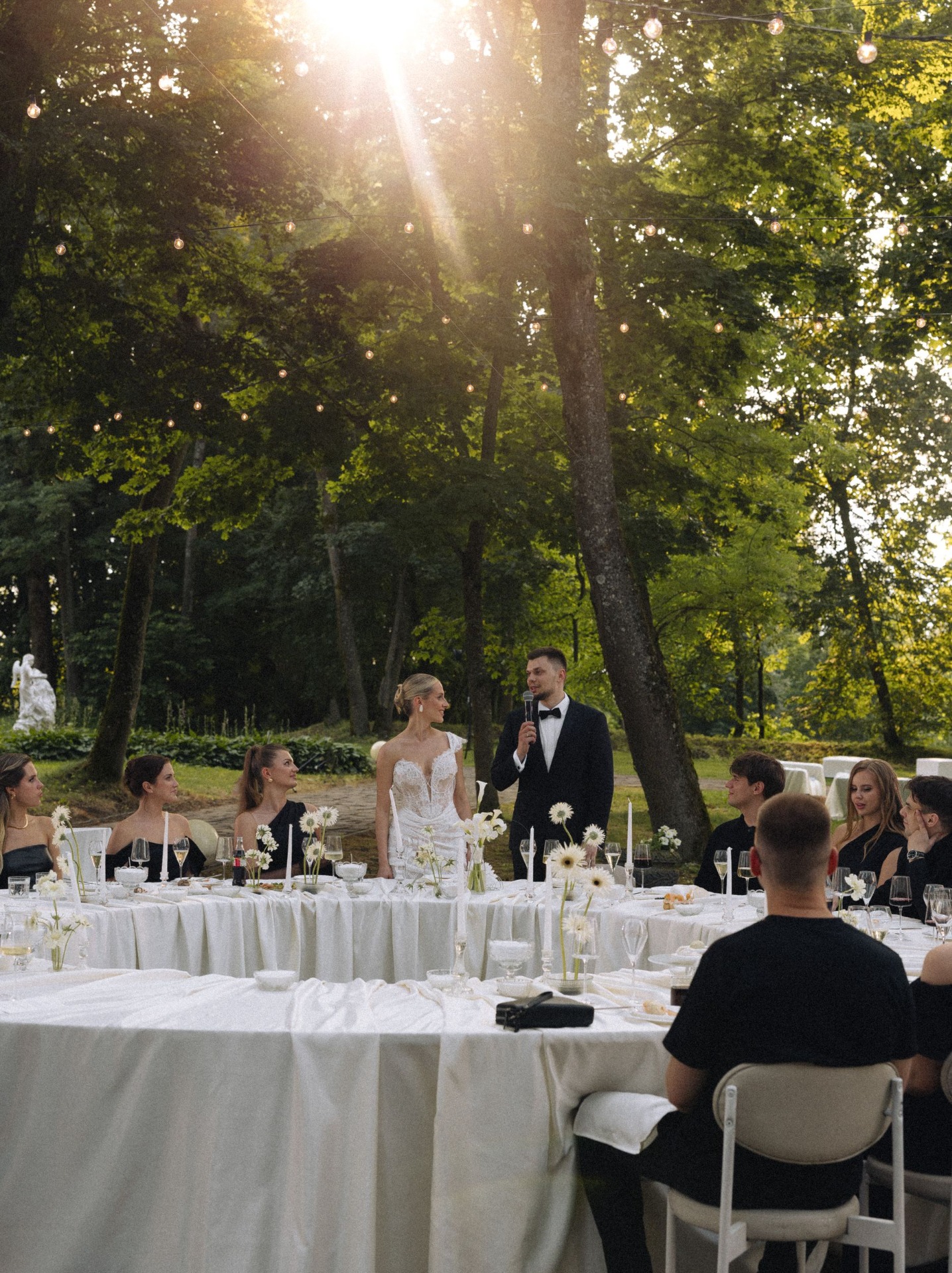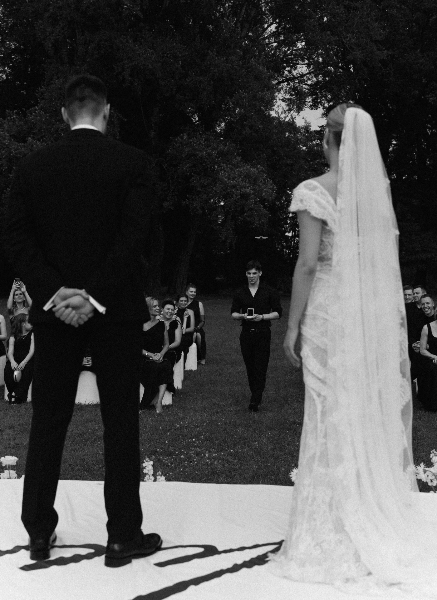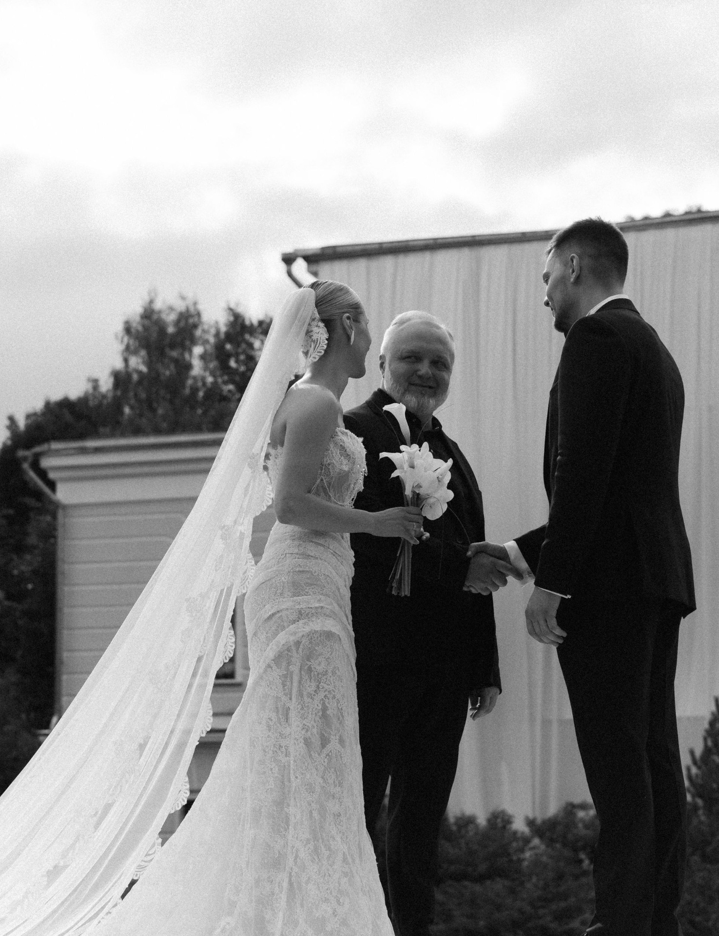 Но утренняя съёмка и велком прошли без дождя. Церемонию для нас вели гости. Они заранее записали для нас голосовые: мама Артёма объявляла его выход, а про меня говорили подруги и сёстры. Перед тем как объявить нас мужем и женой, Рома, наш ведущий, попросил официантов вынести всем мой любимый коктейль Pornstar. И в этот момент начался дождик. Он шёл минут 10, но это добавило нереальной магии моменту.