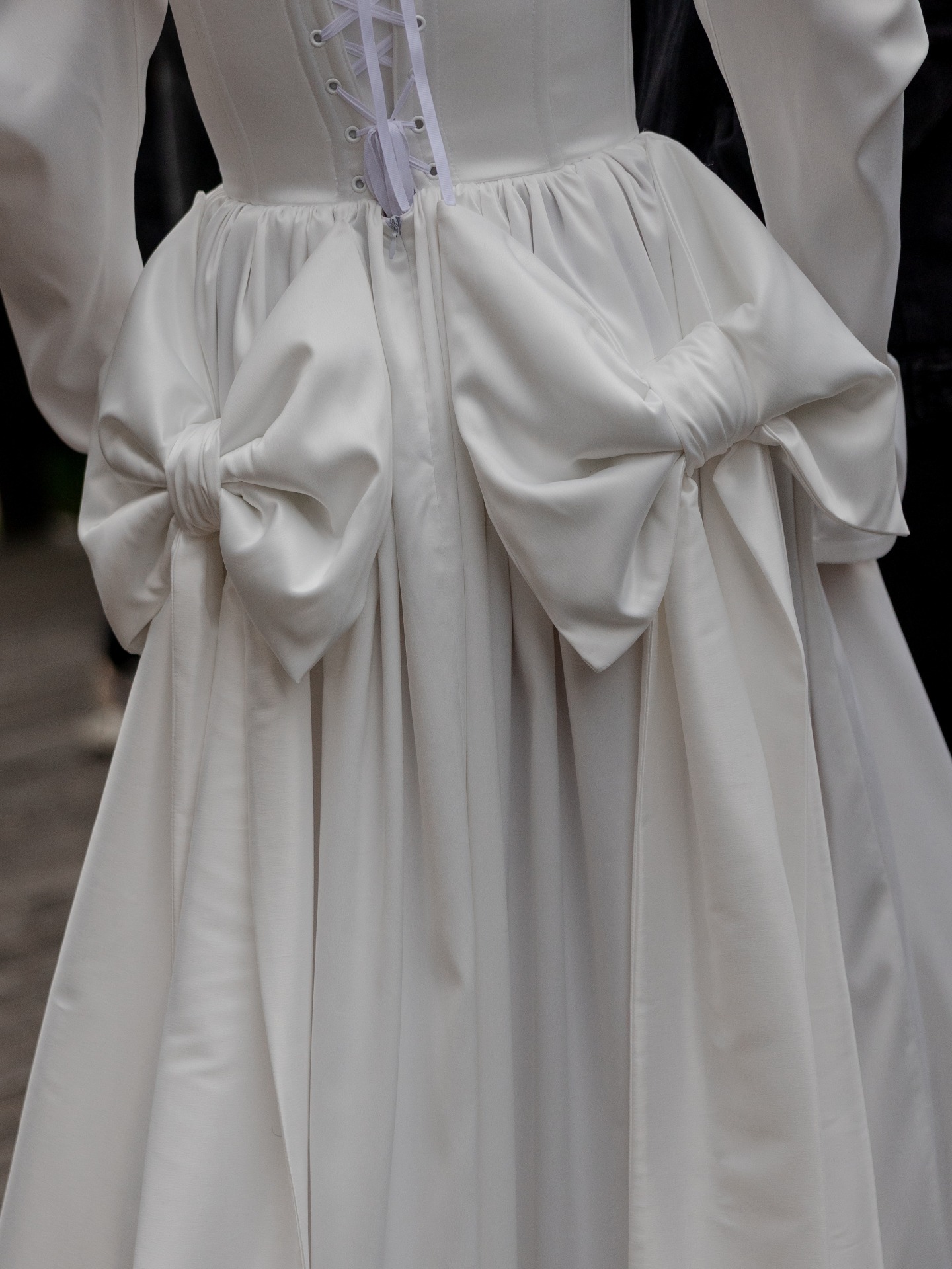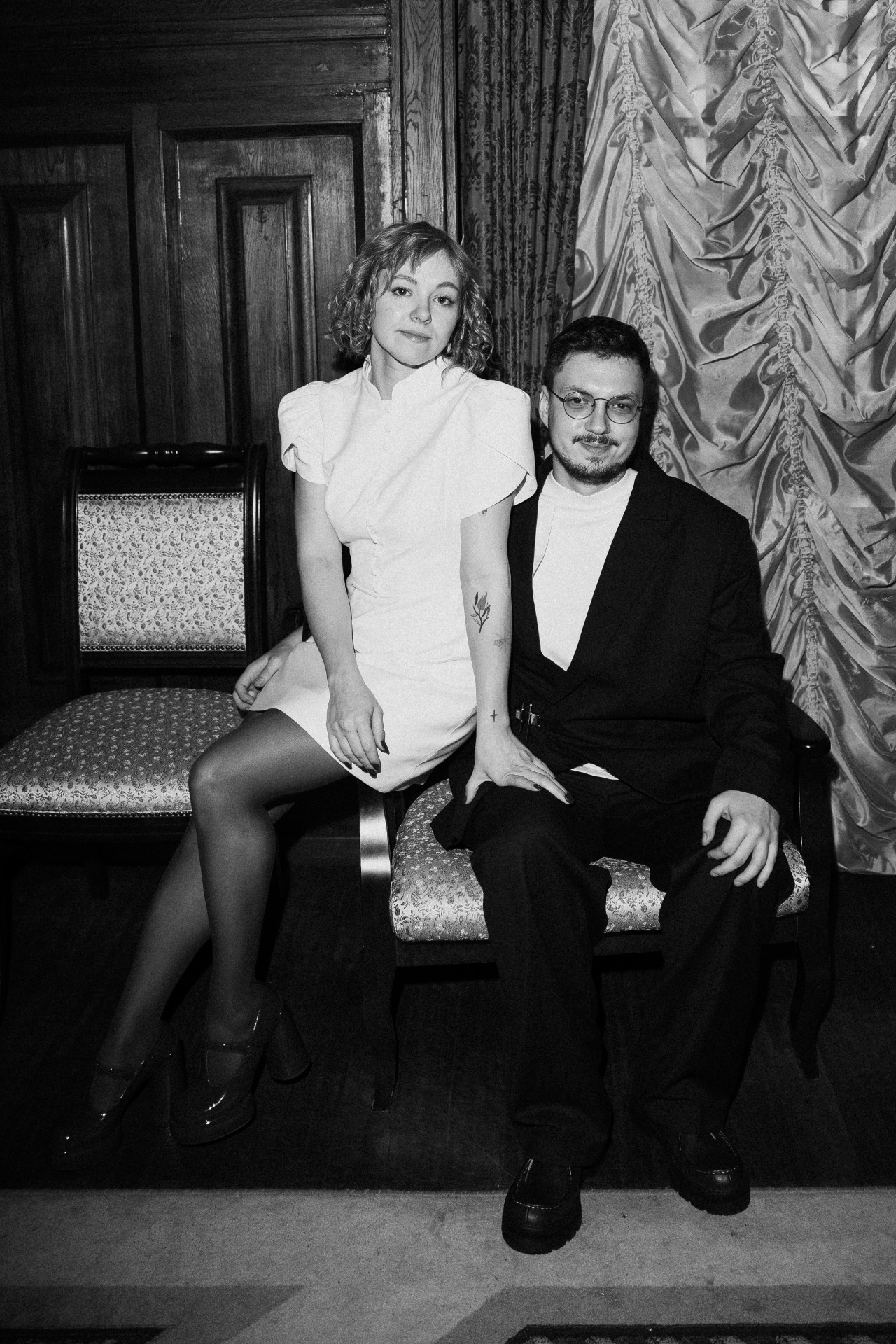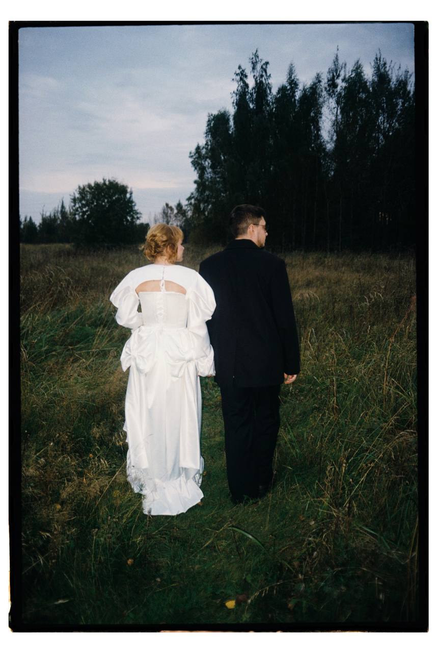Образ в ЗАГС был готов, и оставалось самое сложное — выбрать основной наряд. Сначала я ходила по свадебным салонам, но совершенно неуютно чувствовала себя в этих пышных платьях и уже была готова шить наряд на заказ. Когда я сидела в Pinterest в поисках референсов, то сохранила одно платье и, перейдя по ссылке на источник, увидела, что это петербургский локальный бренд KOSS KOSS. Я сразу отправилась в их шоурум.