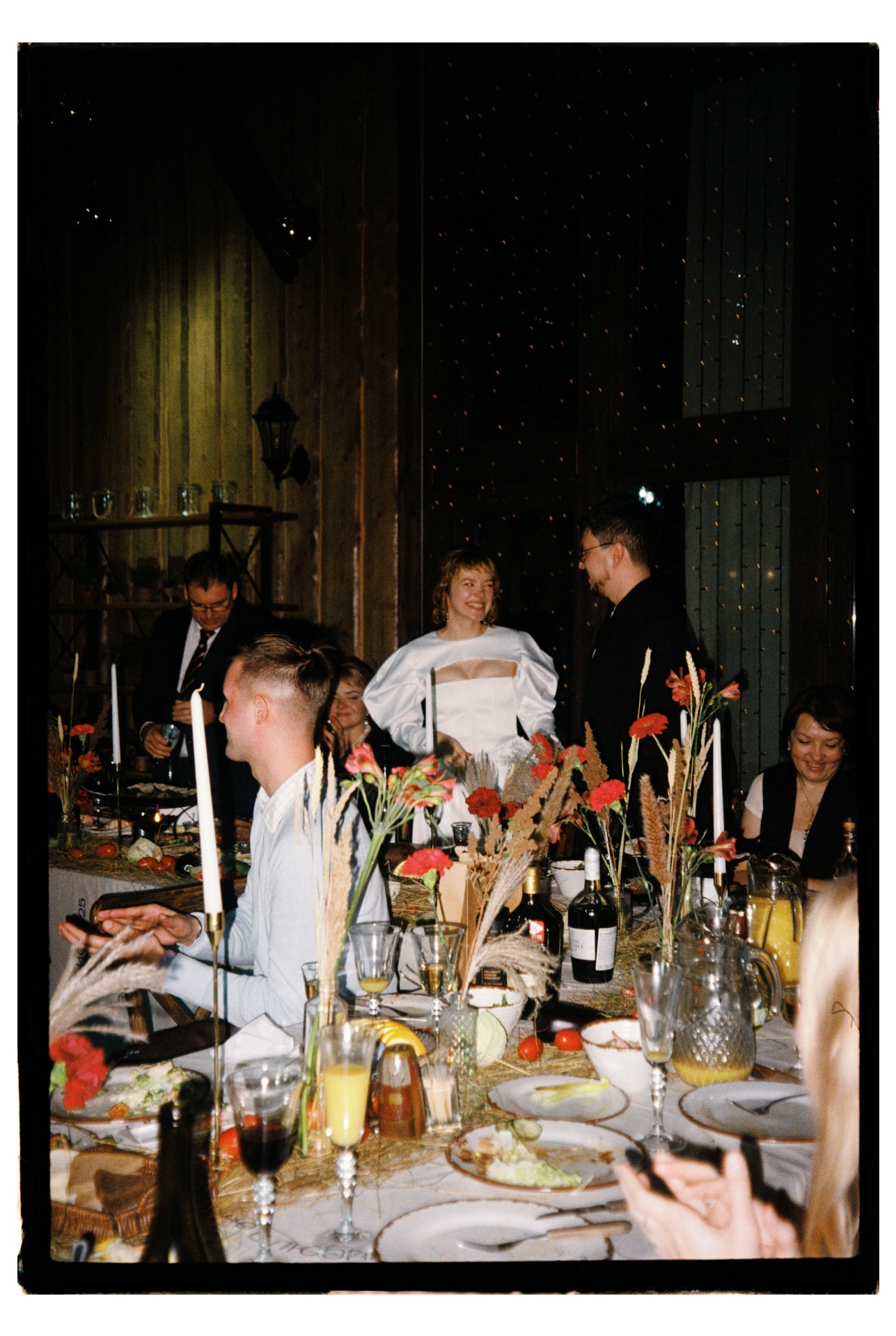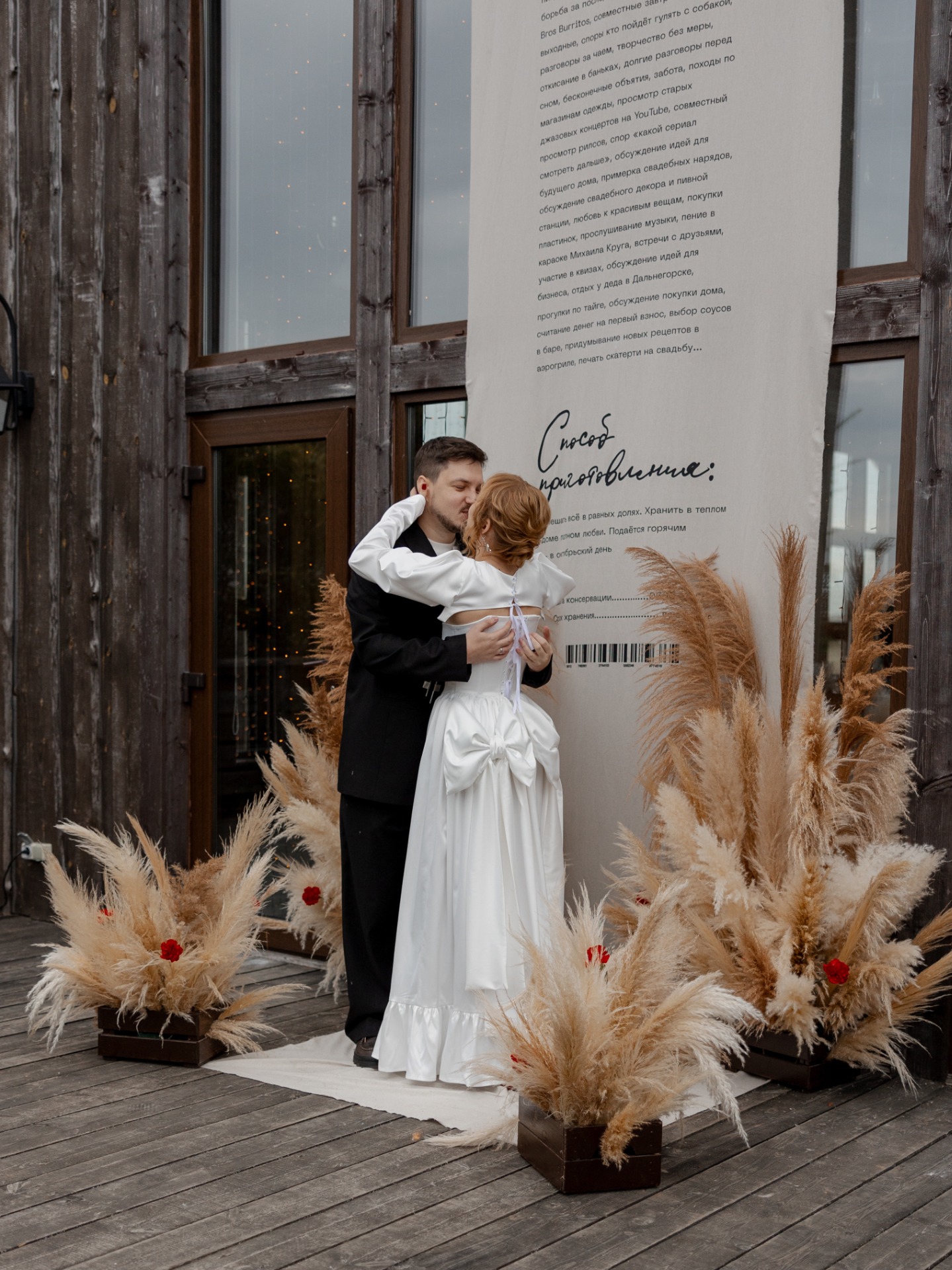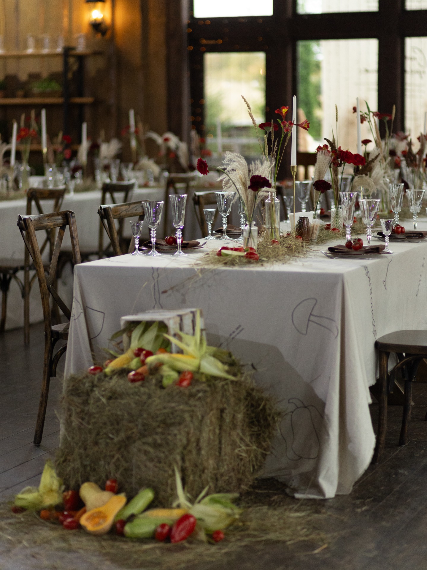 Концепция сбора урожая сложилась сама собой: осень, амбар, деревенский шарм. Но для нас было важно, чтобы в ней была мысль именно про нас. Так родилась метафора: это день сбора урожая нашей любви — всего, что мы взращивали вместе, делая и выбирая друг друга изо дня в день.