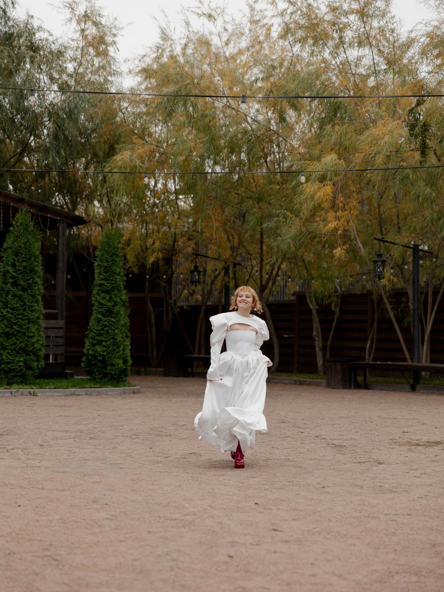 Первое, что я купила из образа — это платье в ЗАГС из Lichi. У меня сразу появилась идея обыграть его массивными красными туфлями и красными колготками. Найти красные туфли оказалось намного сложнее. Кажется, я перешерстила весь интернет и в итоге нашла нужную модель у POIZON CHARLES & KEITH, а потом ещё месяц разнашивала их.