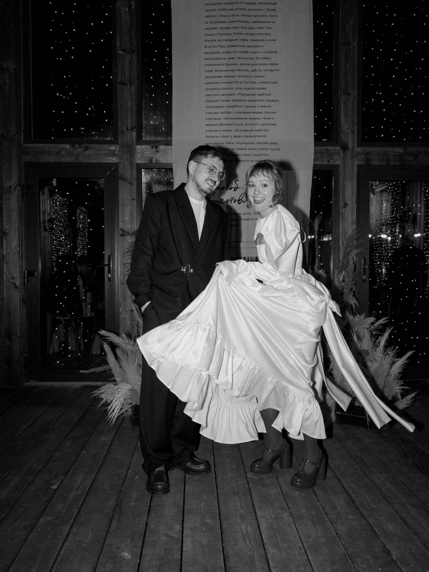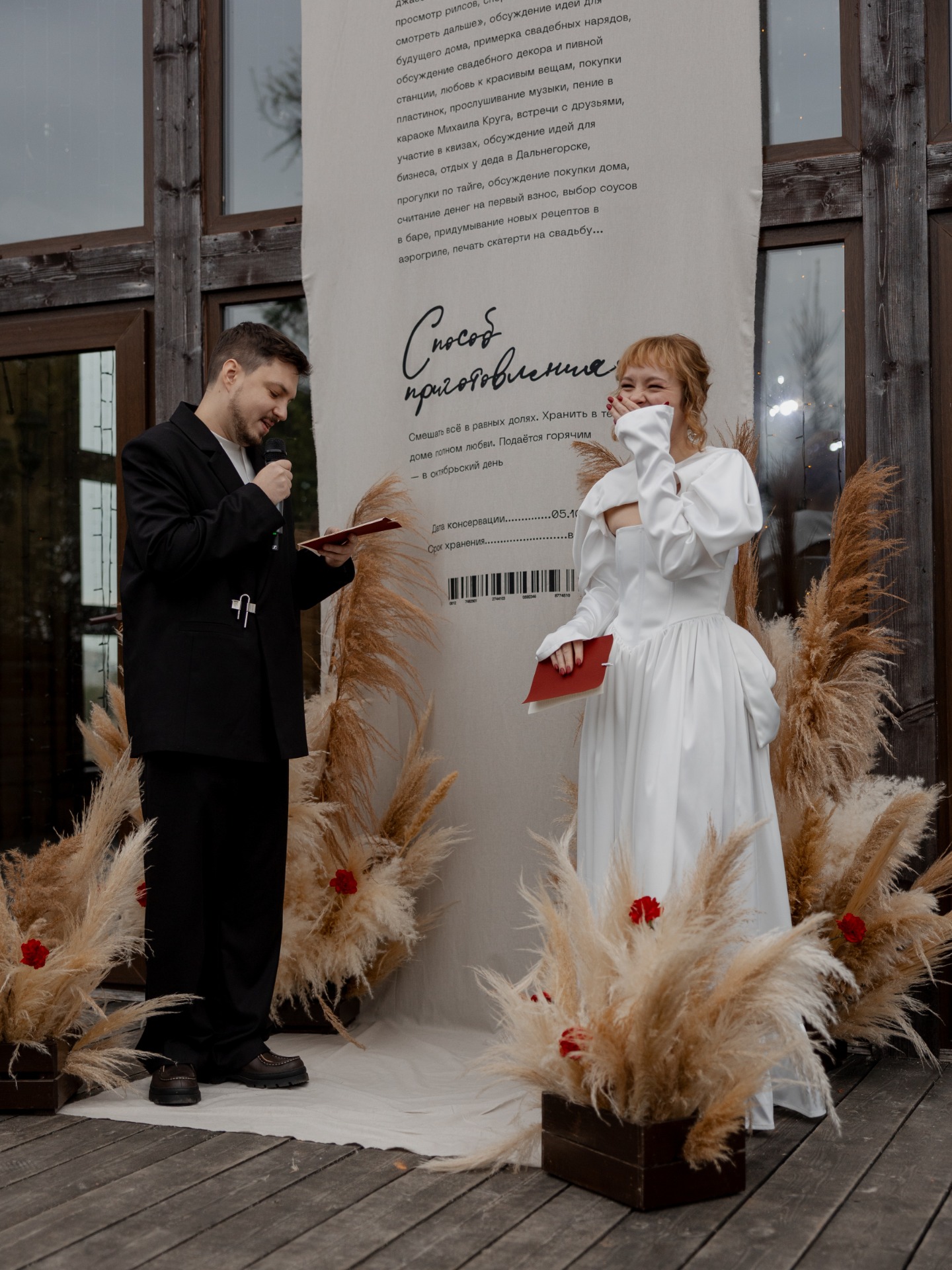 На церемонии главным объектом тоже было полотно — девятиметровая ткань, опускающаяся с крыши до пола. На ней мы напечатали «ингредиенты нашей жизни»: всё, что мы любим, делаем и о чём мечтаем. Получился длинный, живой, настоящий список — наш собственный урожай.