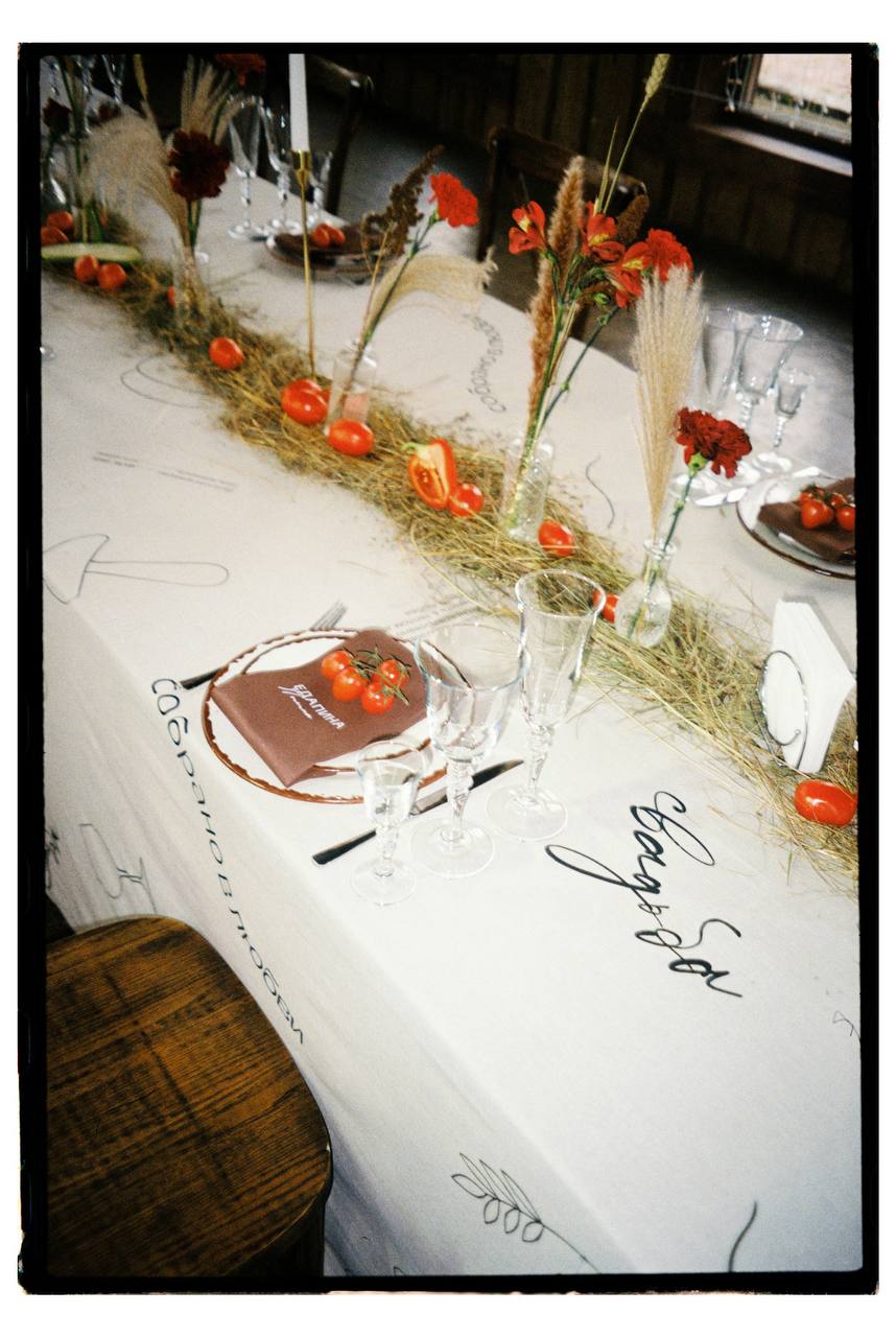 Поскольку я занимаюсь печатью на ткани, весь декор строился на текстиле. Центром праздника стал один шестнадцатиметровый общий стол, и мы с Кириллом целый месяц печатали для него скатерть шелкографией: осенние элементы, дату, наши знаки и символы.