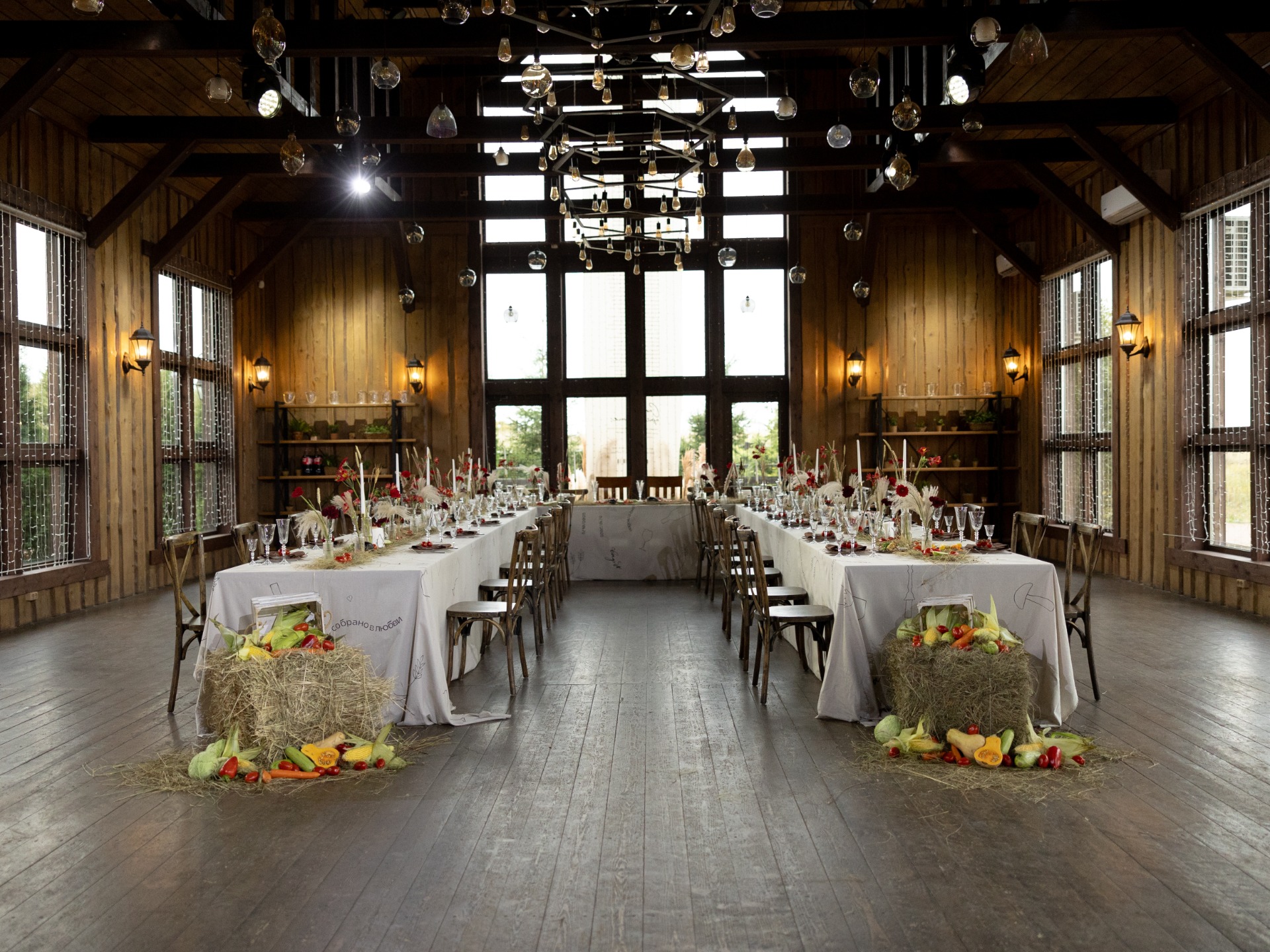 Подготовка заняла у нас около пяти месяцев, мы назначили свадьбу на 3 октября. Концепция появилась сразу: Кирилл давно мечтал о свадьбе «в поле, за длинным столом, по-деревенски». Отмечать праздник в поле в октябре было рискованно, поэтому мы искали площадку с тем же настроением и почти сразу нашли Амбар №1.