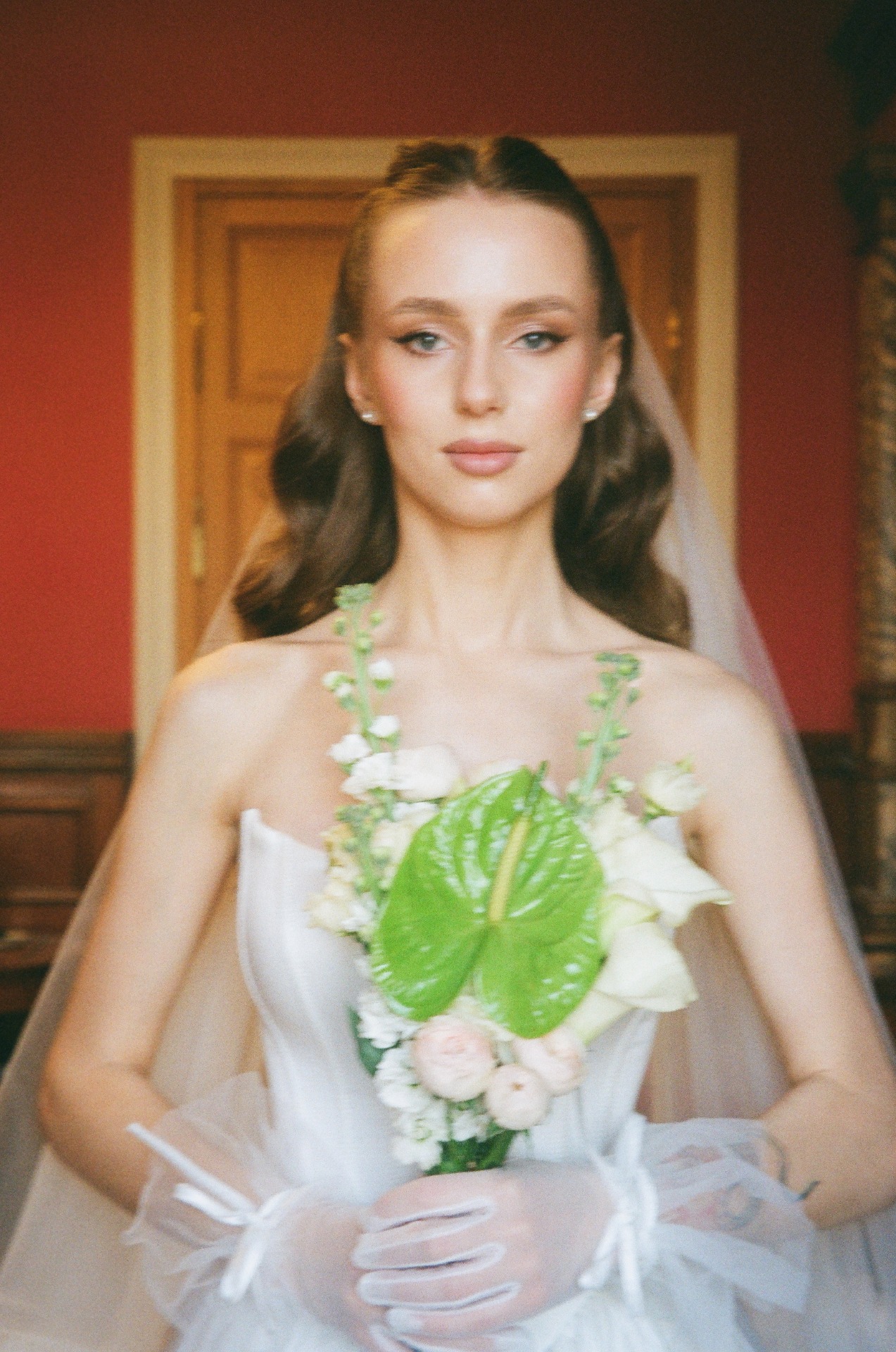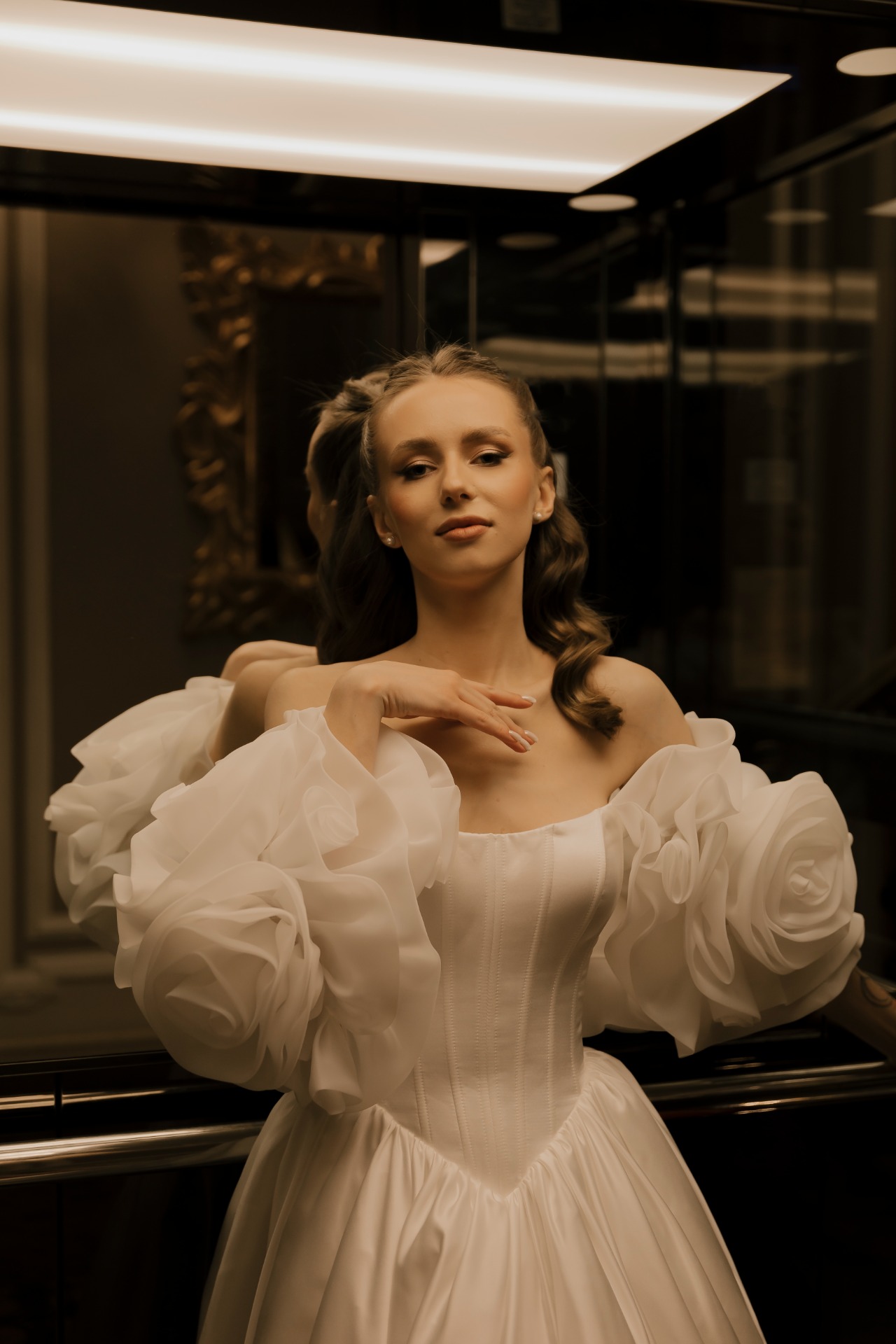 К платью я подобрала элегантные атласные туфли с острым носом и фату с лаконичной окантовкой. Образ не нуждался в обилии аксессуаров, акцентом стали съёмные рукава в виде крупных цветов.