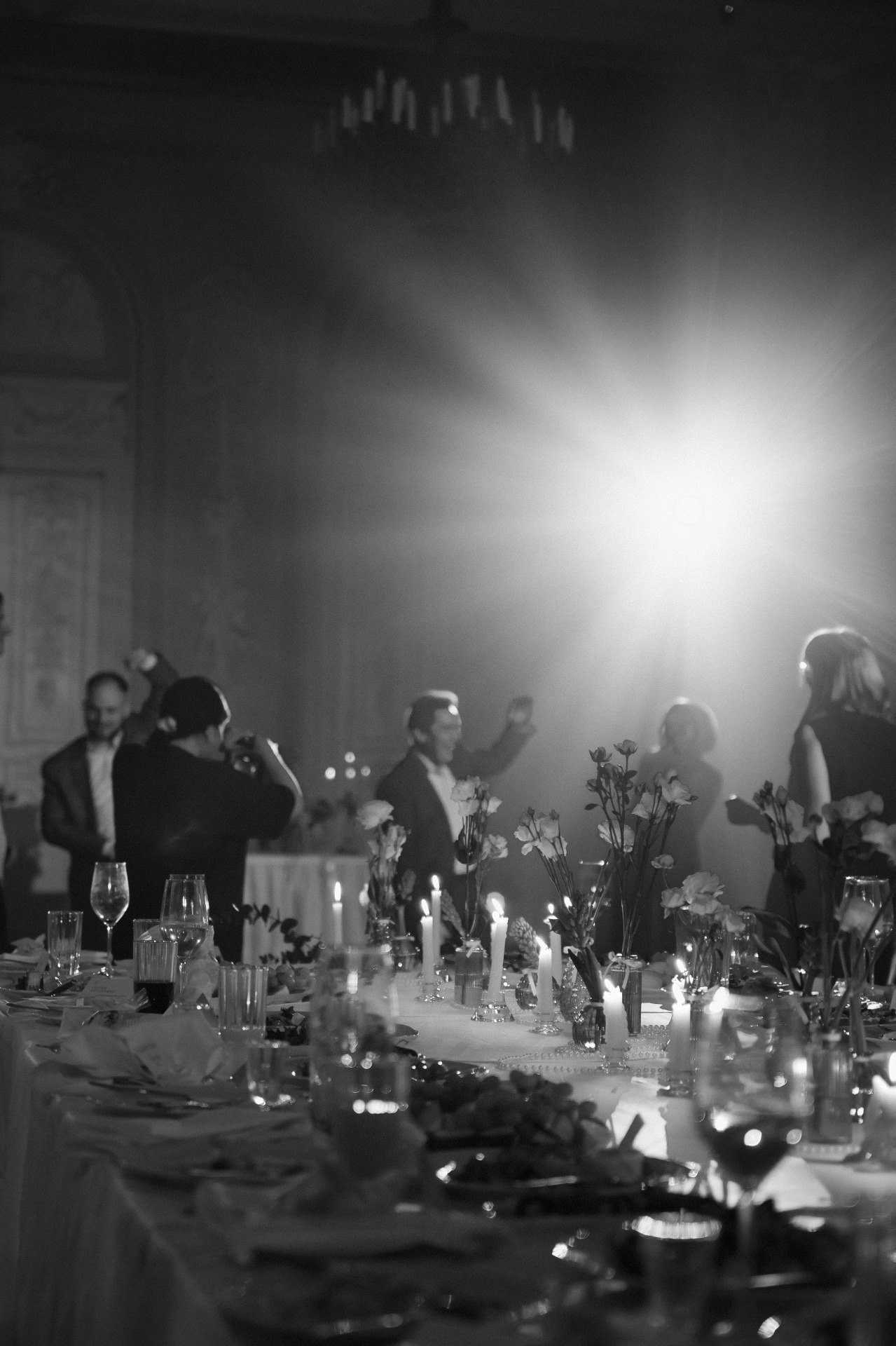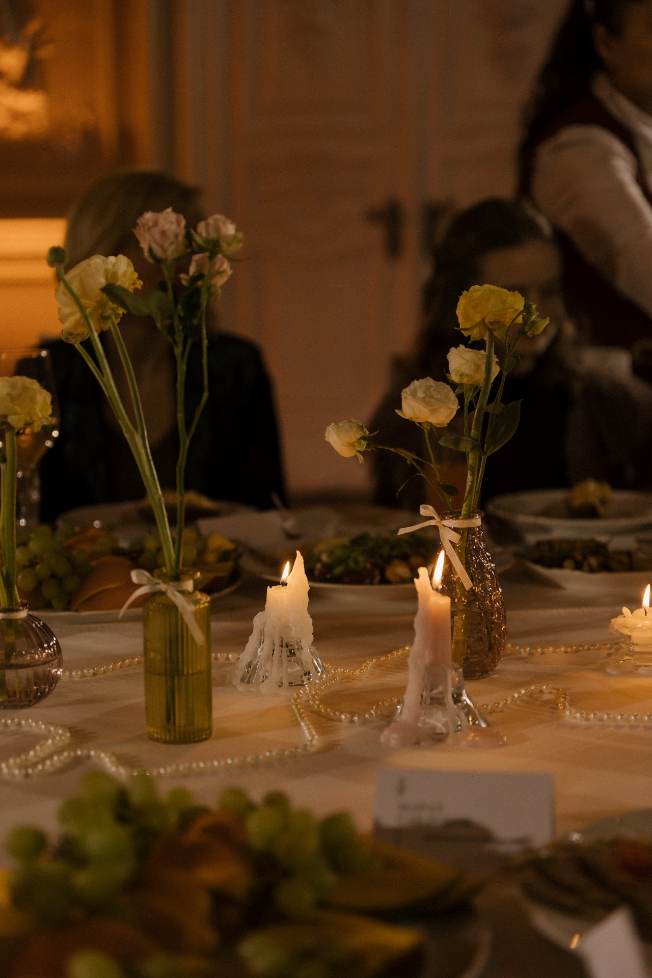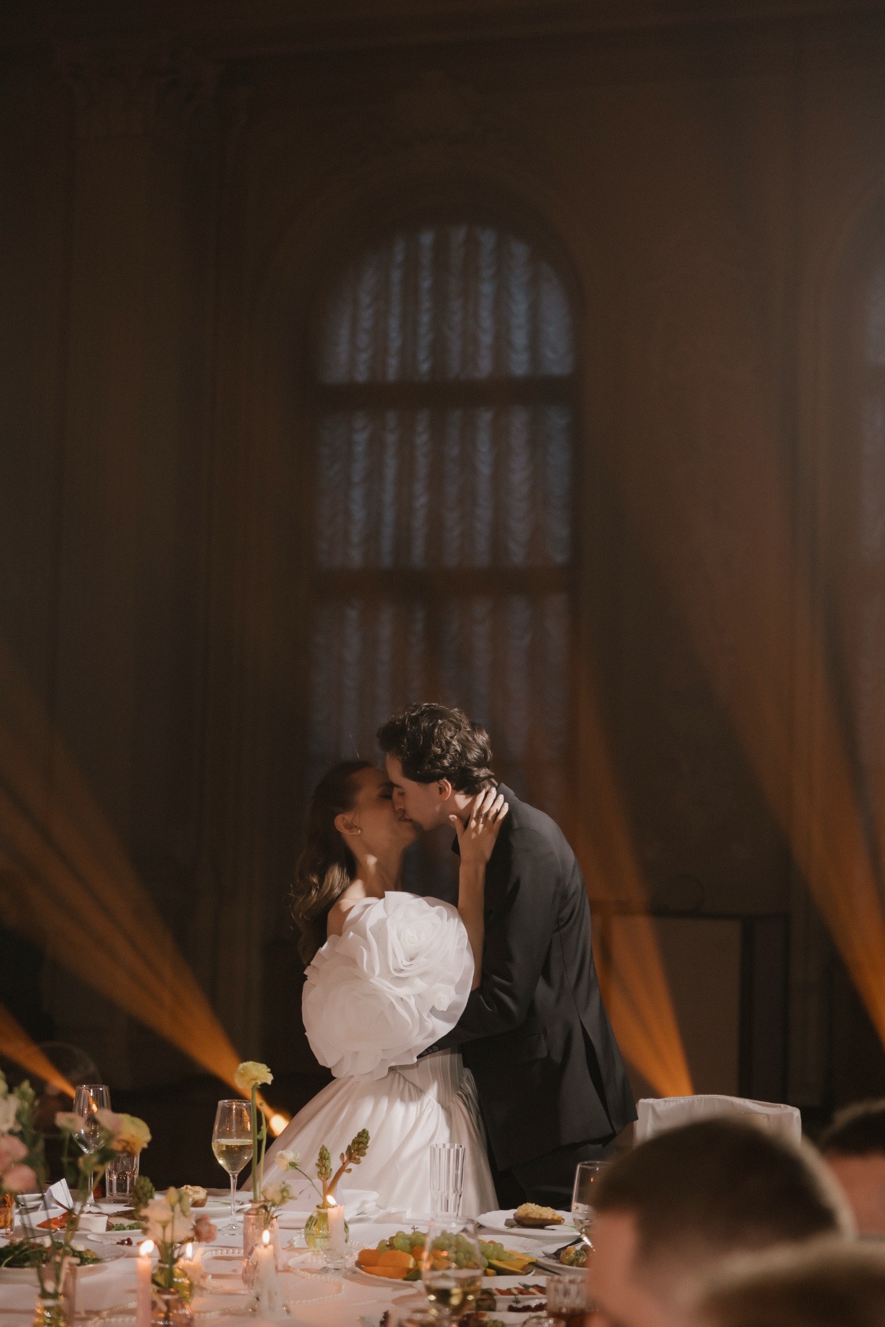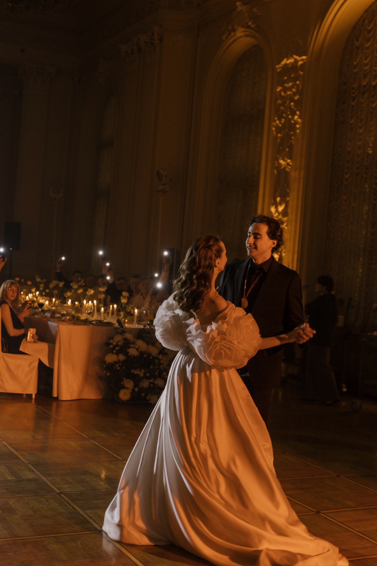 После росписи мы продолжили праздник в Николаевском дворце. До этого момента я ни разу не видела, как будет выглядеть зал, декором занимались мои друзья. Когда я вышла к гостям, сердце сильно забилось. Всё, о чём я мечтала, стало реальностью: мерцающие свечи, живая музыка, мягкий свет и цветочные композиции на длинном общем столе наполняли зал уютом, любовью и волшебством.