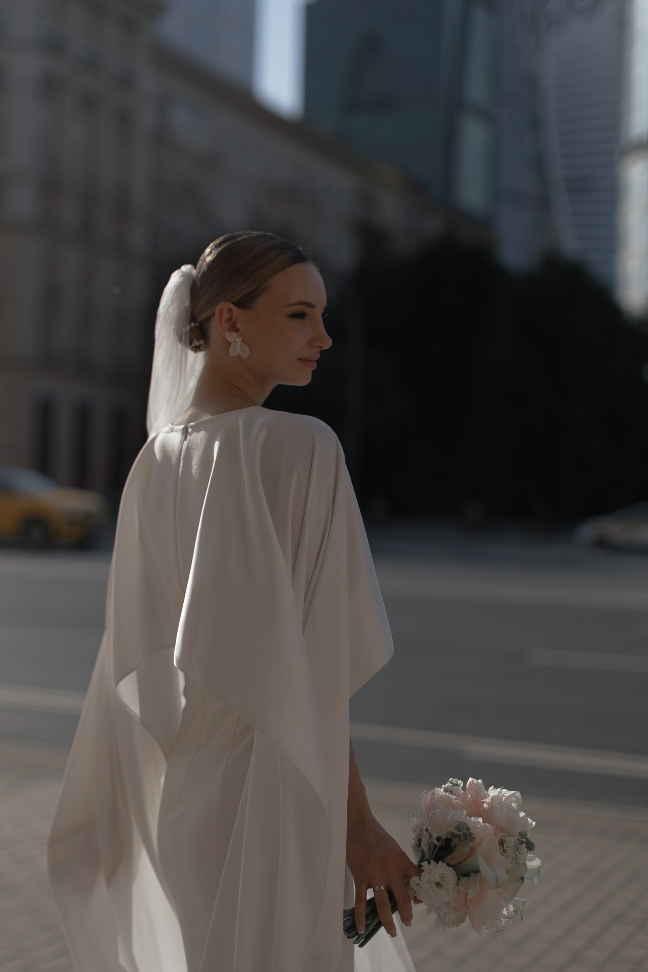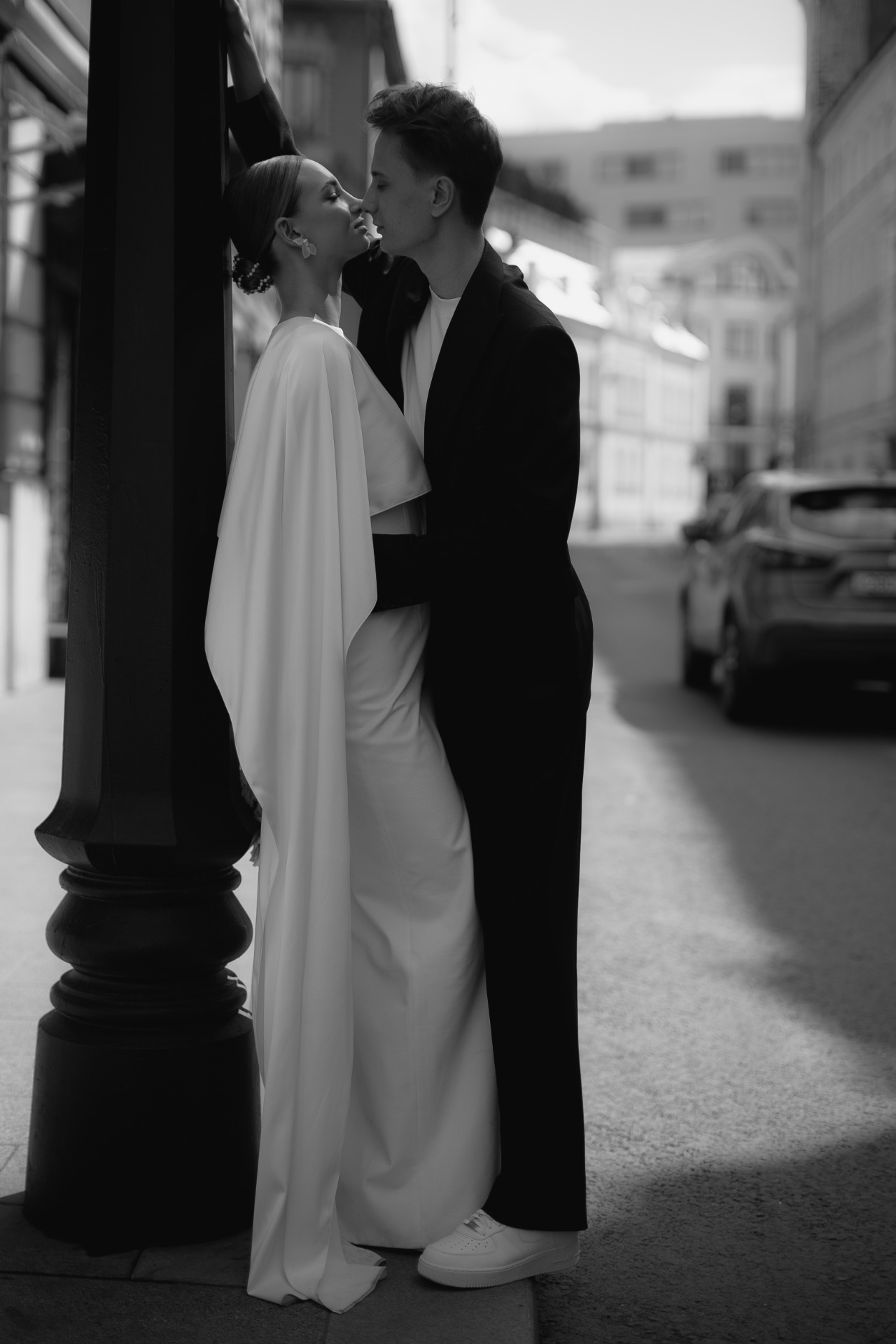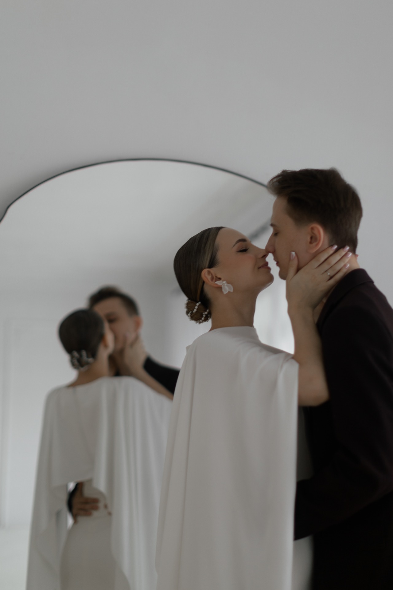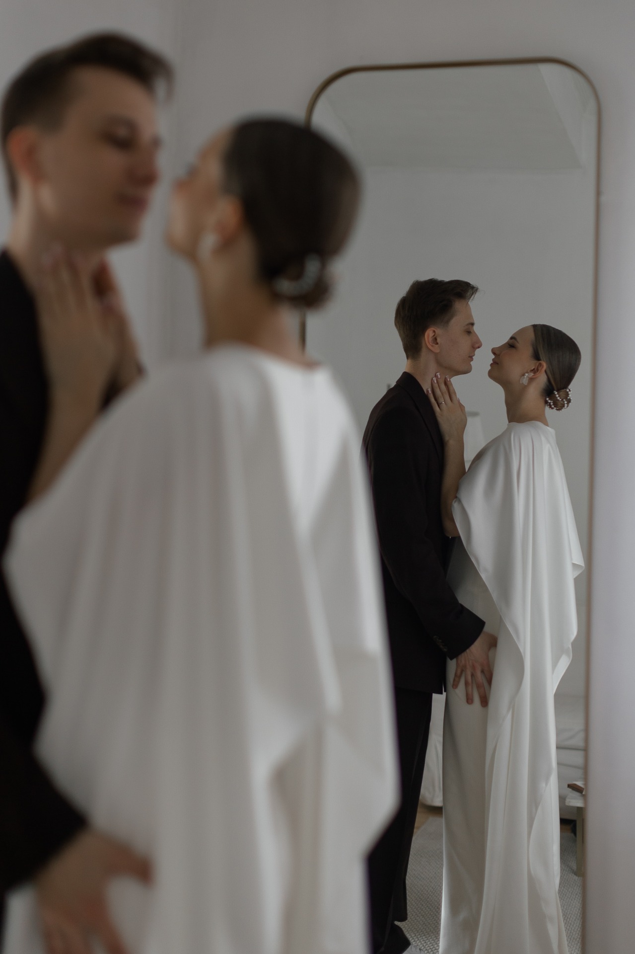 Наш свадебный день получился невероятно тёплым и гармоничным. Утром мы провели фотосессию: сначала в зале, где царила особая атмосфера ожидания, а потом на улице — там ощущалась лёгкость и непринуждённость.
