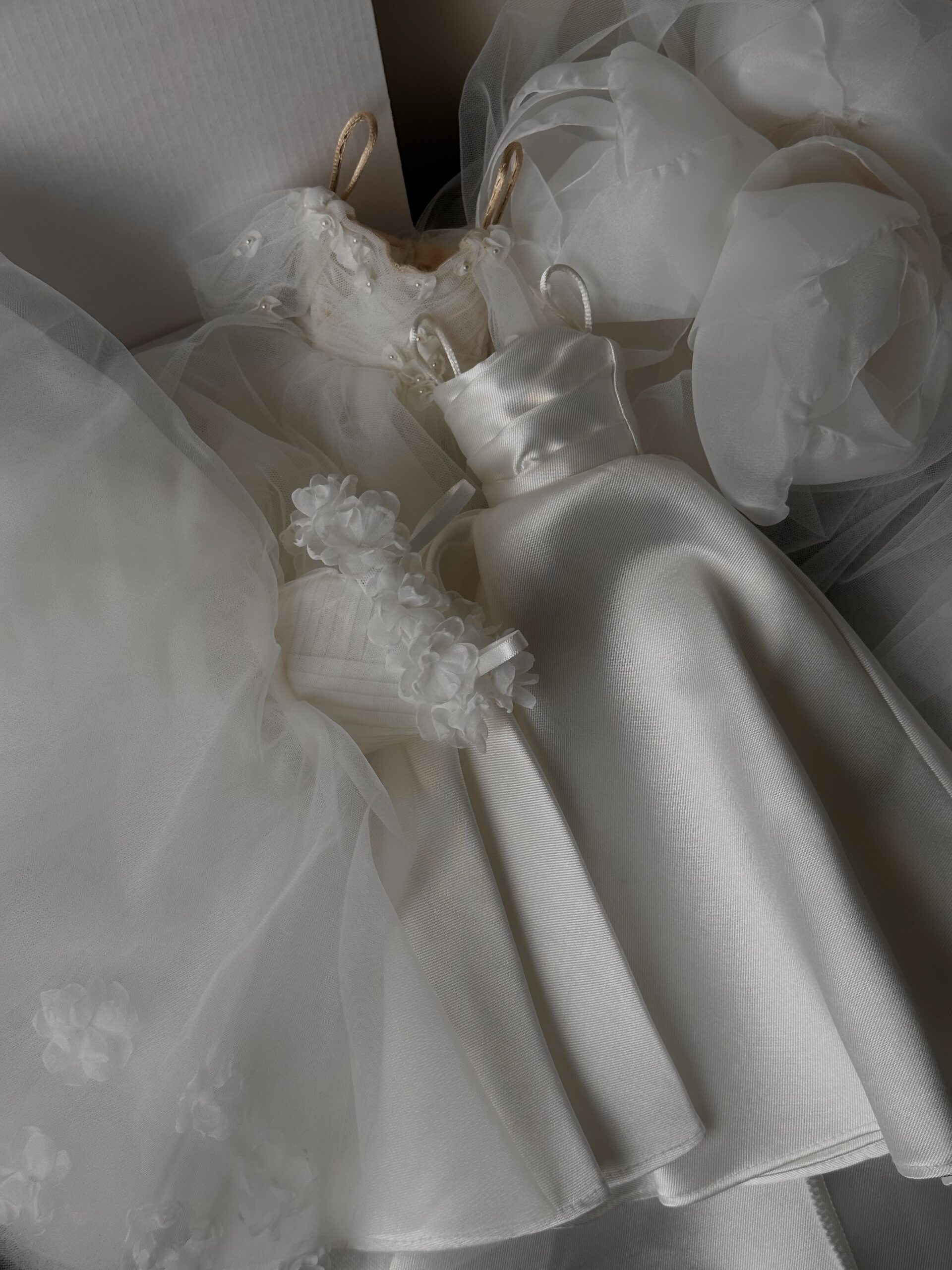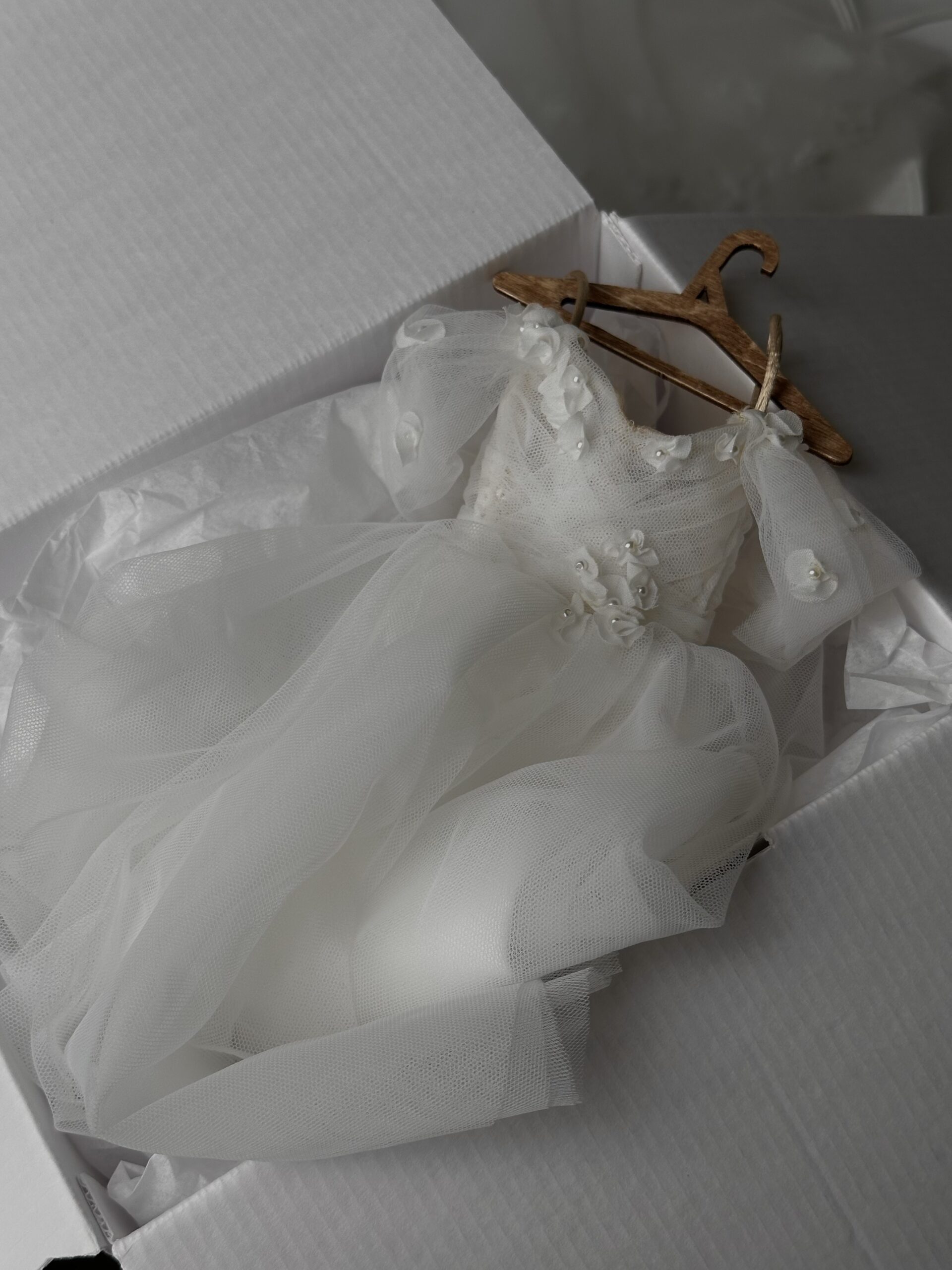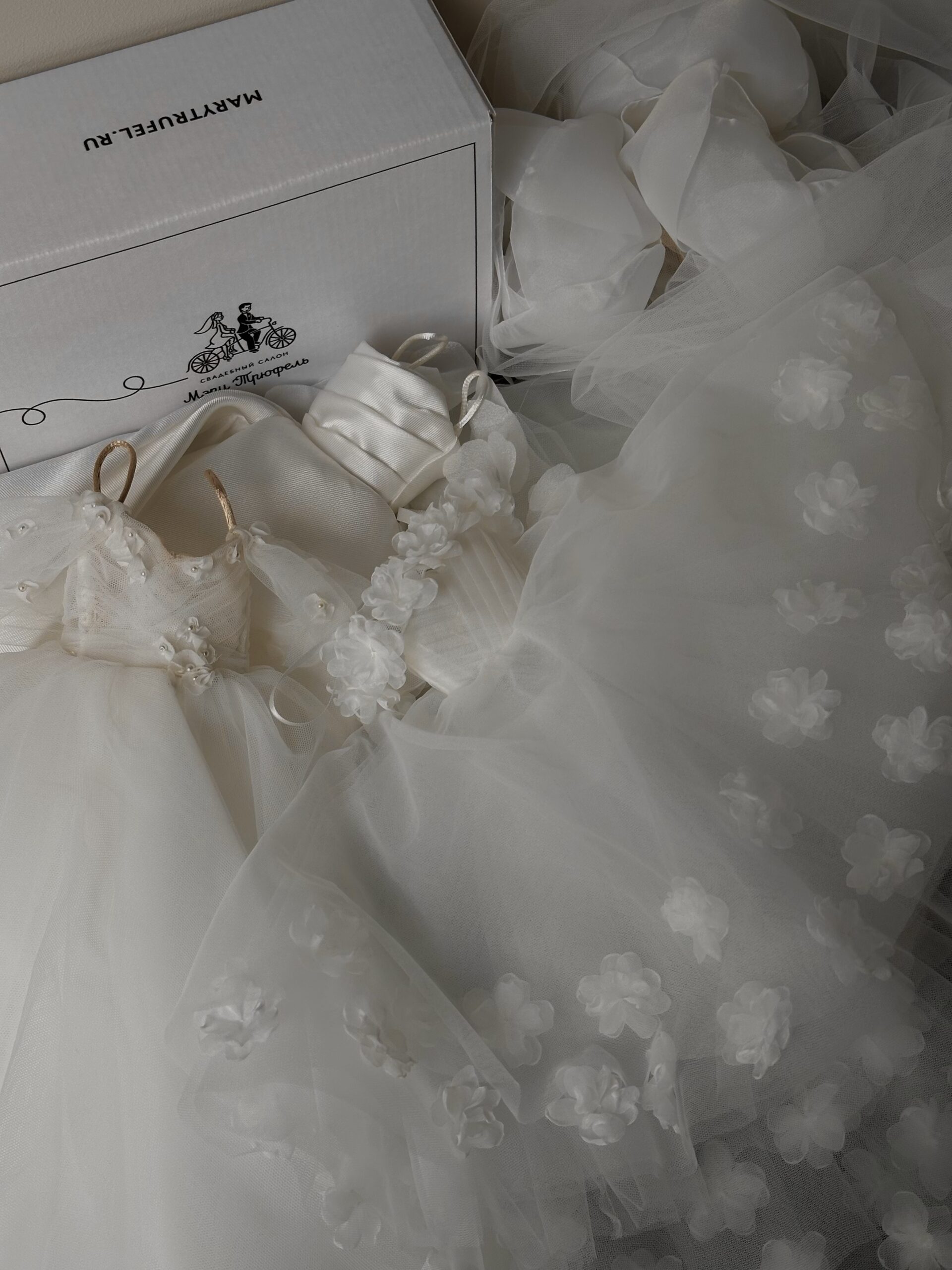 Специальный бокс с логотипом салона, внутри которого находилась частичка магии — точная копия свадебного платья, сшитая по настоящей модели!