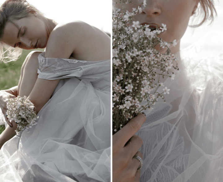 Свадебное платье было в пепельно-голубом цвете. Этот цвет платья помог сделать образ невесты более глубоким и интересным. Мы хотели сделать максимально романтичную атмосферу, поэтому стиль невесты должен был сочетаться с выбранной локацией. Невеста ассоциировалась у нас с морской пеной или нимфой, вышедшей с просторов океана.
