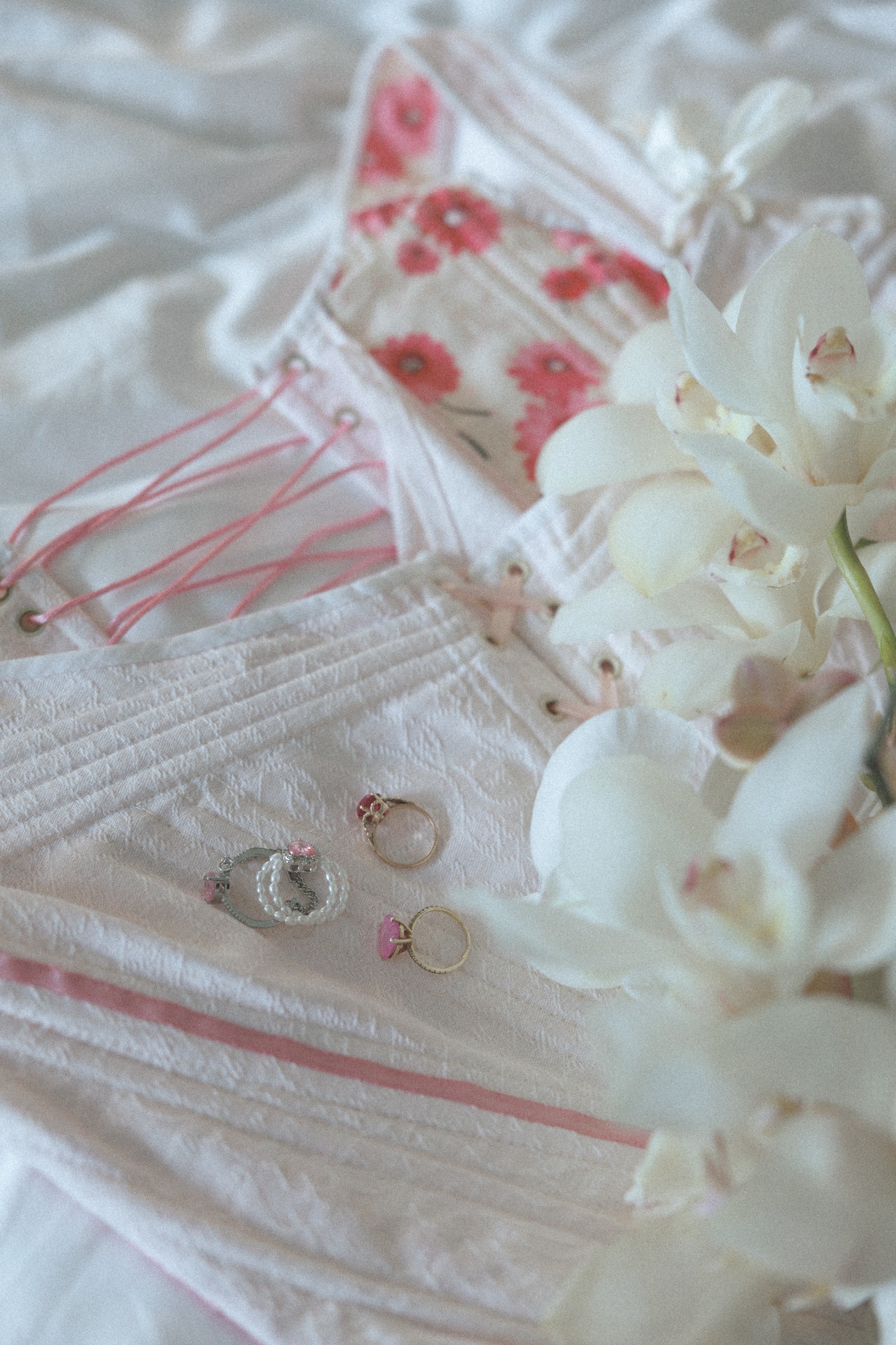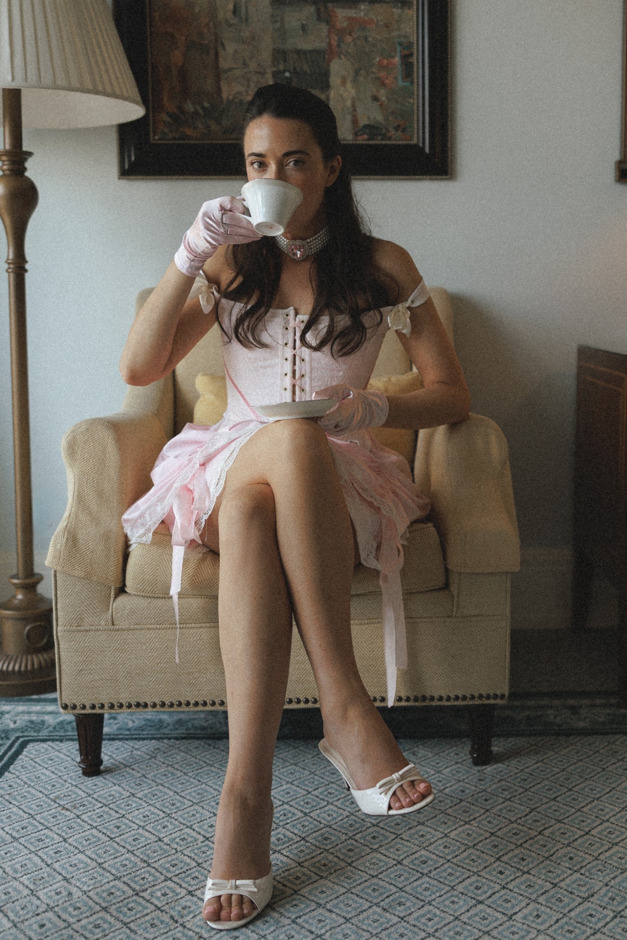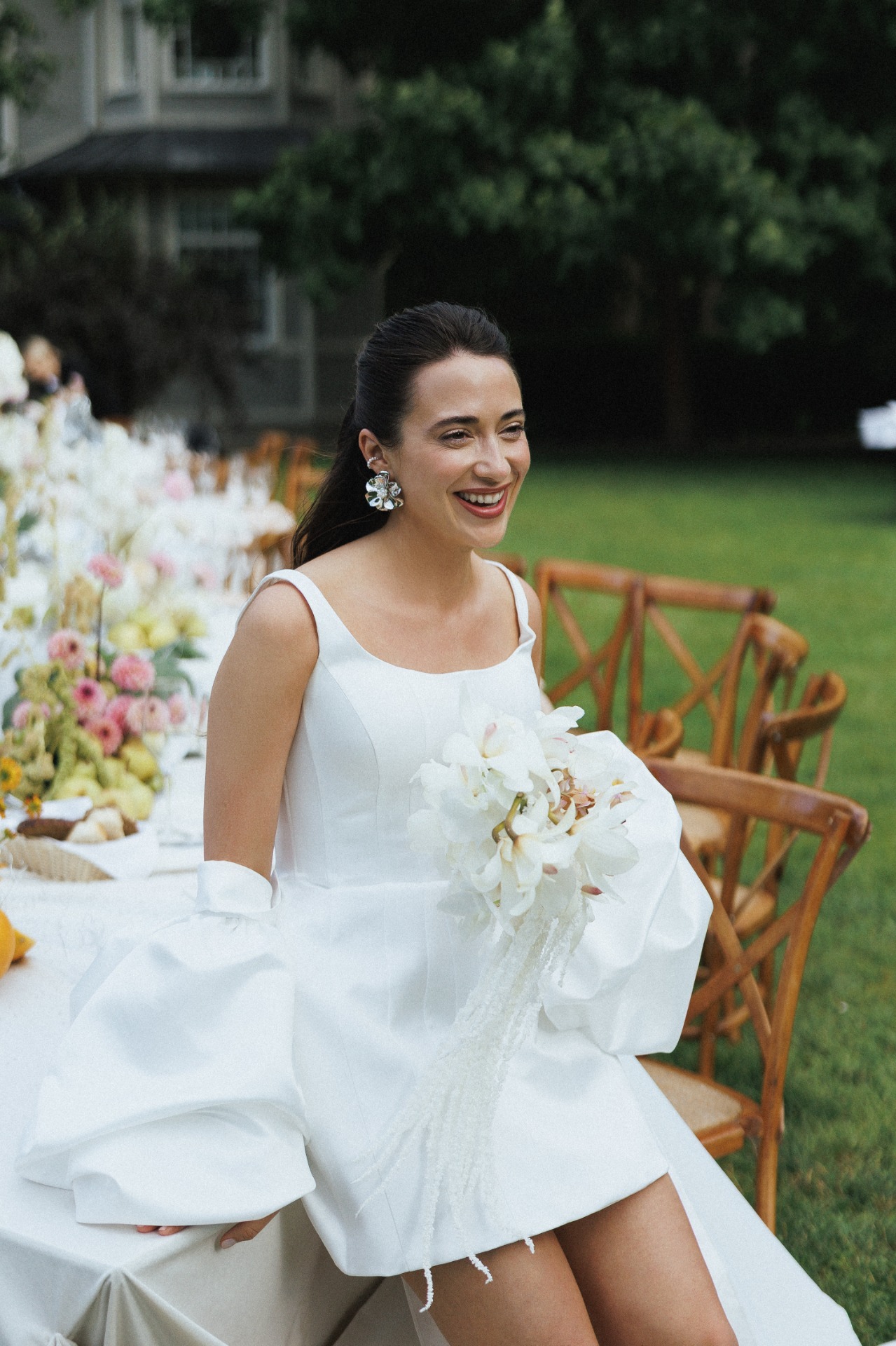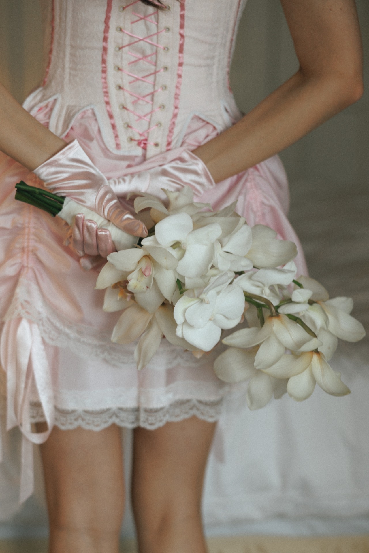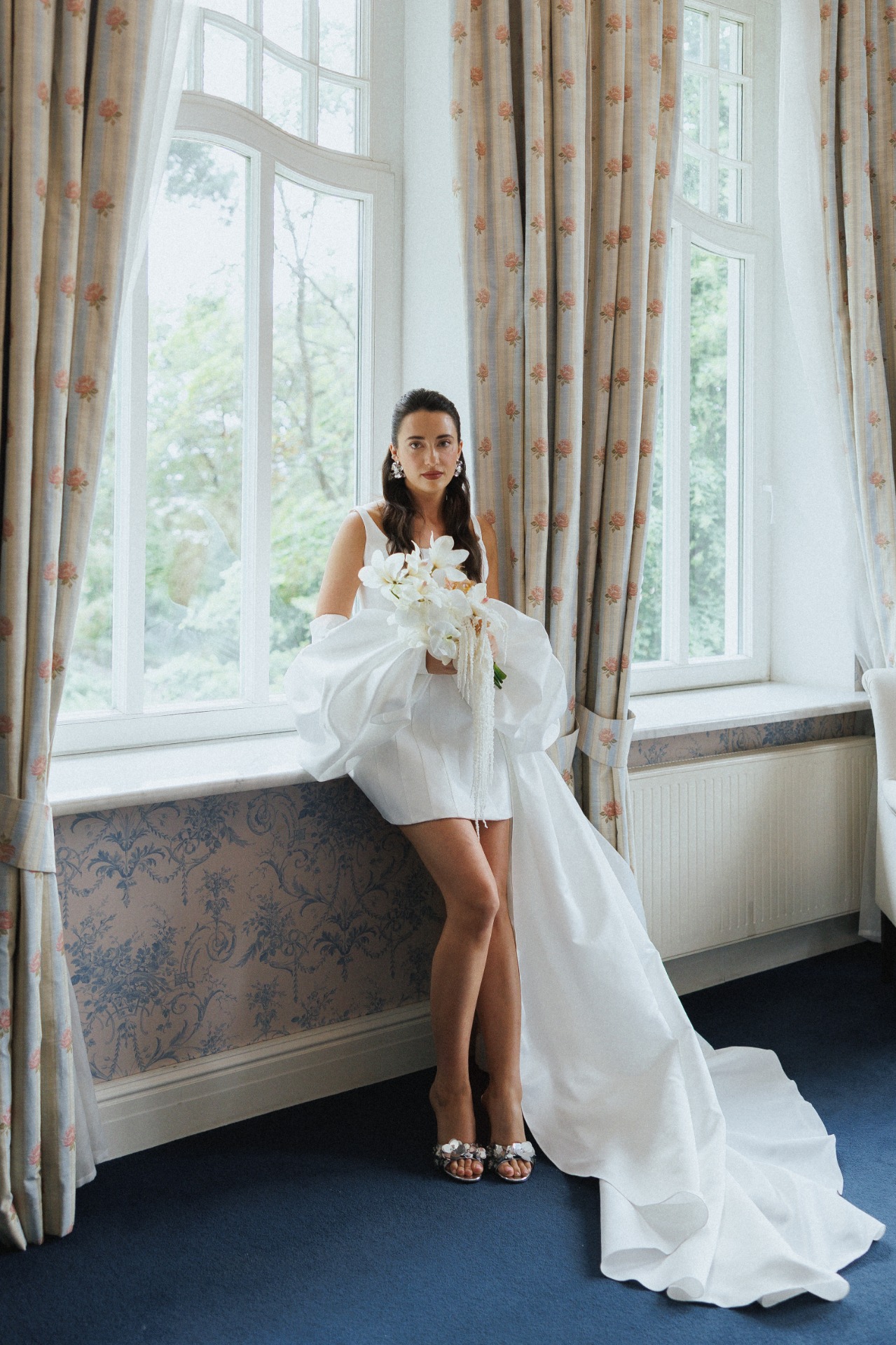 Мой первый наряд состоял из короткого платья, накидки-мантии и банта, который позже я использовала на вечер. Всё это создали для меня на заказ в Sovanna Atelier. Чтобы поддержать сказочную тематику, я выбрала металлические мюли MACH & MACH с цветами, похожими на те, что использовались в декоре, и серьги от Poison Drop.