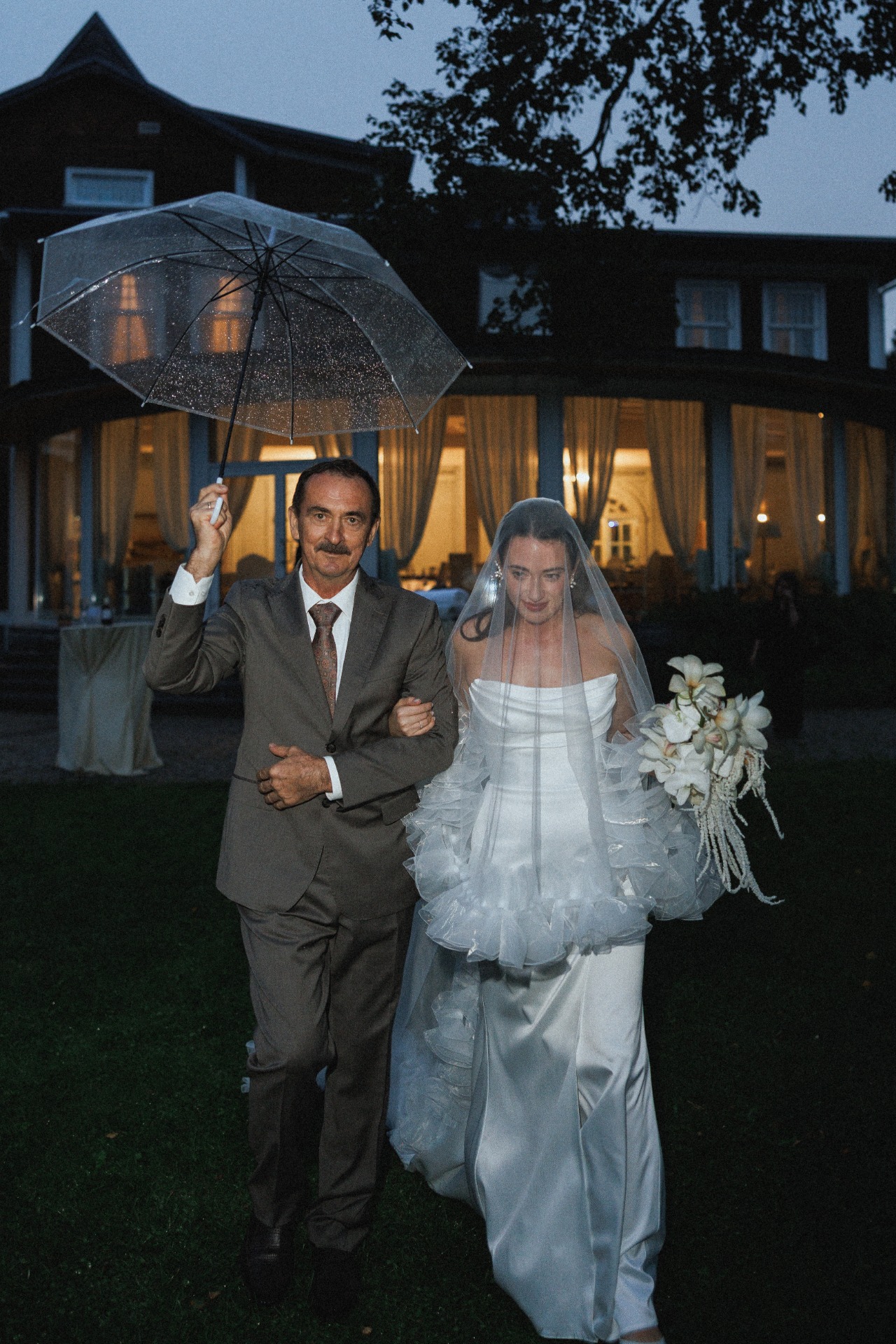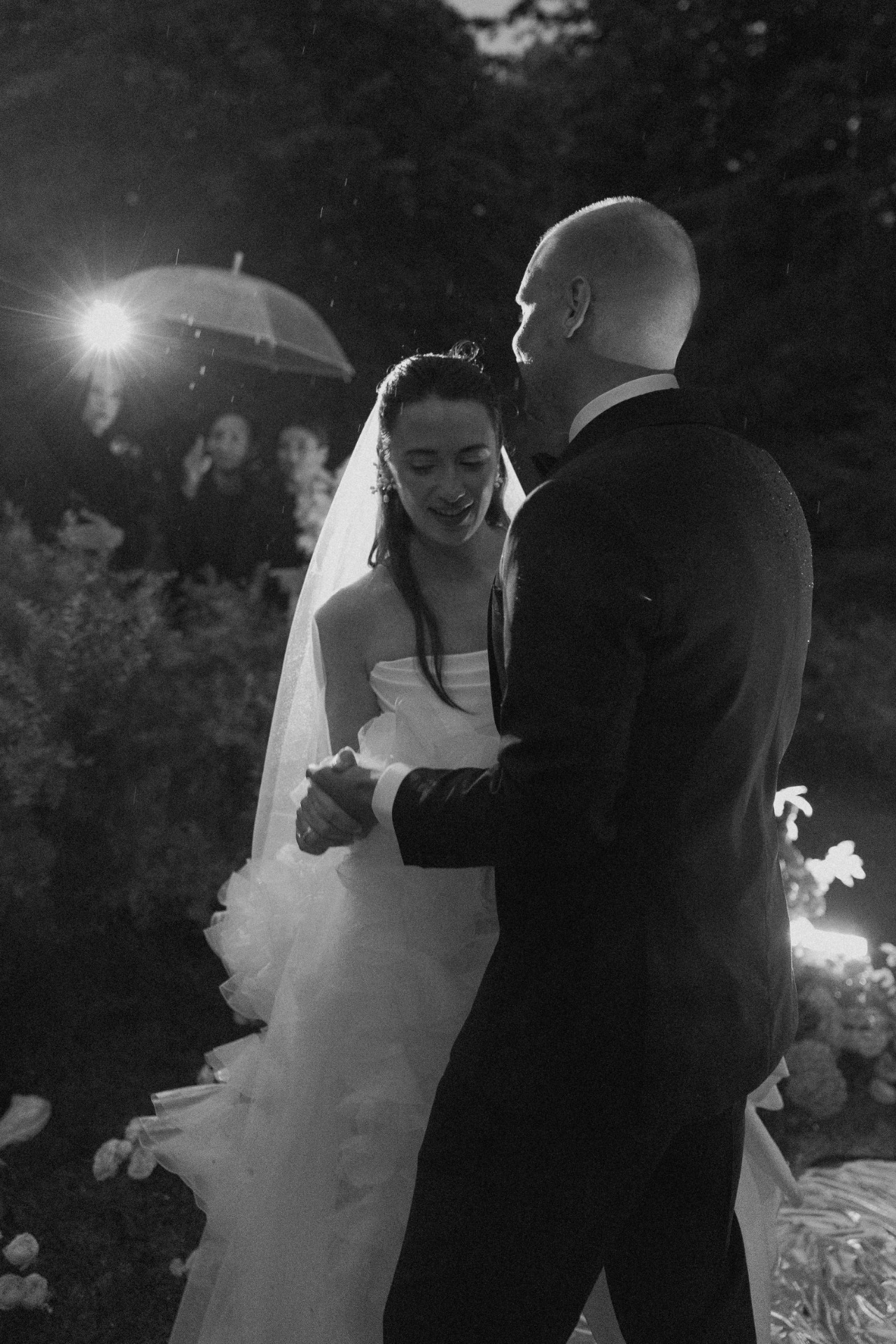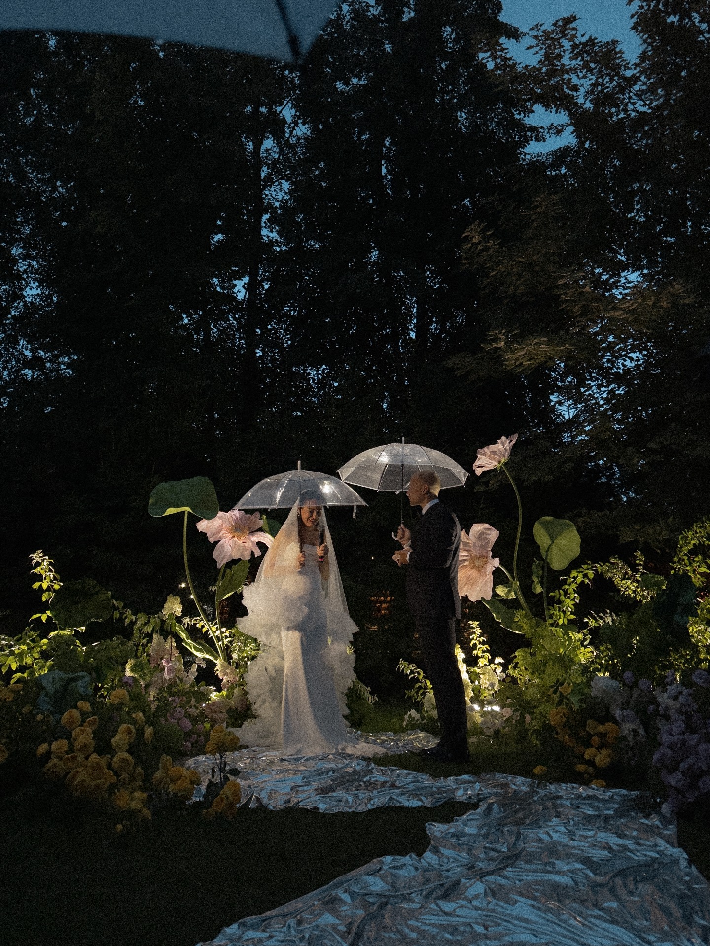 Погода, конечно, решила добавить немного драматизма в наш праздник и наградила нас сильным дождём. Организаторам буквально пришлось бороться за возможность провести церемонию на улице. И всё же мы рискнули. Дождь, туман, блестящая трава — всё это придало сказочности, будто мы и правда оказались в зачарованном саду.