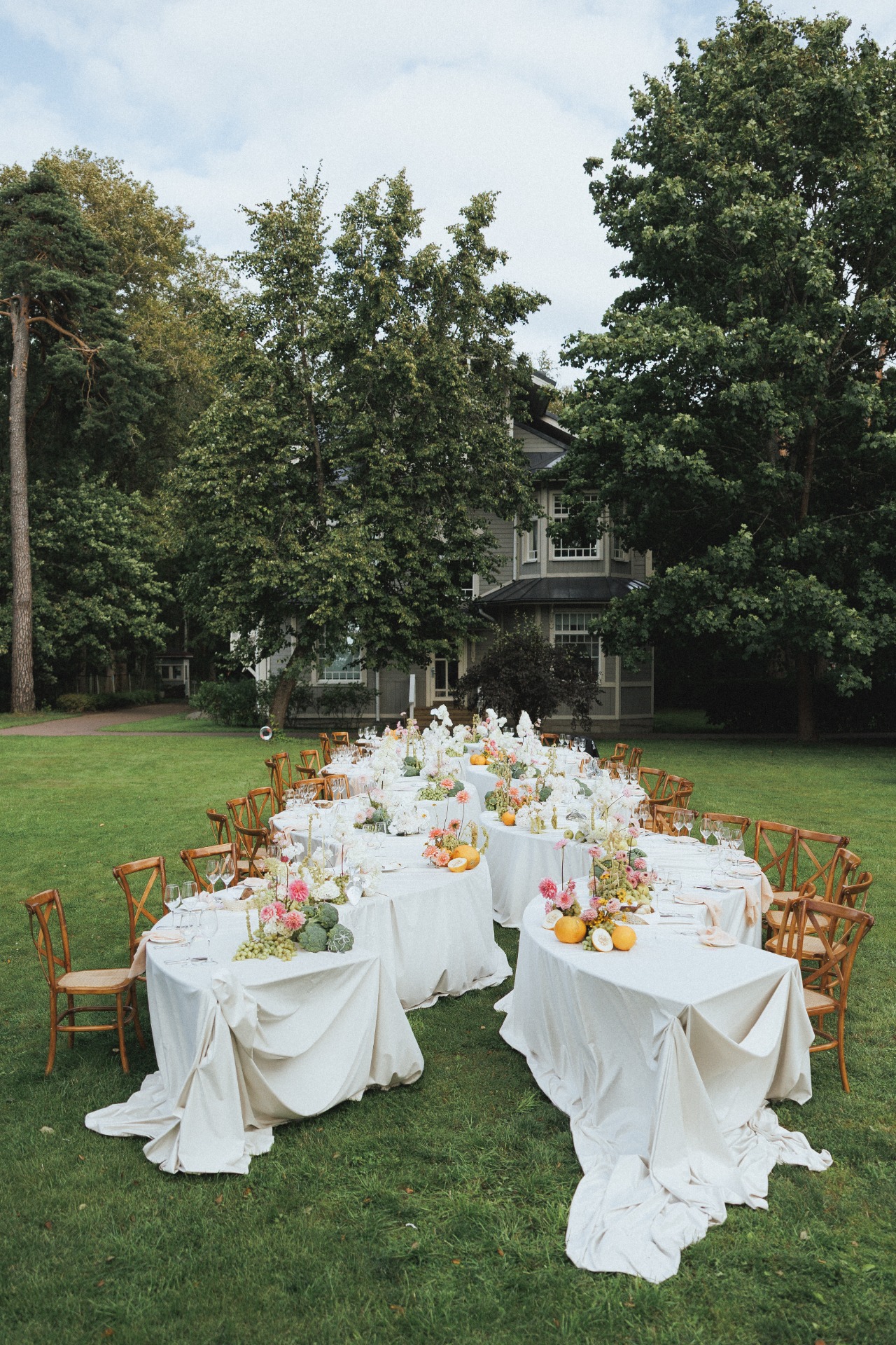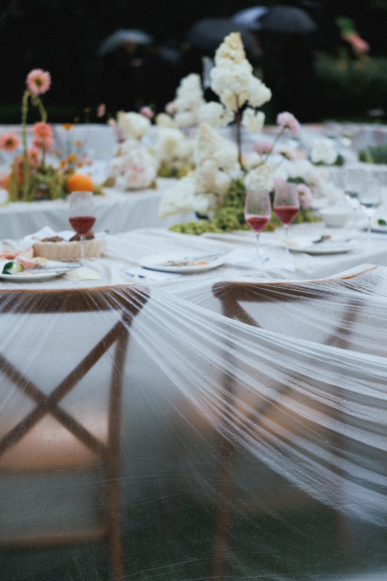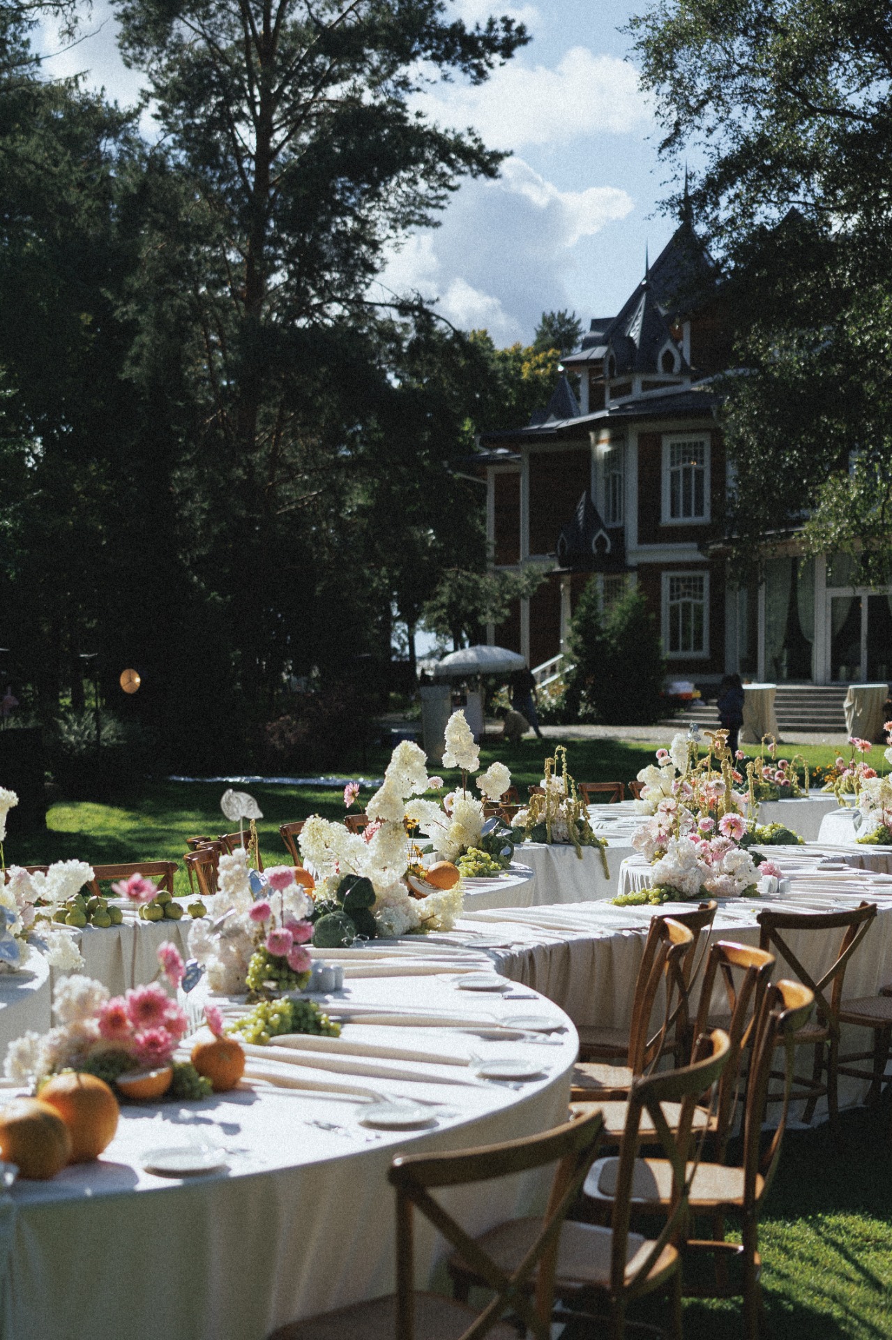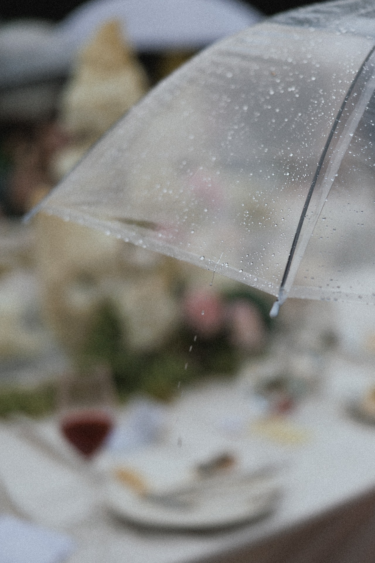 Погода, конечно, решила добавить немного драматизма в наш праздник и наградила нас сильным дождём. Организаторам буквально пришлось бороться за возможность провести церемонию на улице. И всё же мы рискнули. Дождь, туман, блестящая трава — всё это придало сказочности, будто мы и правда оказались в зачарованном саду.
