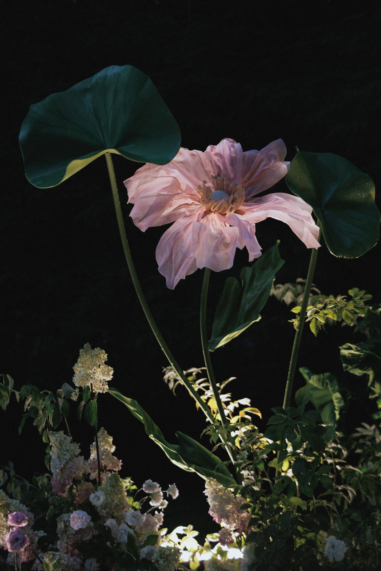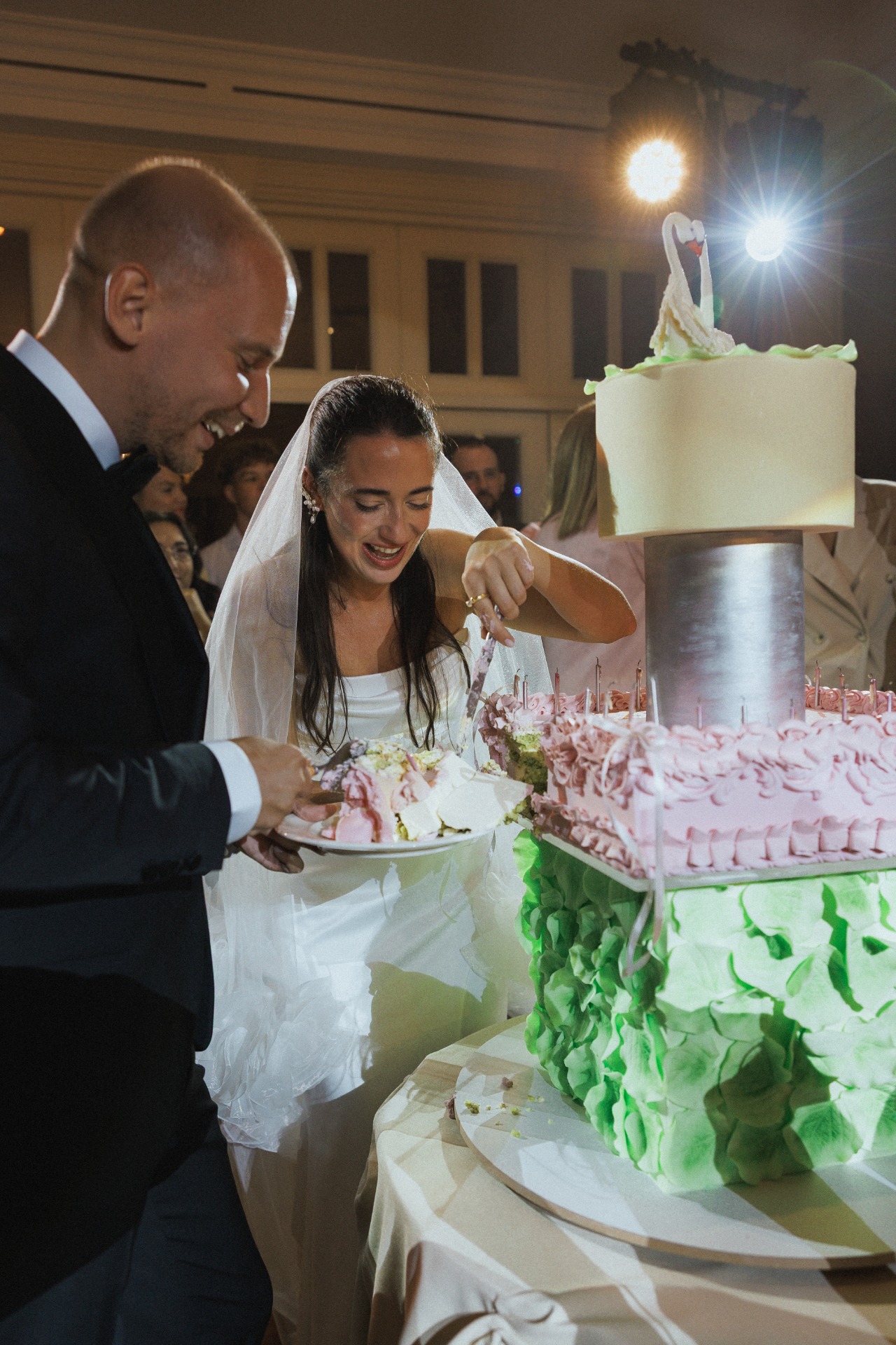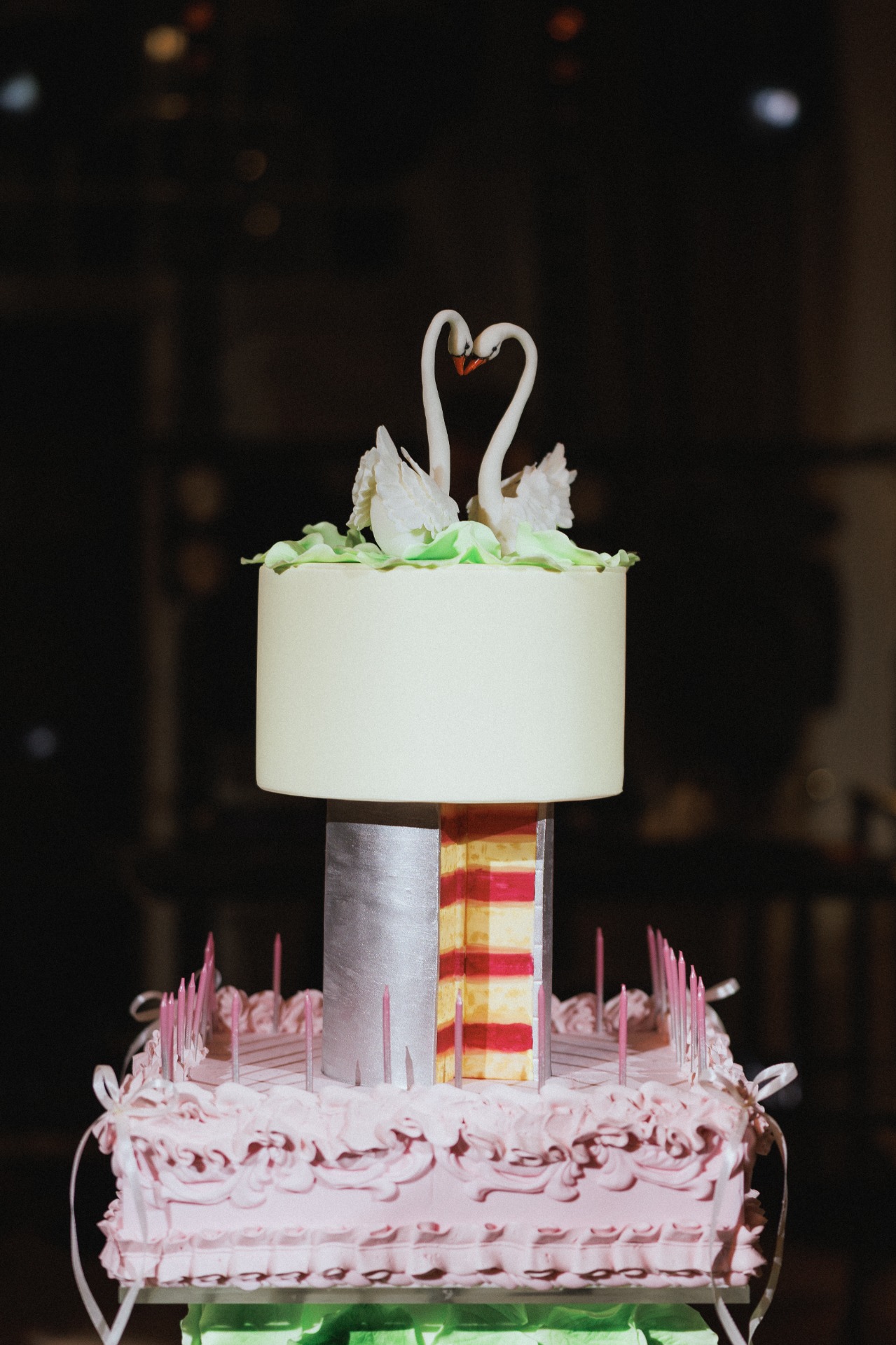 Мы добавили в декор гигантские цветы и кувшинки, которые к вечеру начинали подсвечиваться, создавая ощущение волшебства. Торт стал отдельным «вау»-элементом нашего торжества — многослойный, с гиперболизированными элементами декора и парой забавных лебедей на верхушке.