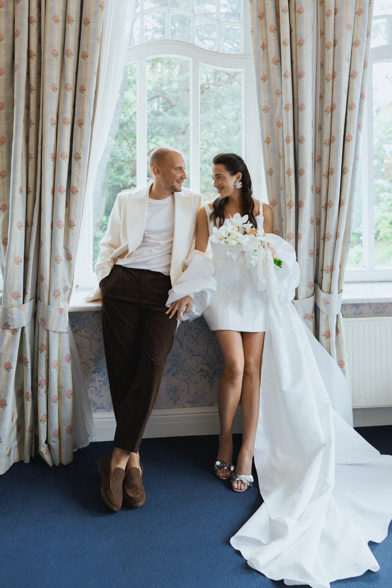 Вечером я переоделась в лаконичное платье, специально подобранное под мою сумасшедшую фату. Этот образ был более классическим и торжественным — именно таким, каким я его представляла. Дополняли мой наряд классические лодочки.
