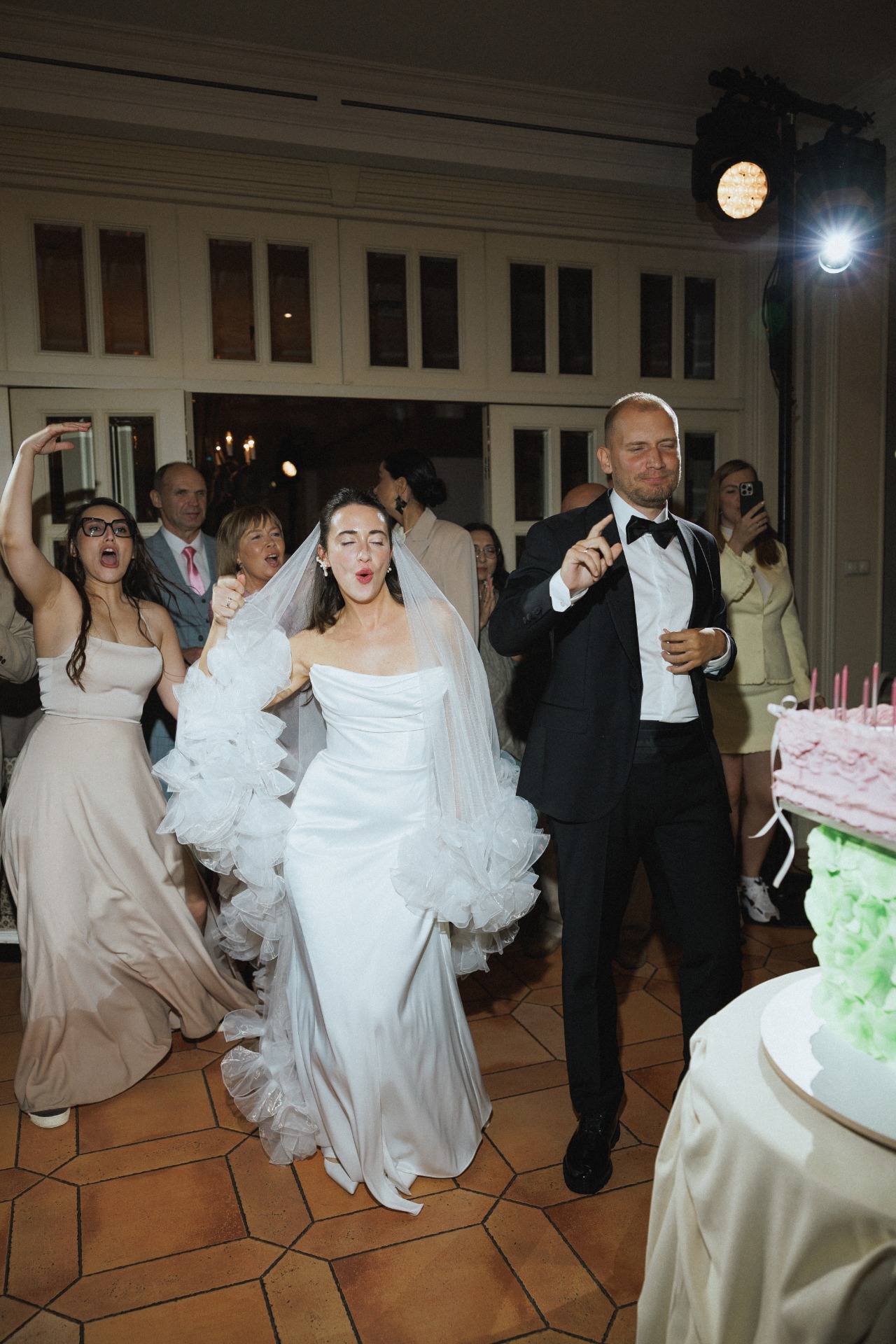 Накануне мы устроили rehearsal dinner — арендовали большой теплоход, чтобы собрать всех гостей на предпраздничный ужин. Мы катались по Неве, ели пиццу, пили вино, танцевали и любовались городом. Нам хотелось, чтобы все расслабились и почувствовали себя туристами.