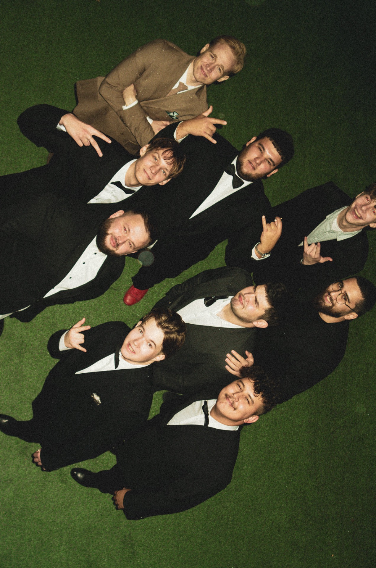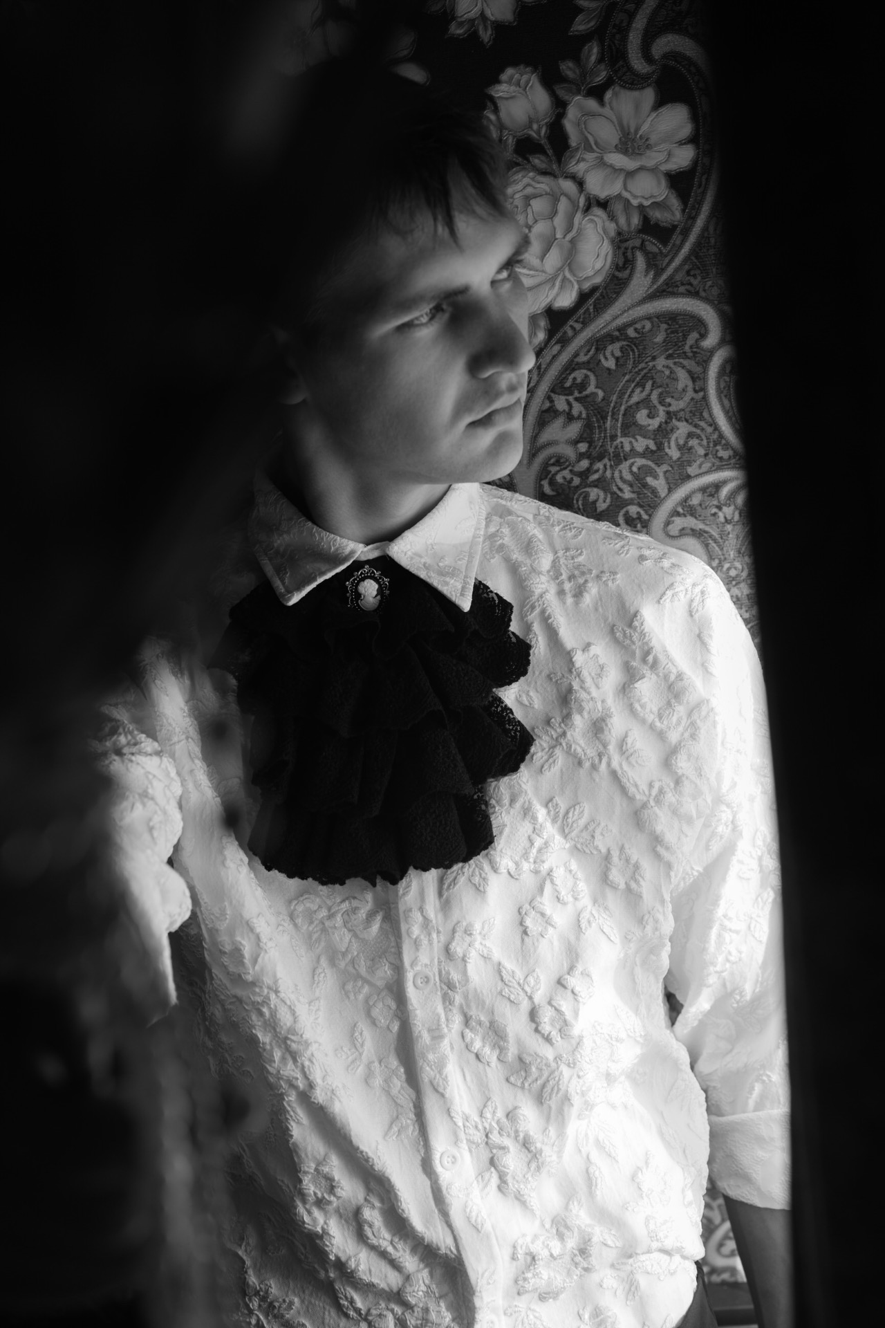 Для образа Кеши мы выбрали классический чёрный смокинг с жилеткой и атласным лацканом, чёрную бабочку и брошь-галстук с лентами, которые мы чередовали в течение вечера.