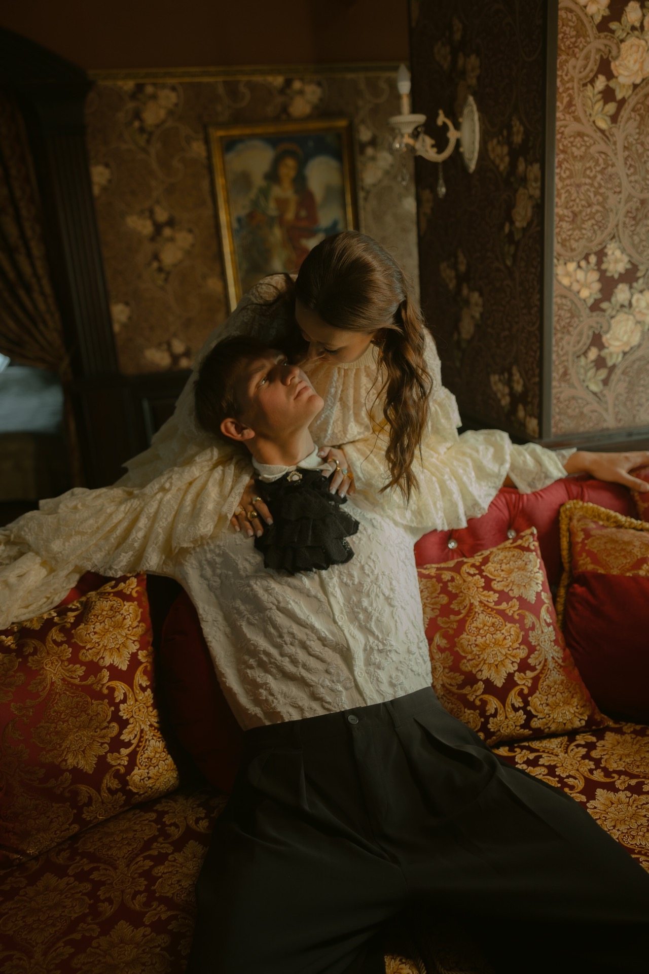 Кеша на утренней съёмке был в кружевной рубашке с широкими рукавами тёплого цвета, чёрном жабо с камнем, укороченных классических брюках и деталях в виде золотых колец.