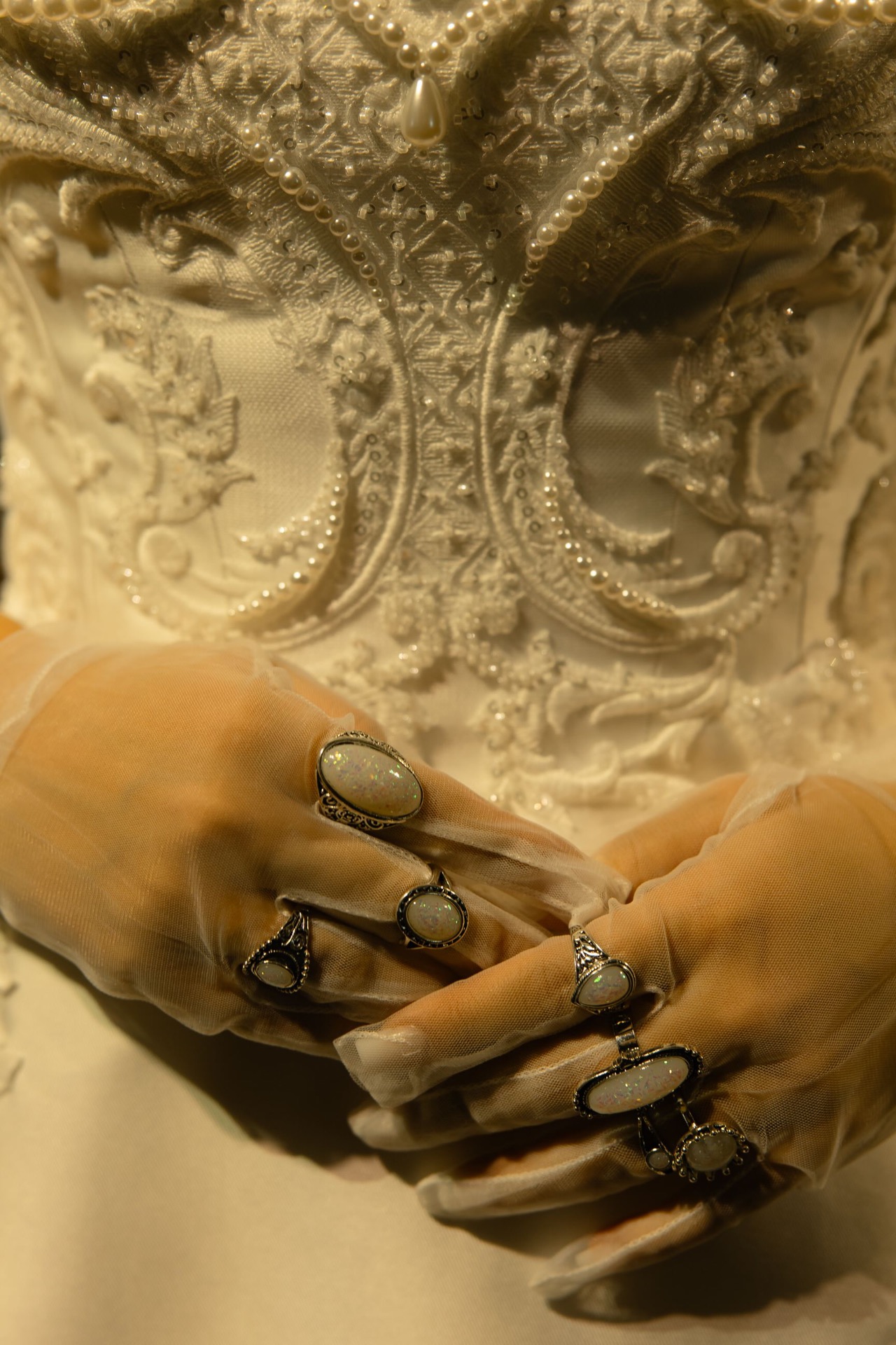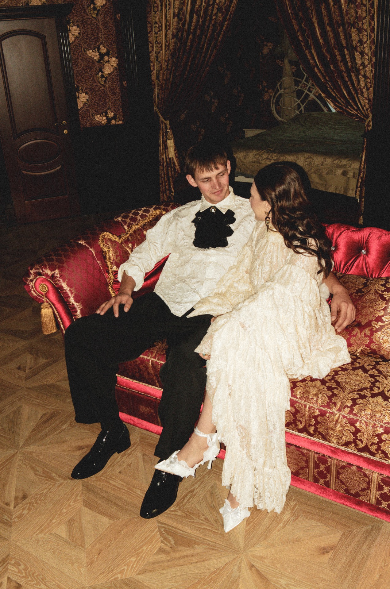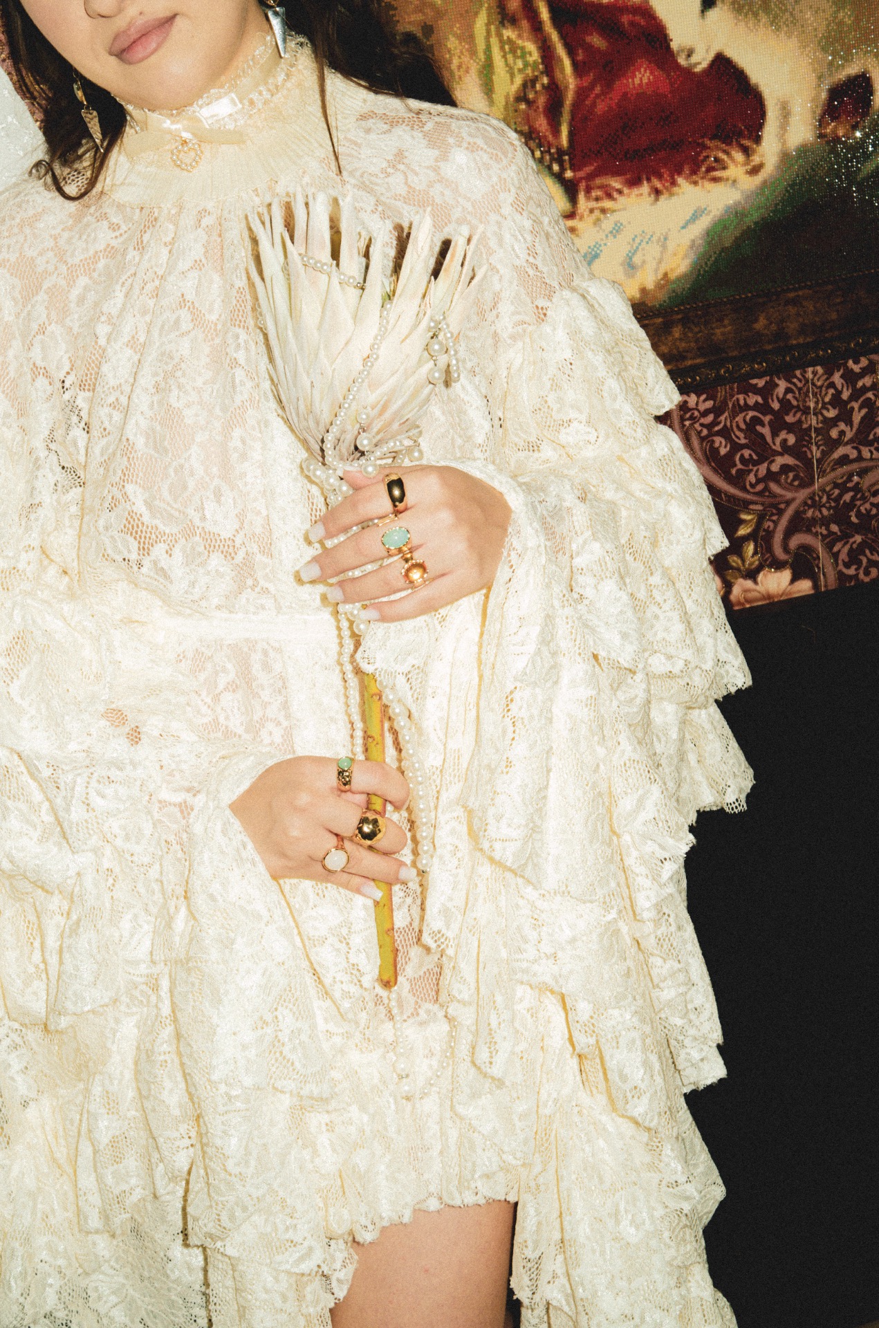 Первый образ — утренний: на мне было кружевное платье с длинными рукавами, покрытыми рюшами, несколько чокеров, украшения с крупными камнями и туфли, которые мы оформляли с командой за несколько дней до свадьбы. А в руках я держала волшебный цветок — протею.