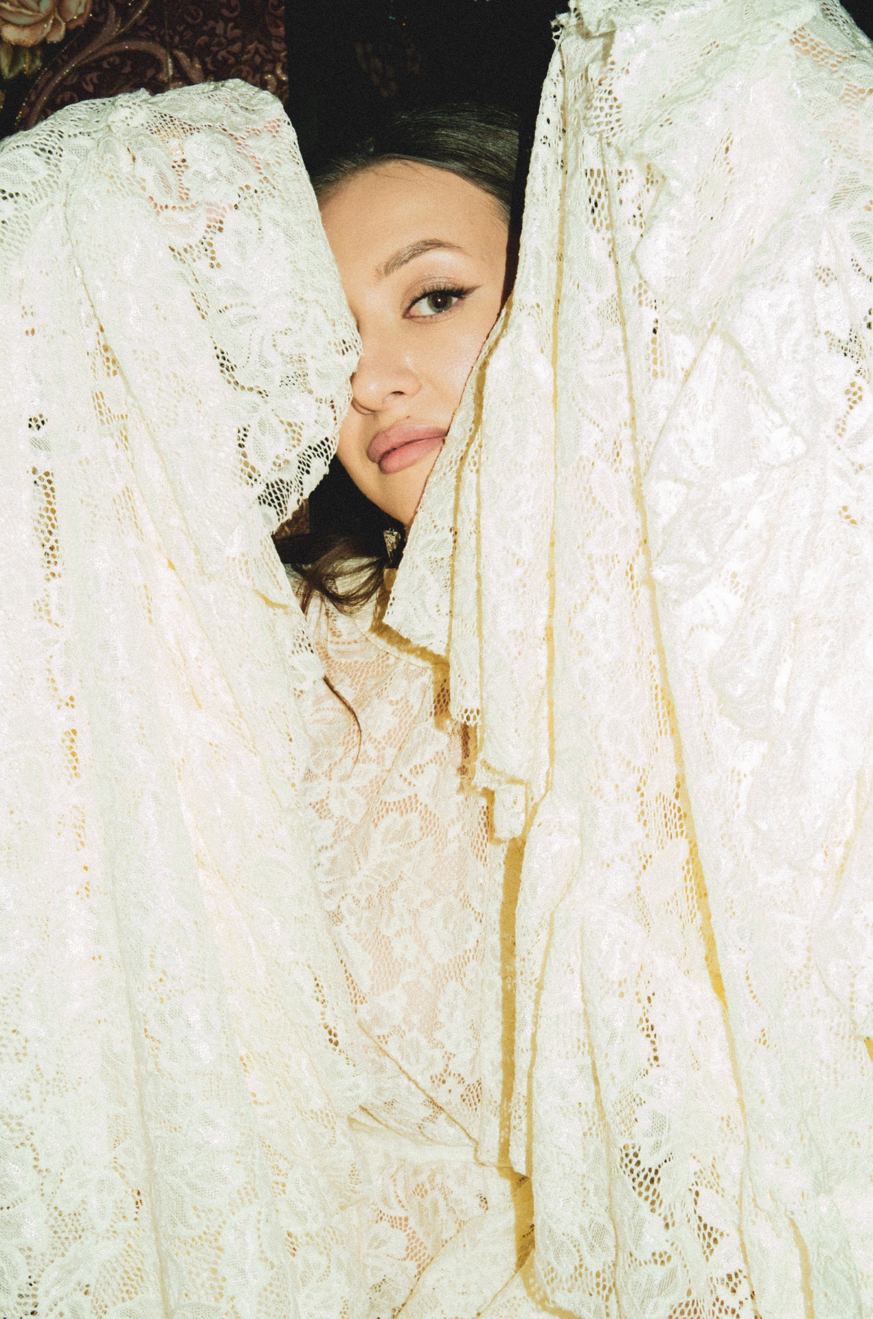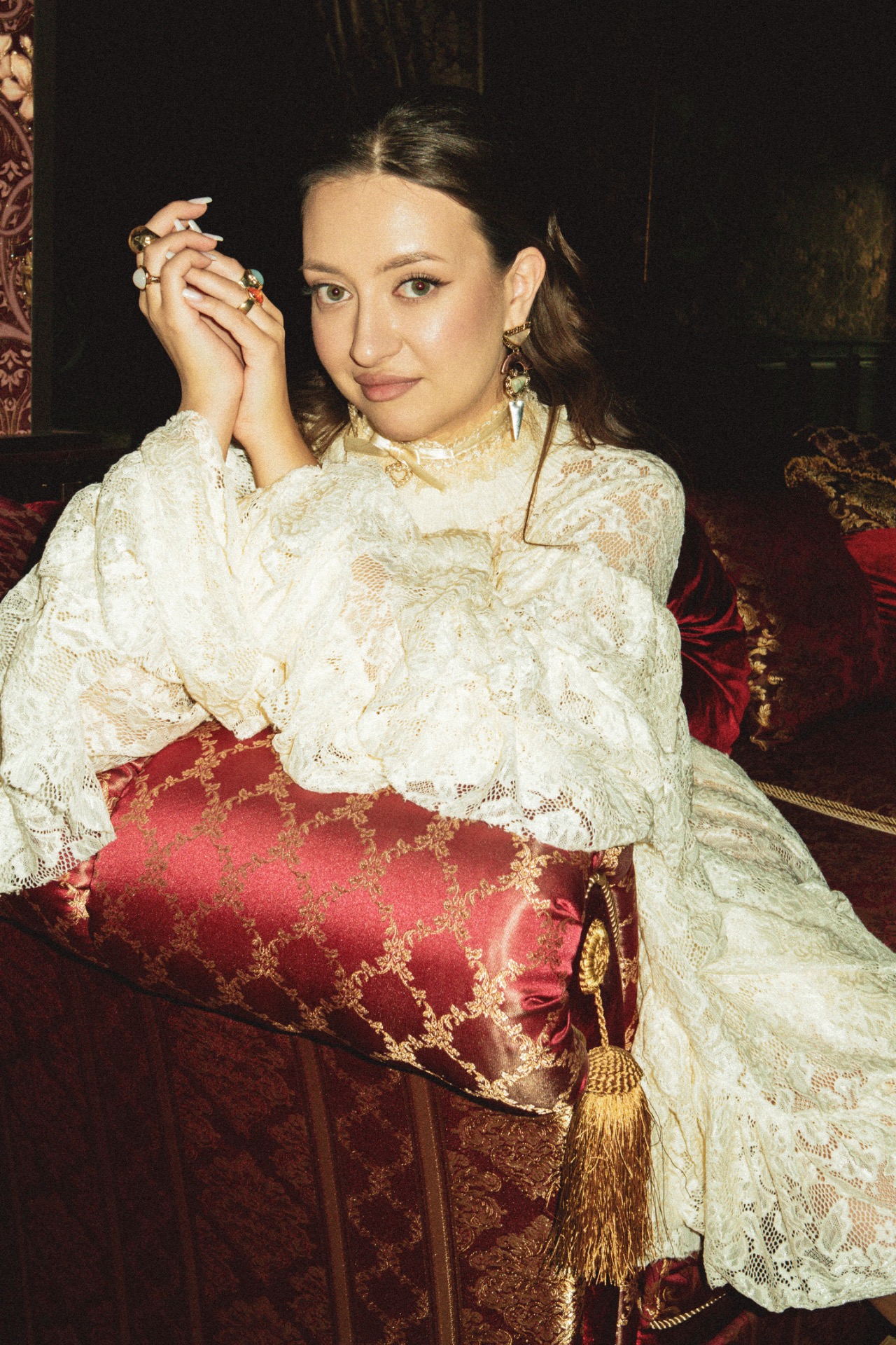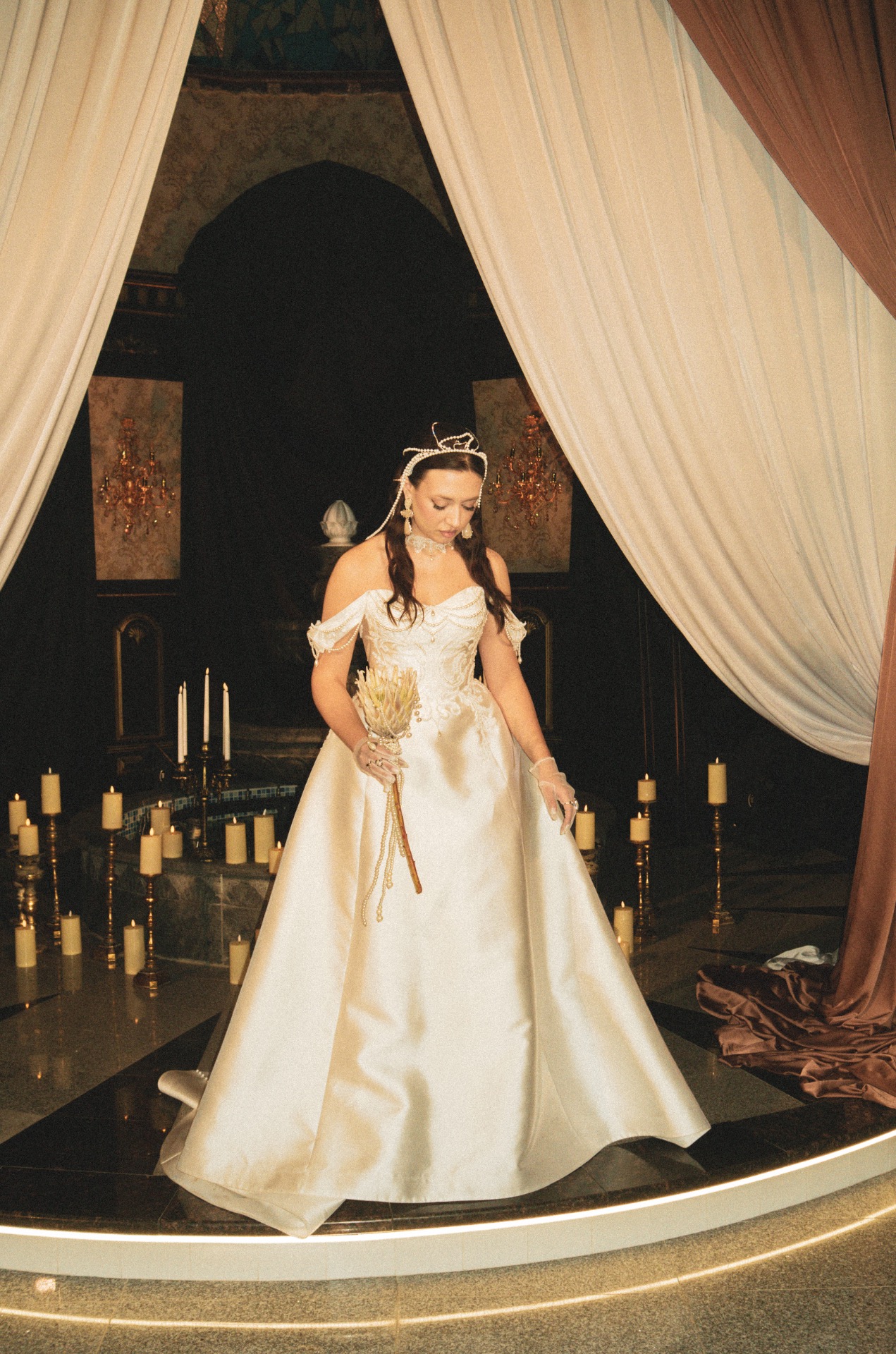 Первый образ — утренний: на мне было кружевное платье с длинными рукавами, покрытыми рюшами, несколько чокеров, украшения с крупными камнями и туфли, которые мы оформляли с командой за несколько дней до свадьбы. А в руках я держала волшебный цветок — протею.