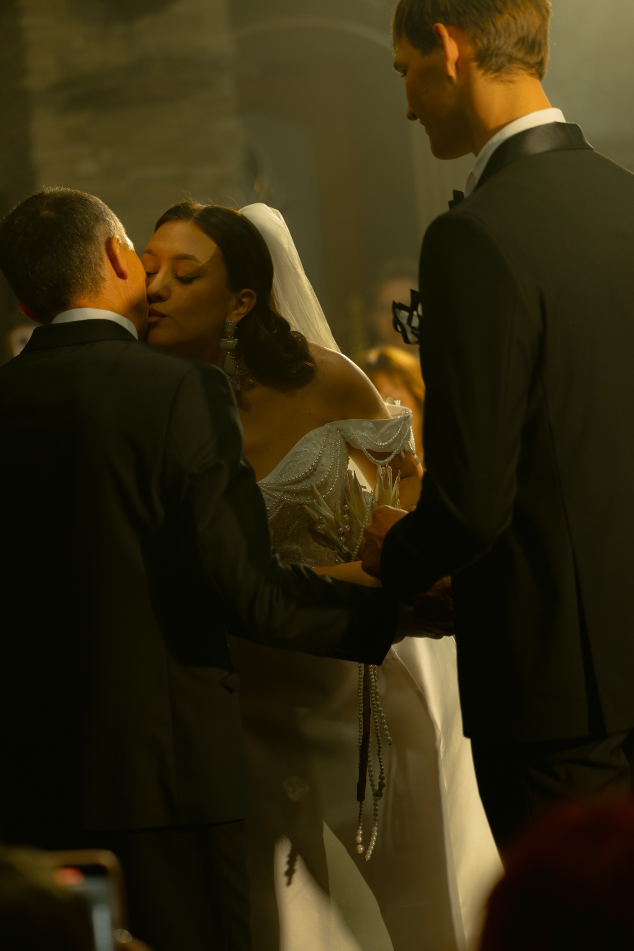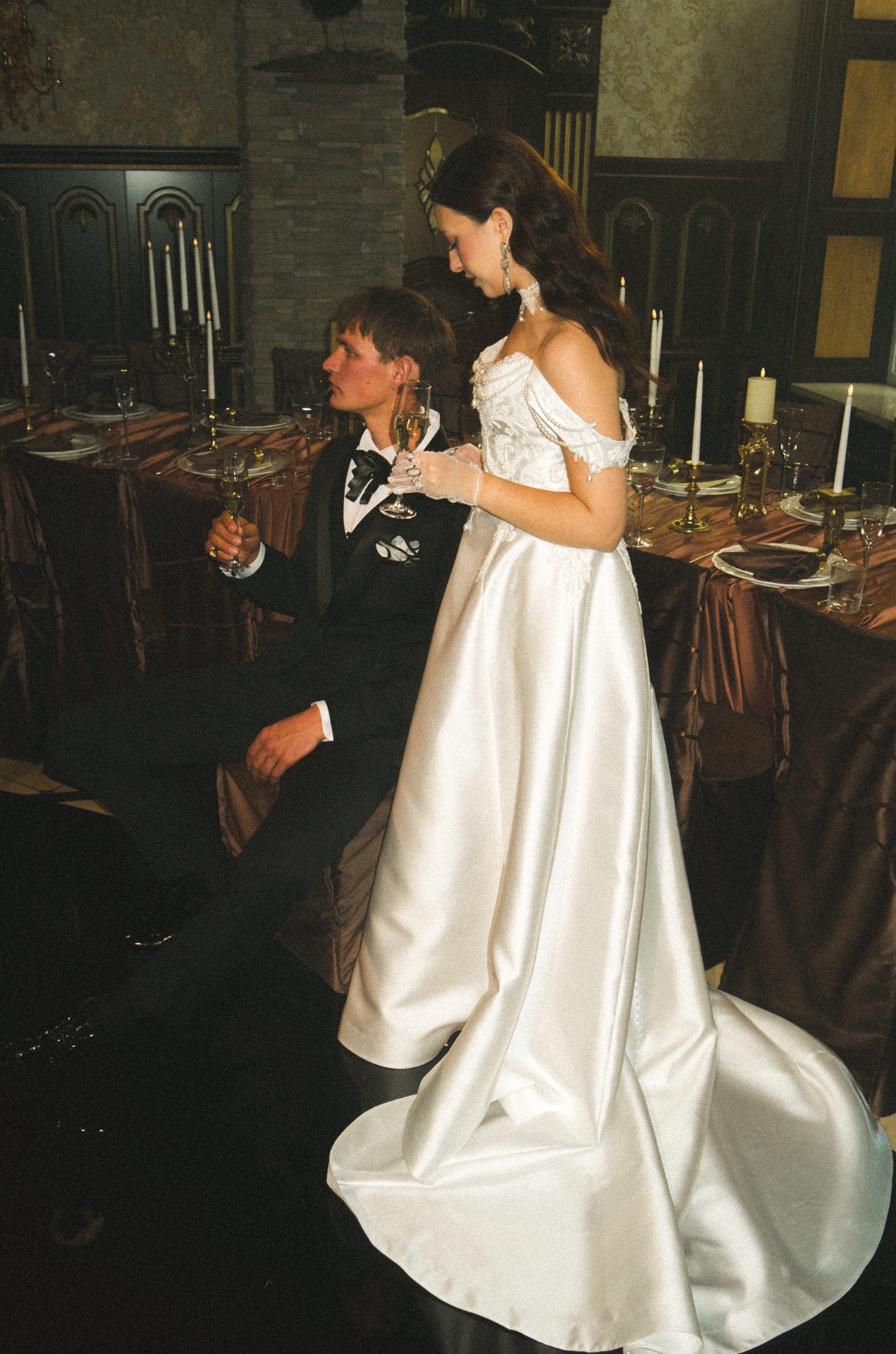 Моим основным нарядом стало плотное платье белого цвета со вставками в виде винтажных кружев. А объёмные детали на бёдрах придавали образу торжественности и отсылали к величественному стилю. Этот комплект завершала классическая фата в пол.