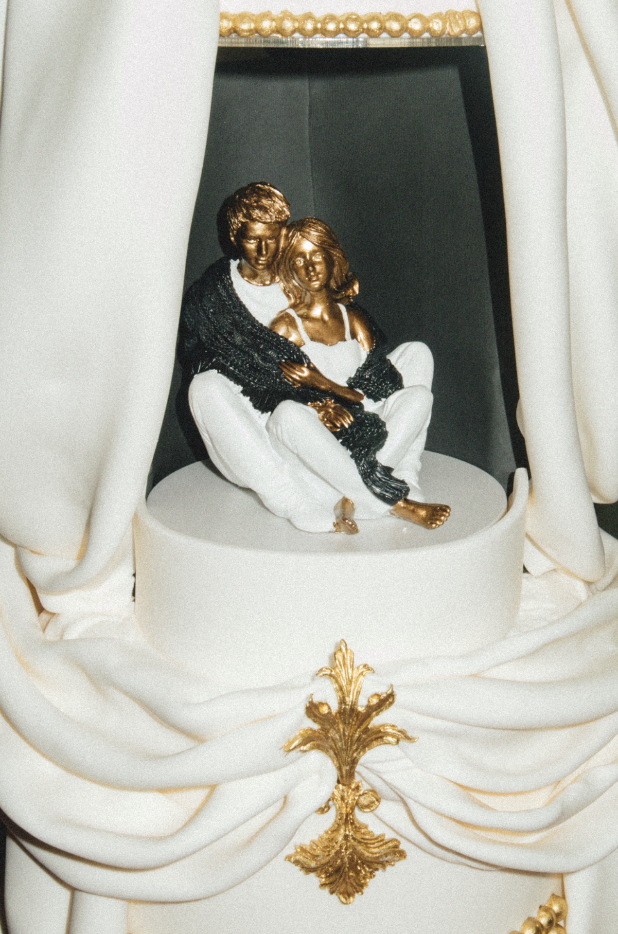 Далее был наш волшебный первый танец в дыму и торт, который получился отдельным произведением искусства. Он состоял из навеса сладких тканей, а под ними кружились, как в музыкальной шкатулке, наши фигурки.