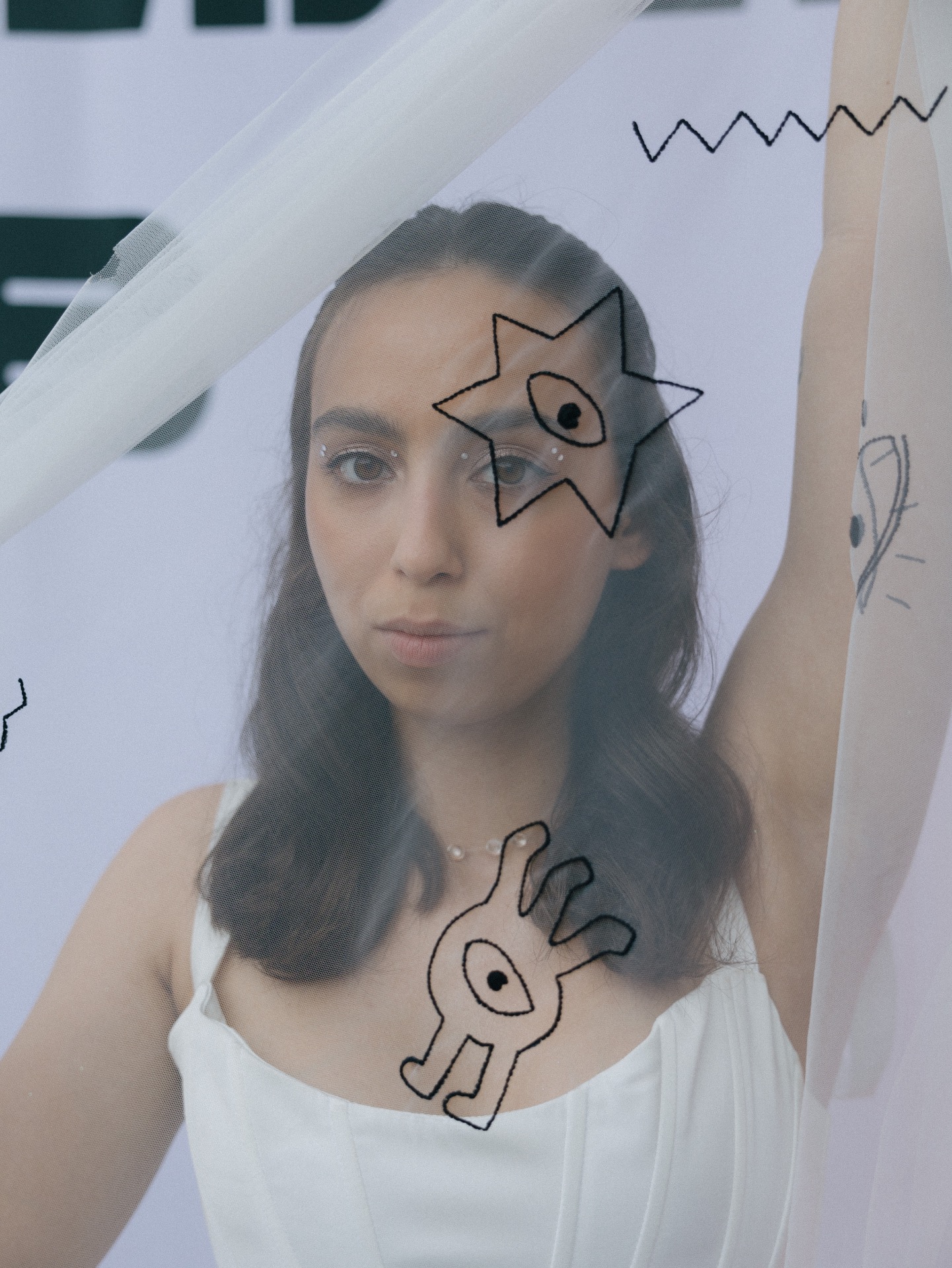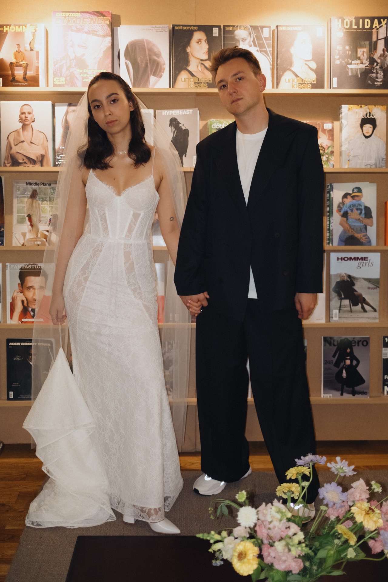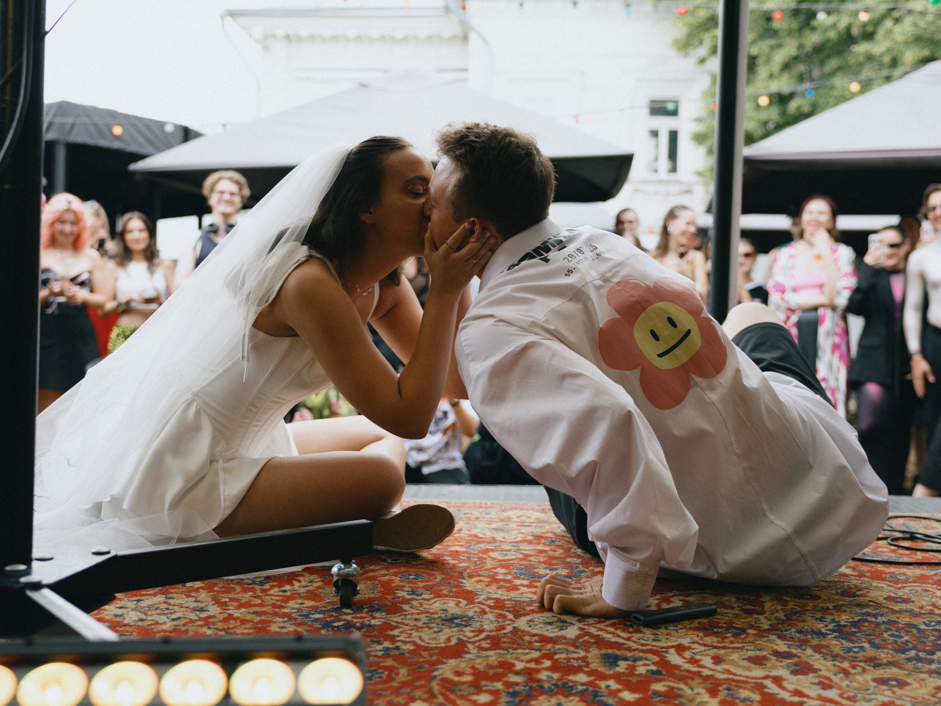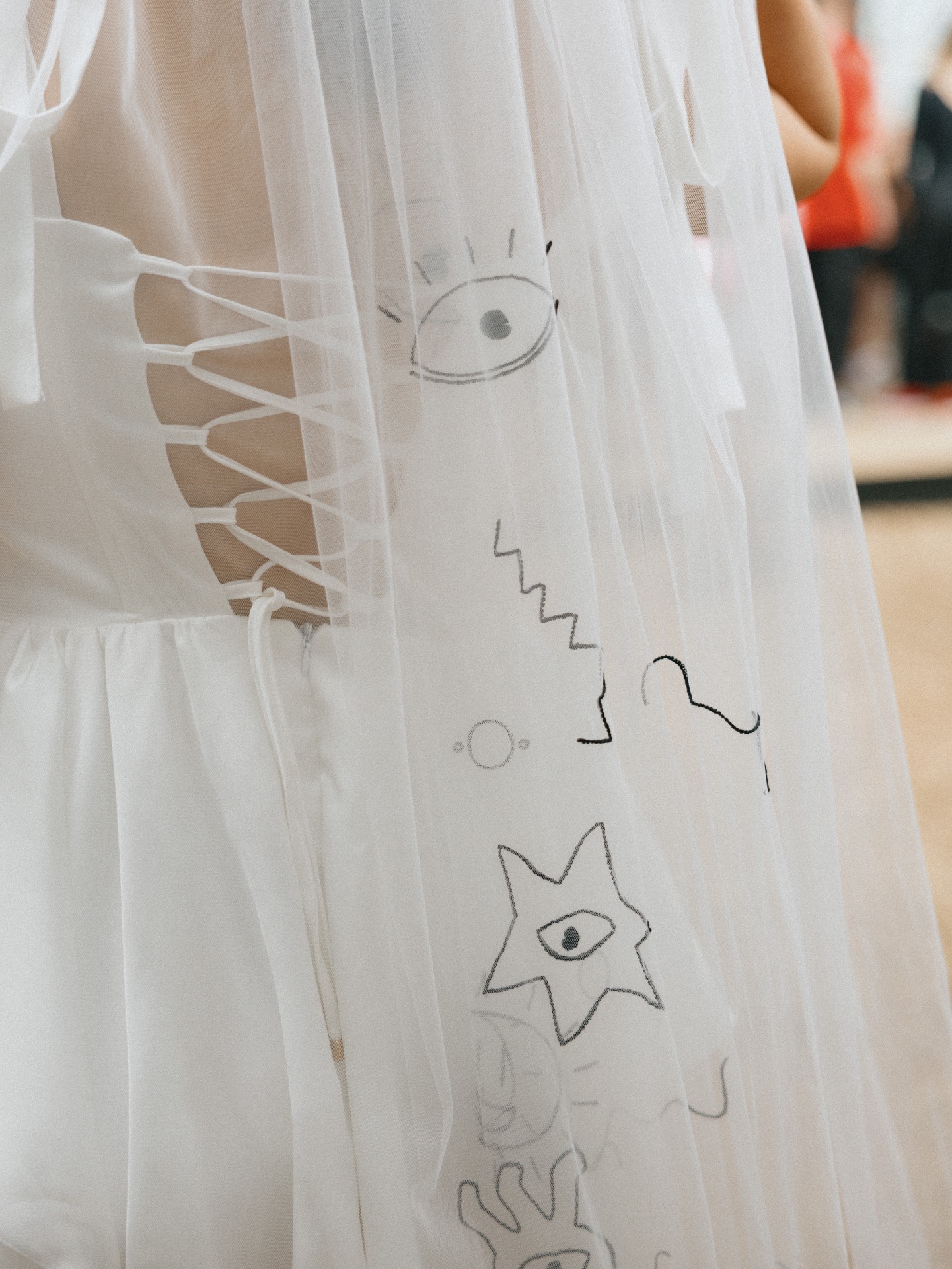 У меня было короткое платье, в котором было комфортно рейвиться и прыгать на танцполе. Помимо этого, мы задекорировали мою фату для второго дня: расшили её рисунками Антона. А в качестве букета я взяла брокколи с жемчужинами.