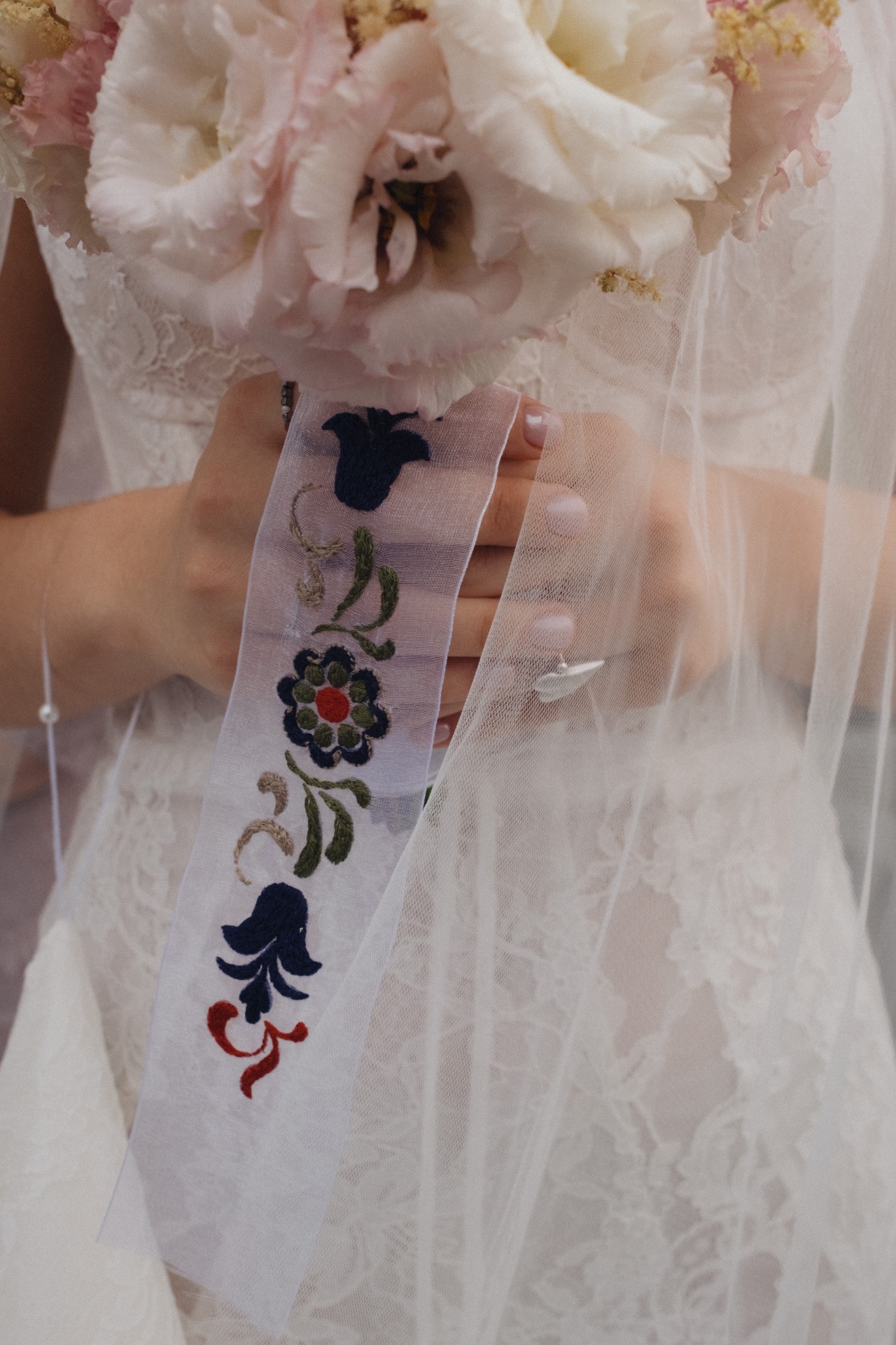 У меня было приталенное длинное платье с кружевами и букет с лентой, которую специально вышивали татарскими узорами, чтобы отдать дань моим корням. В первый день наши образы были ближе к классическим.