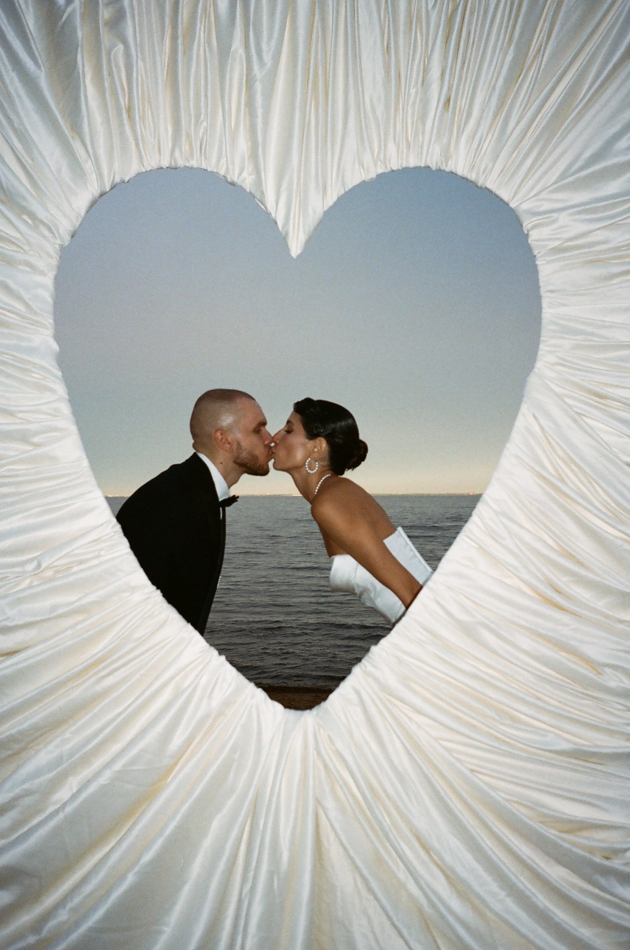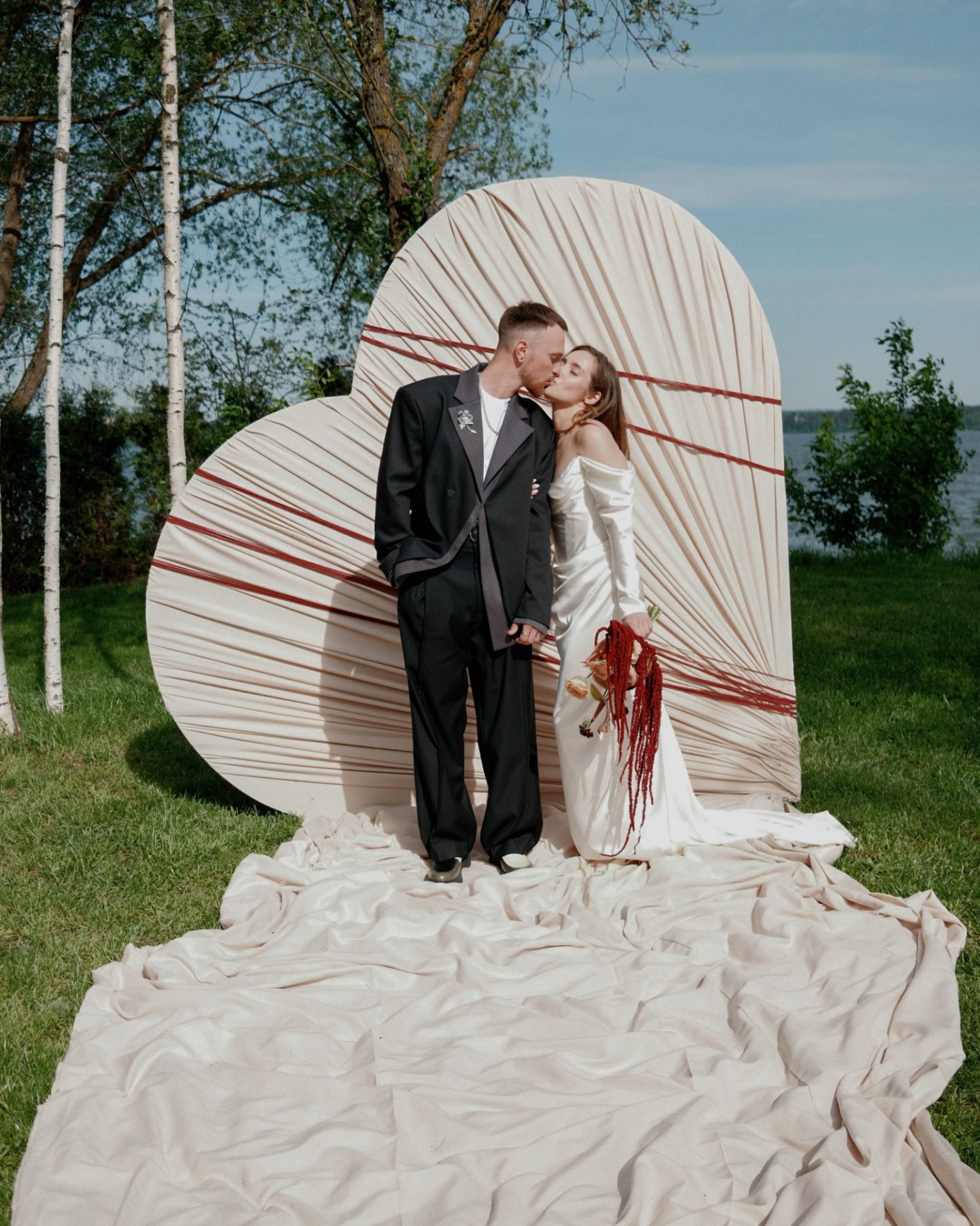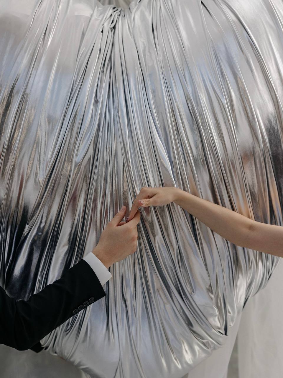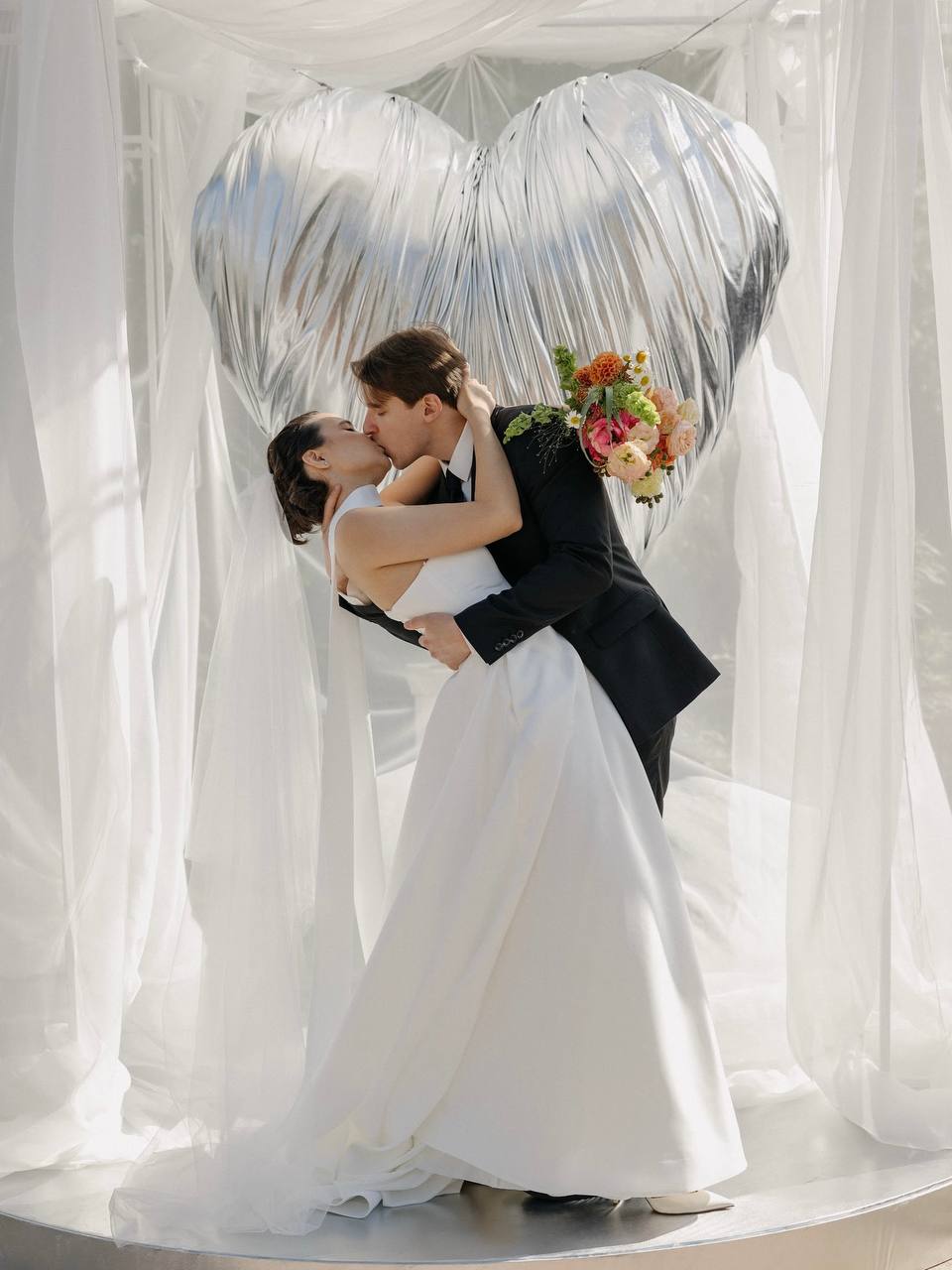 Свадебное агентство Воздух создало огромное серебряное сердце для пары. Здесь, кстати, можно найти 3 свадебных тренда сезона 2025: максимализм, серебро и, конечно же, сердце!