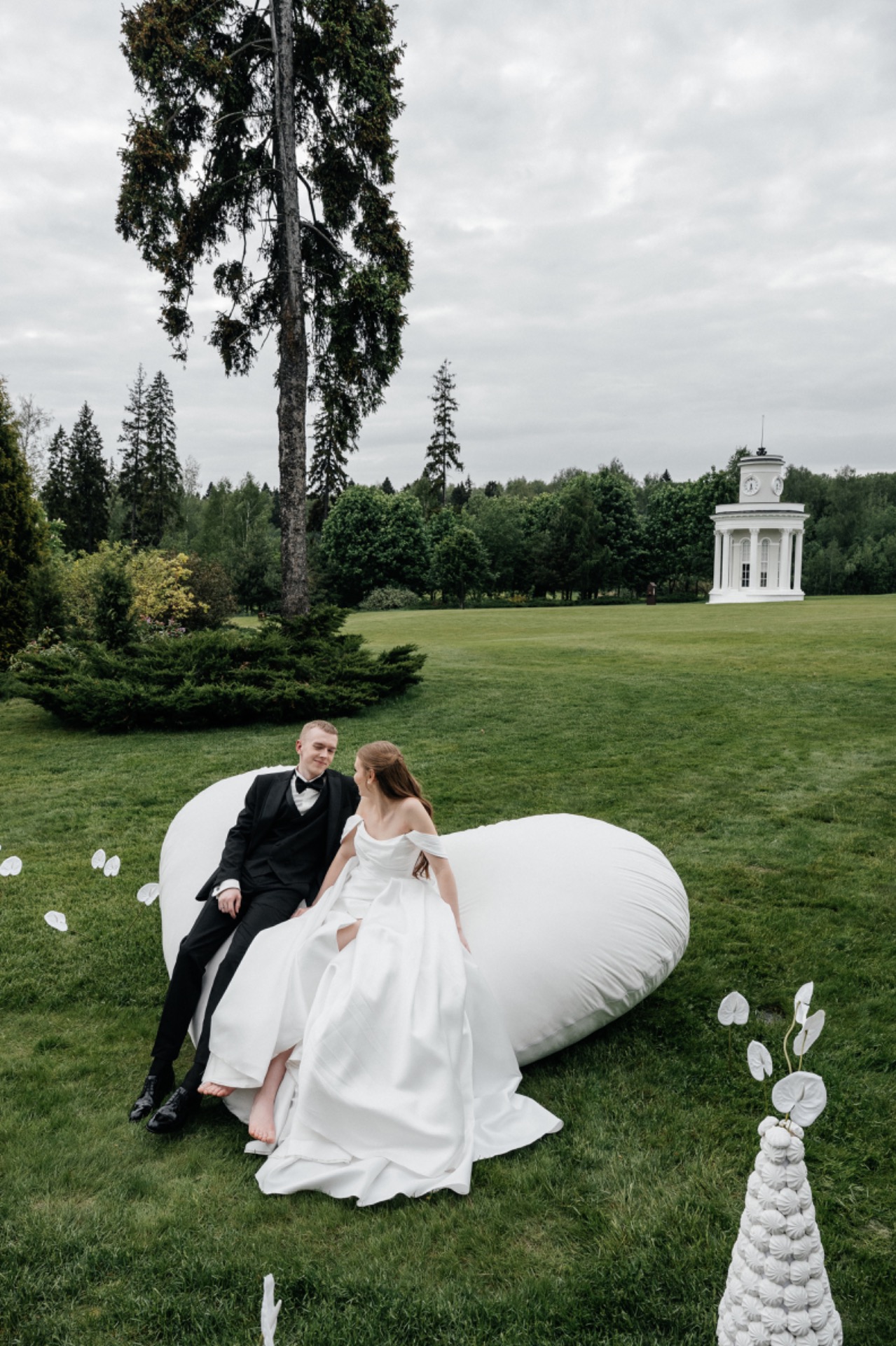 Концепция свадьбы родилась из личной истории пары. В начале отношений жених Егор часто приносил сладости невесте, её брату и сестре, поэтому в оформлении было использовано 75 килограммов зефира. Торжественная церемония проходила у большого белого сердца из драпированных тканей, напоминающих нежный зефир.