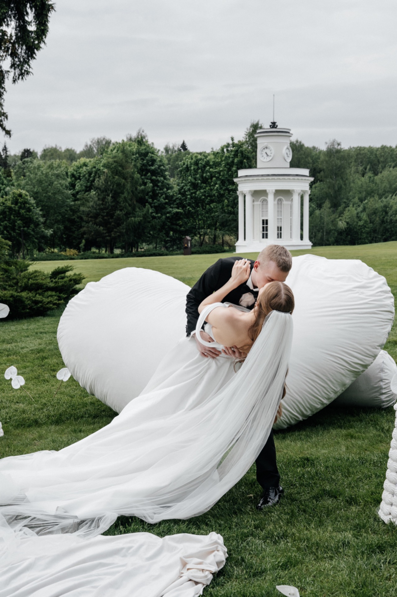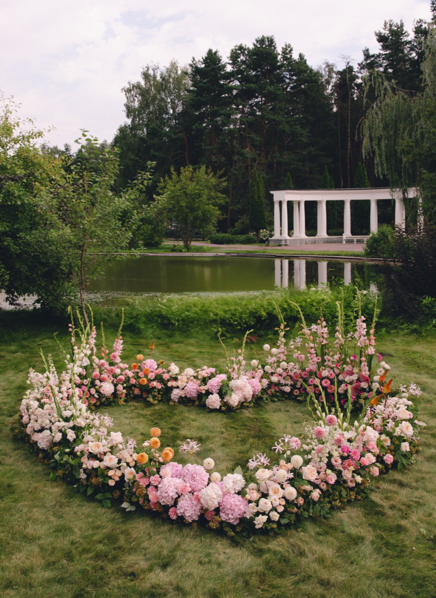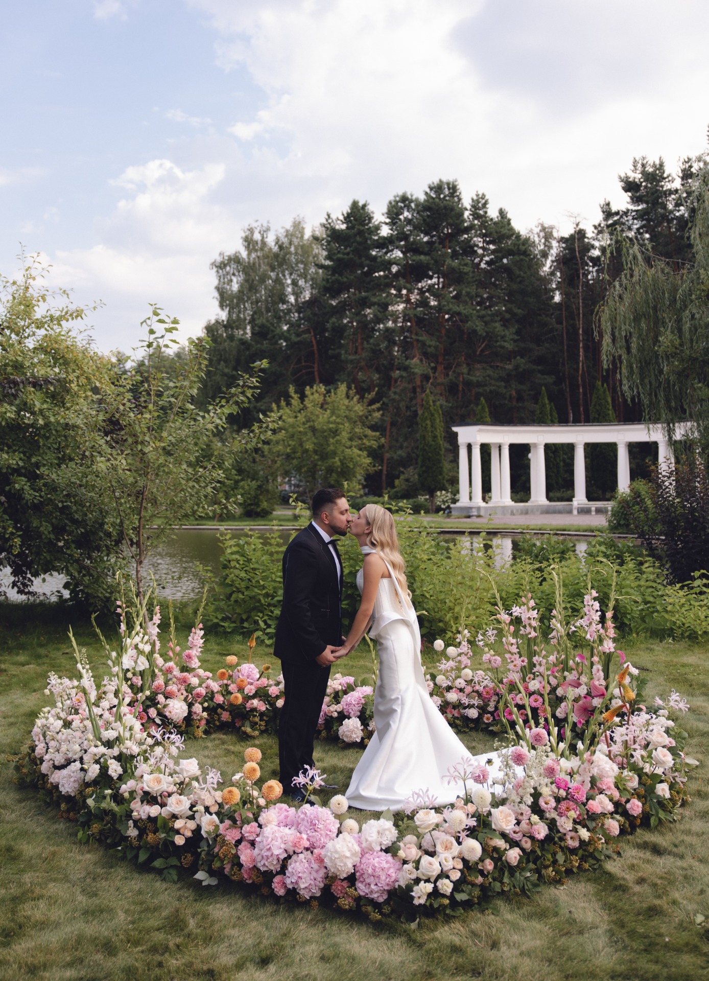 Выбор пал окруженную живописным лесом на Усадьбу Ушмор, в центре которой спокойный пруд с лебедями, красивый ландшафт и архитектура. Мы хотели создать в этот день особенно нежную атмосферу, но легкую и сдержанную. Выбрали спокойные оттенки розового, свечи, необычные цветочные композиции, струящиеся ткани и живую музыку. Всё это стало эстетичным дополнением нашей любви.Обмен клятвами стал кульминацией дня: слова любви и обещания, произнесенные стоя в центре сердца из цветов, наполнили всё вокруг магией.
