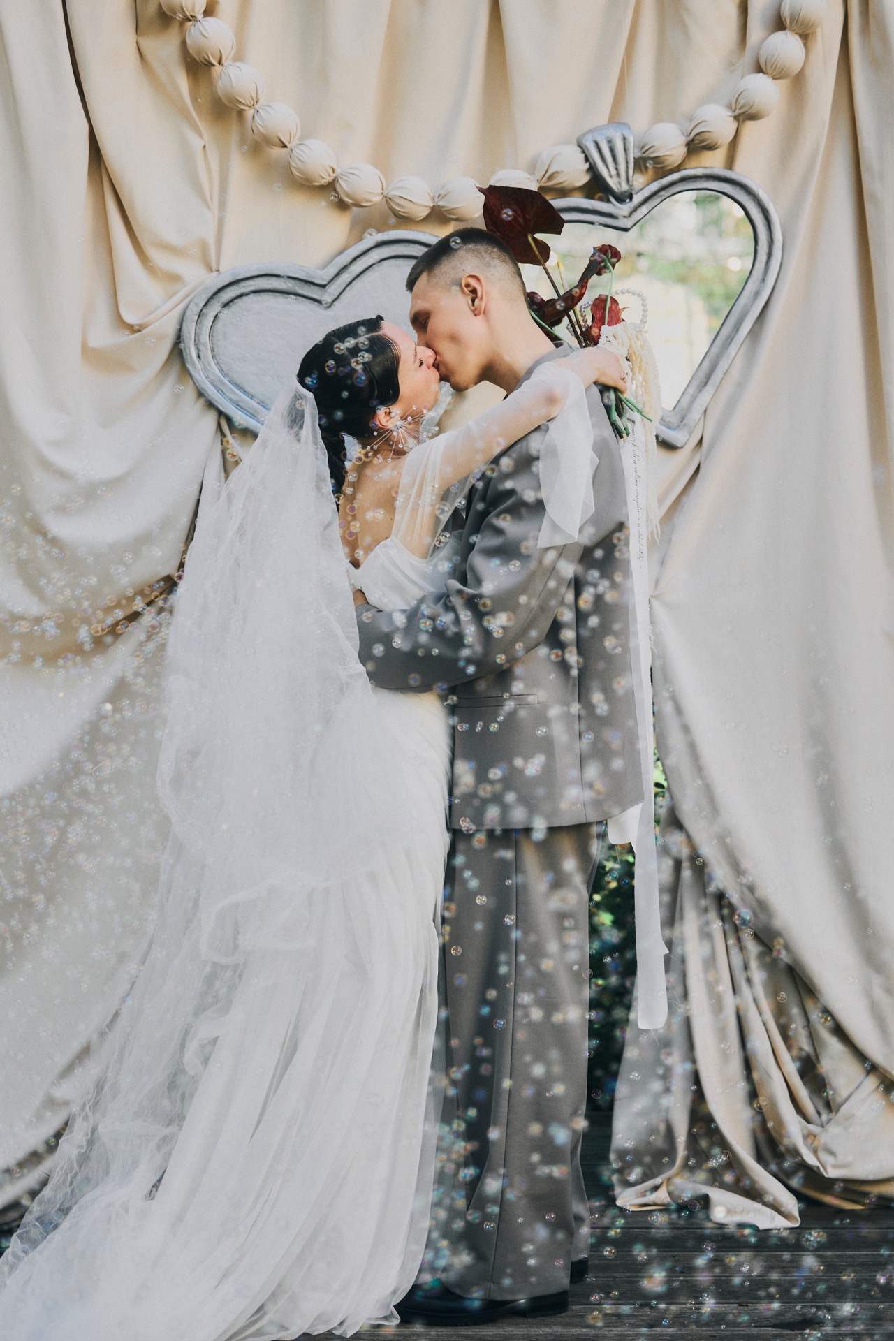 Пара совместно со свадебным агентством Kate&Leo создали винтажный декор, во главе которого стояло сердце. Цвета пыльной розы, винный, крем-брюле помогли создать нужное настроение. Драпировки и сочетание тканей разных фактур также сыграли свою роль, а сердце вместо свадебной арки покорило всех гостей.
