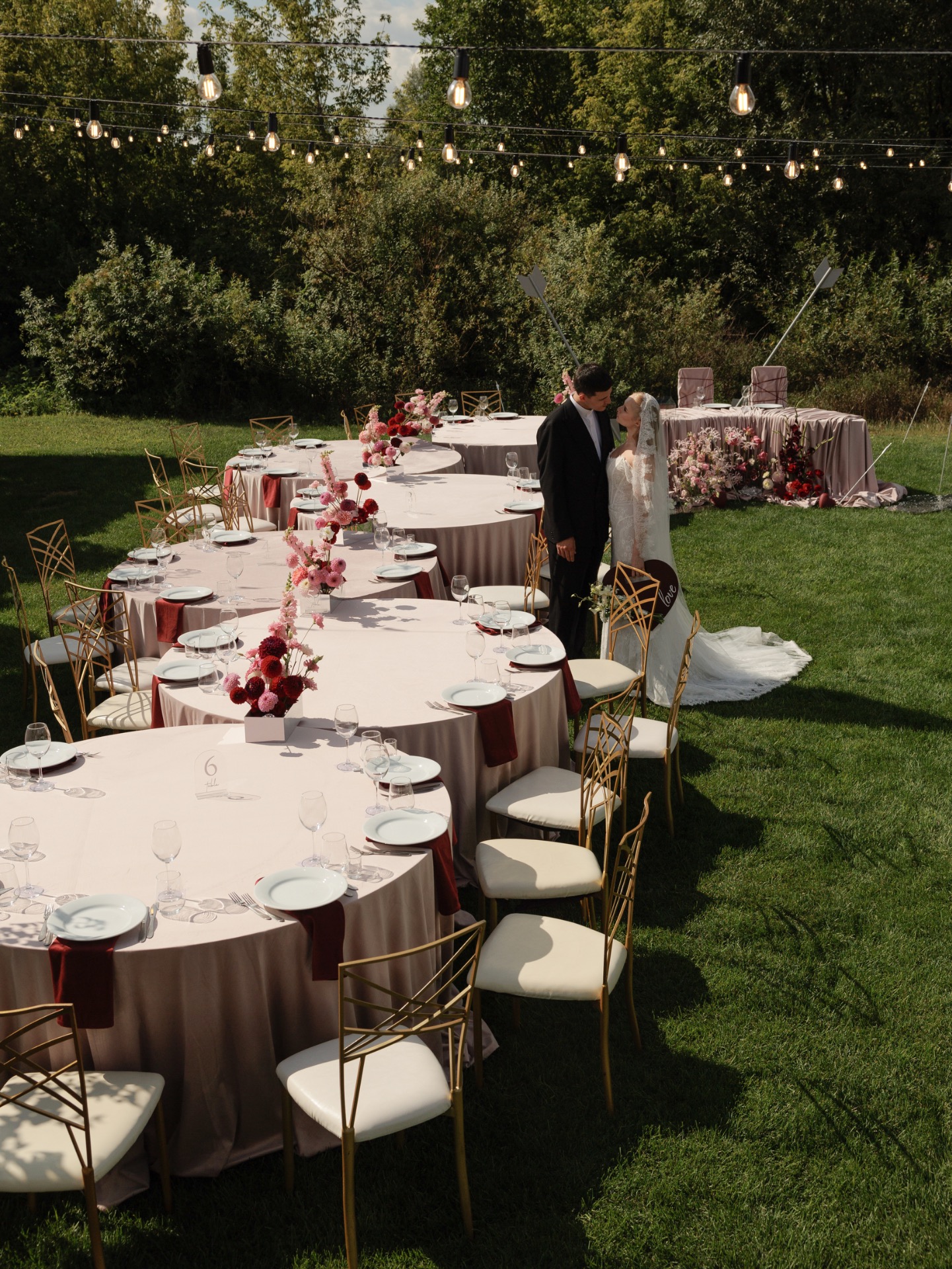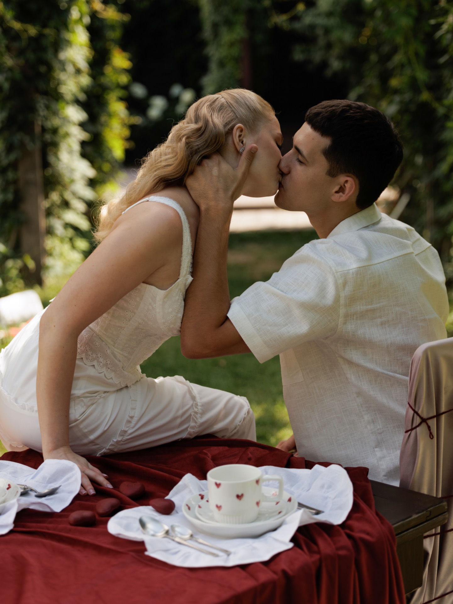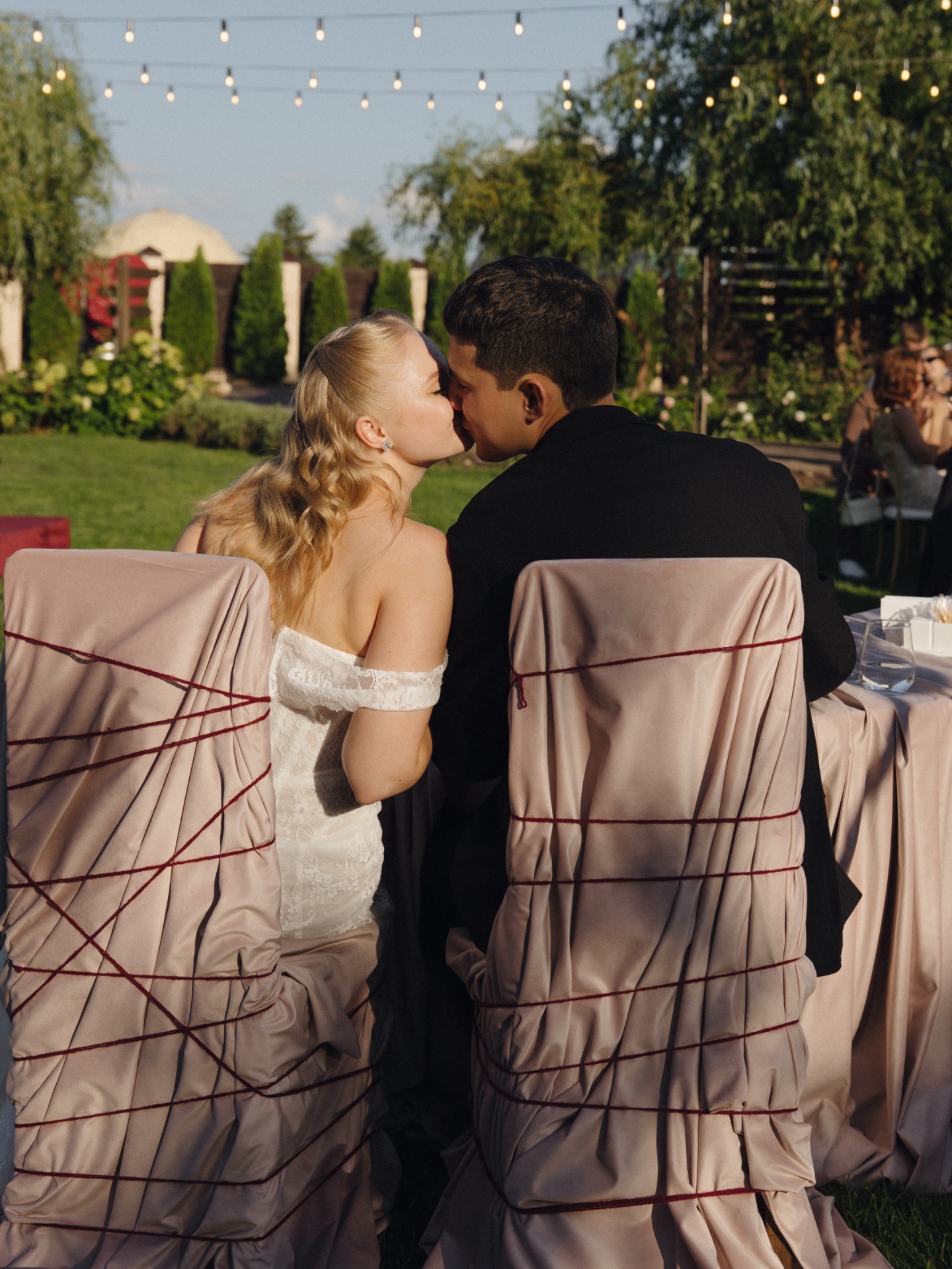 С цветовой палитрой мы тоже определялись довольно долго. Базовые свадебные оттенки казались нам слишком спокойными. Однажды мы увидели бархат насыщенного винного оттенка, и всё сразу стало на свои места. Этот цвет идеально передавал атмосферу страсти и тепла, которыми наполнены наши отношения.
