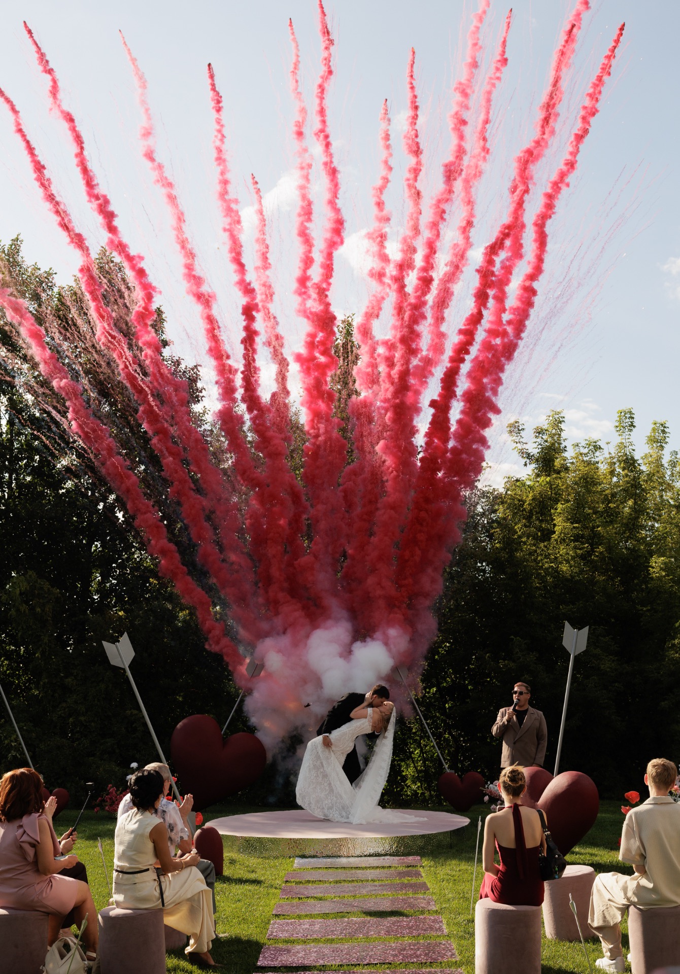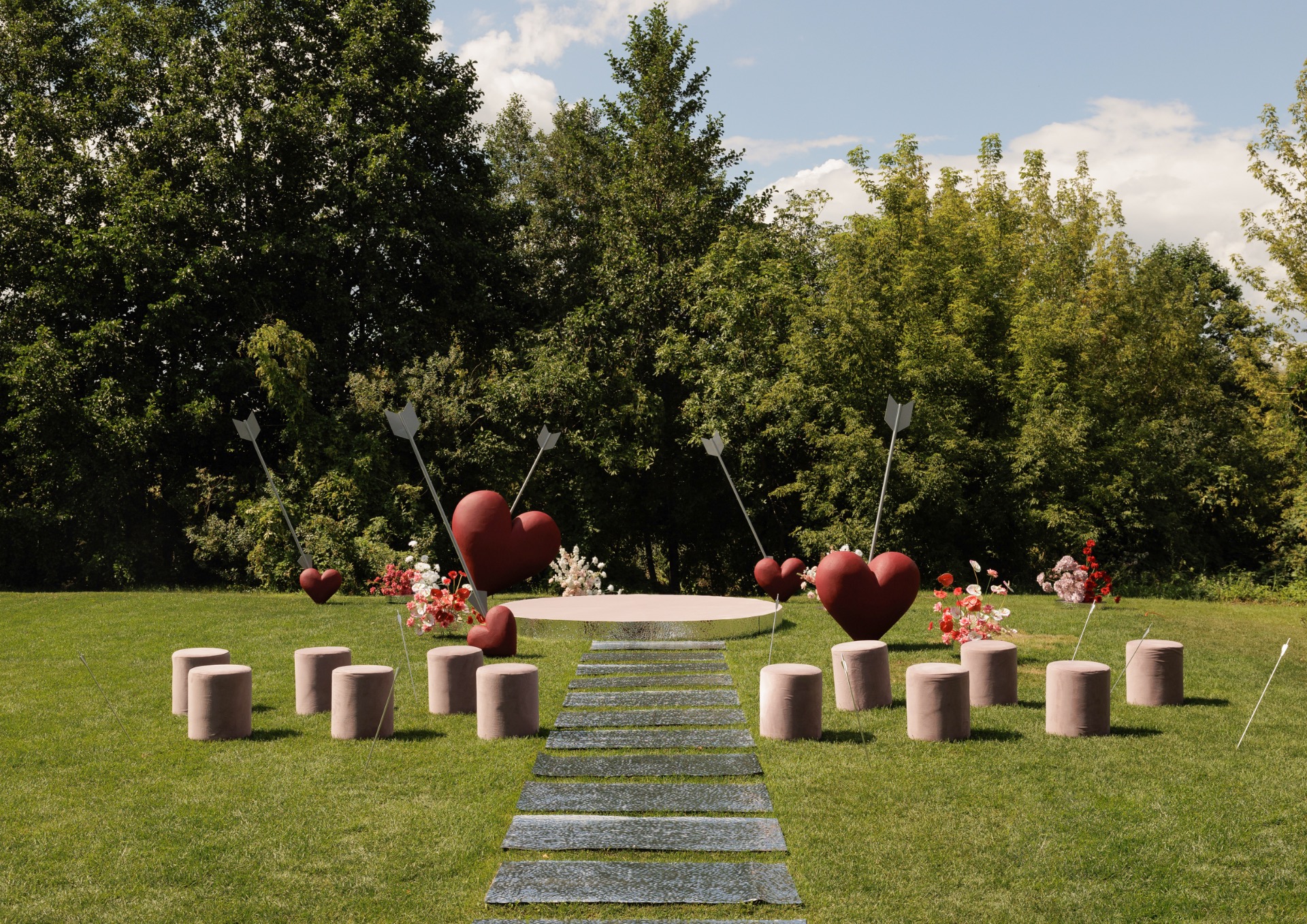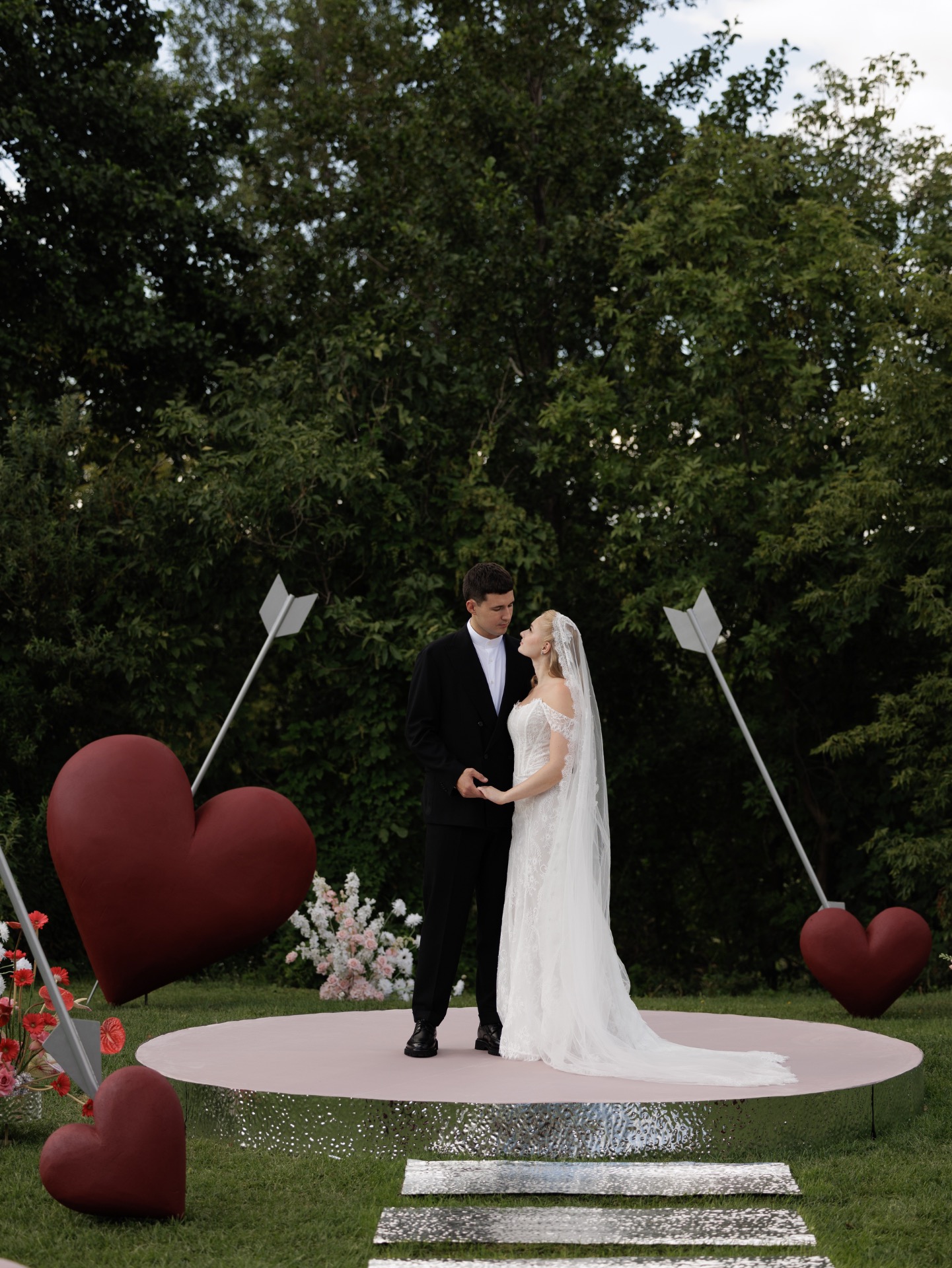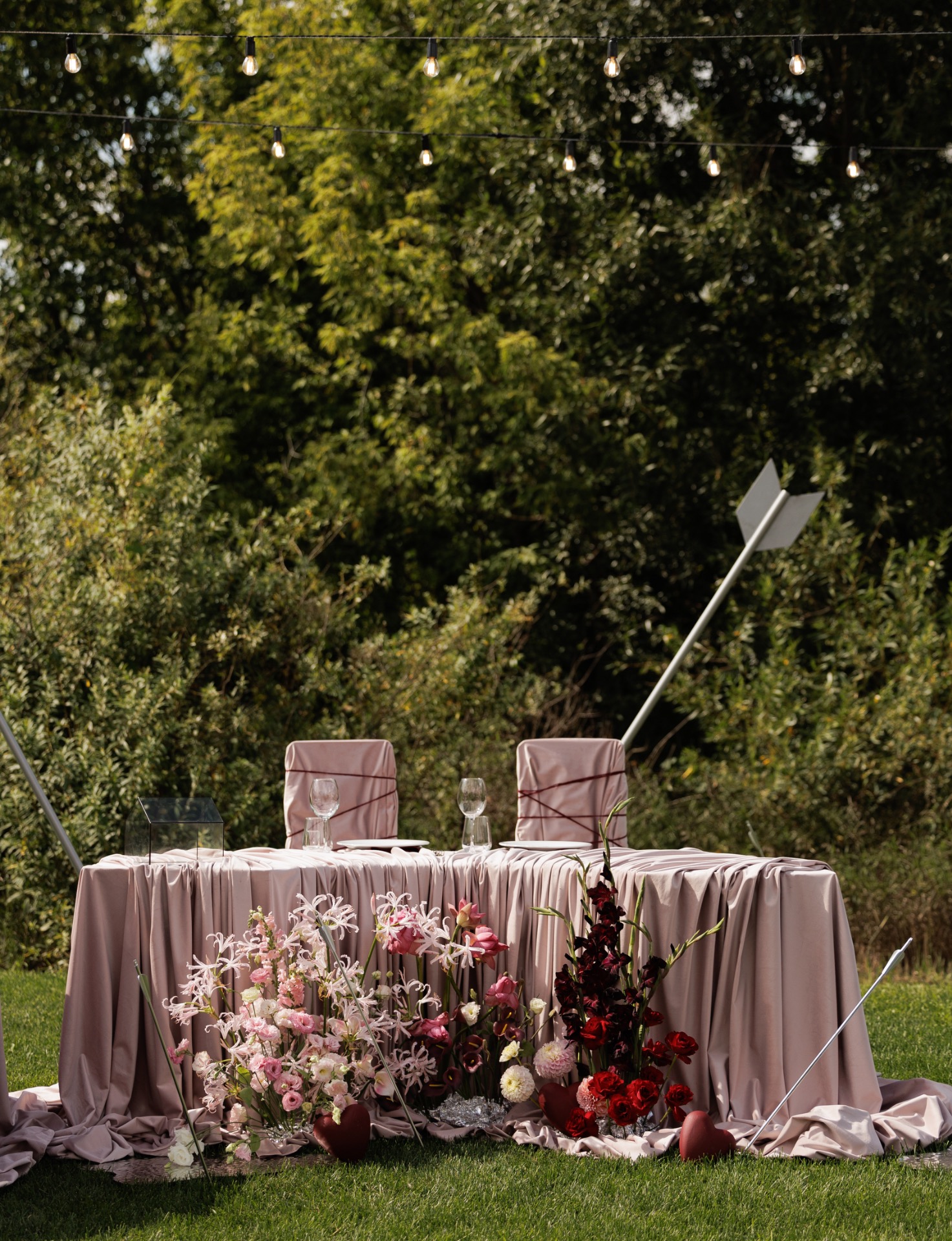 Главным символом нашей пары стало сердце, с ним связано много наших событий: от первых подарков до предложения. Именно вокруг этой идеи мы начали строить оформление. Так родился образ стрел с наконечниками в виде сердец, которые потом стали частью декора.
