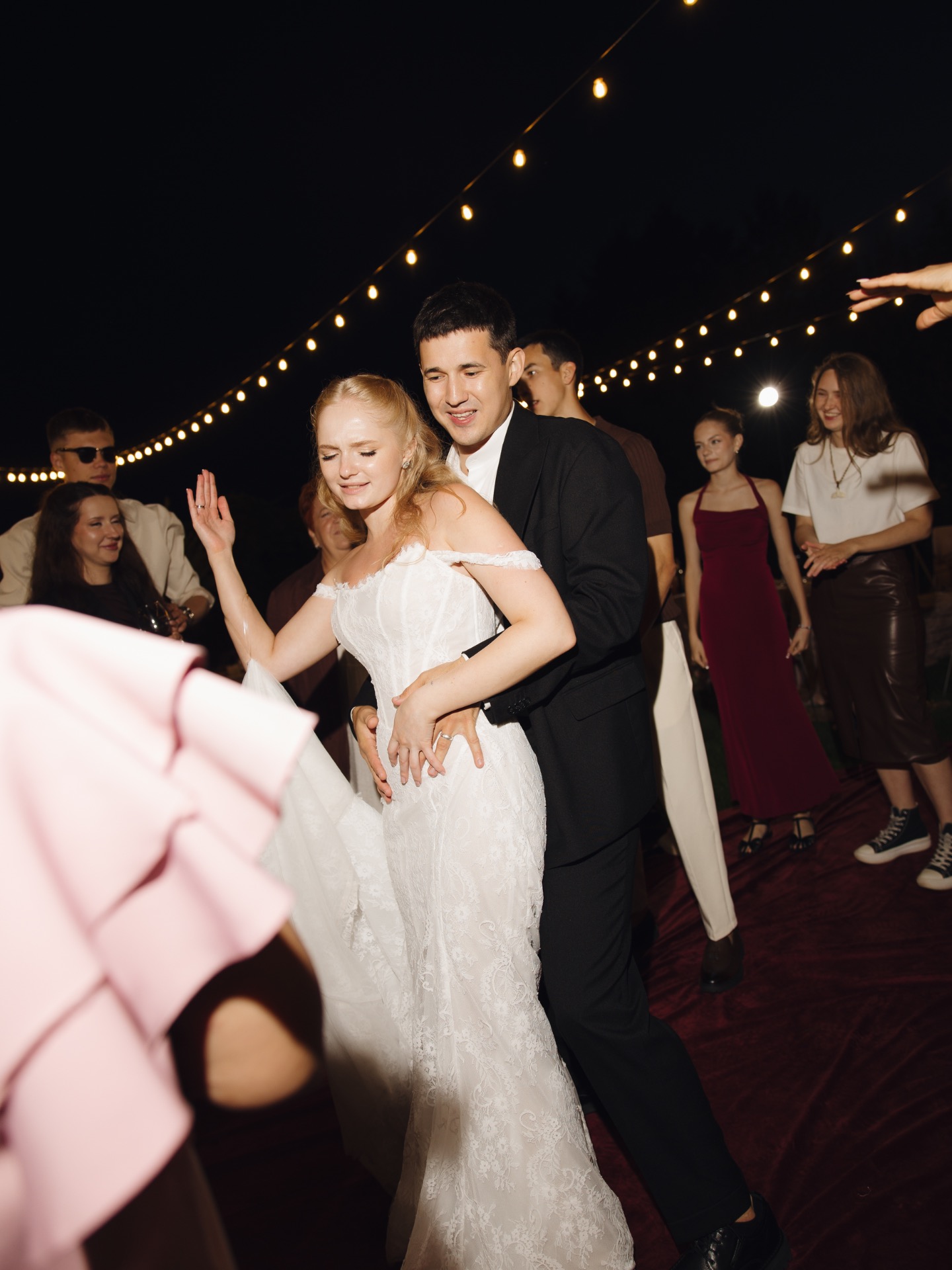 Танцы начались сразу после ужина и не прекращались до самого конца праздника. Одним из лучших решений было сделать подиум для танцпола — на нём гости буквально сияли, а мы с Лёней танцевали так, будто никто нас не видит.