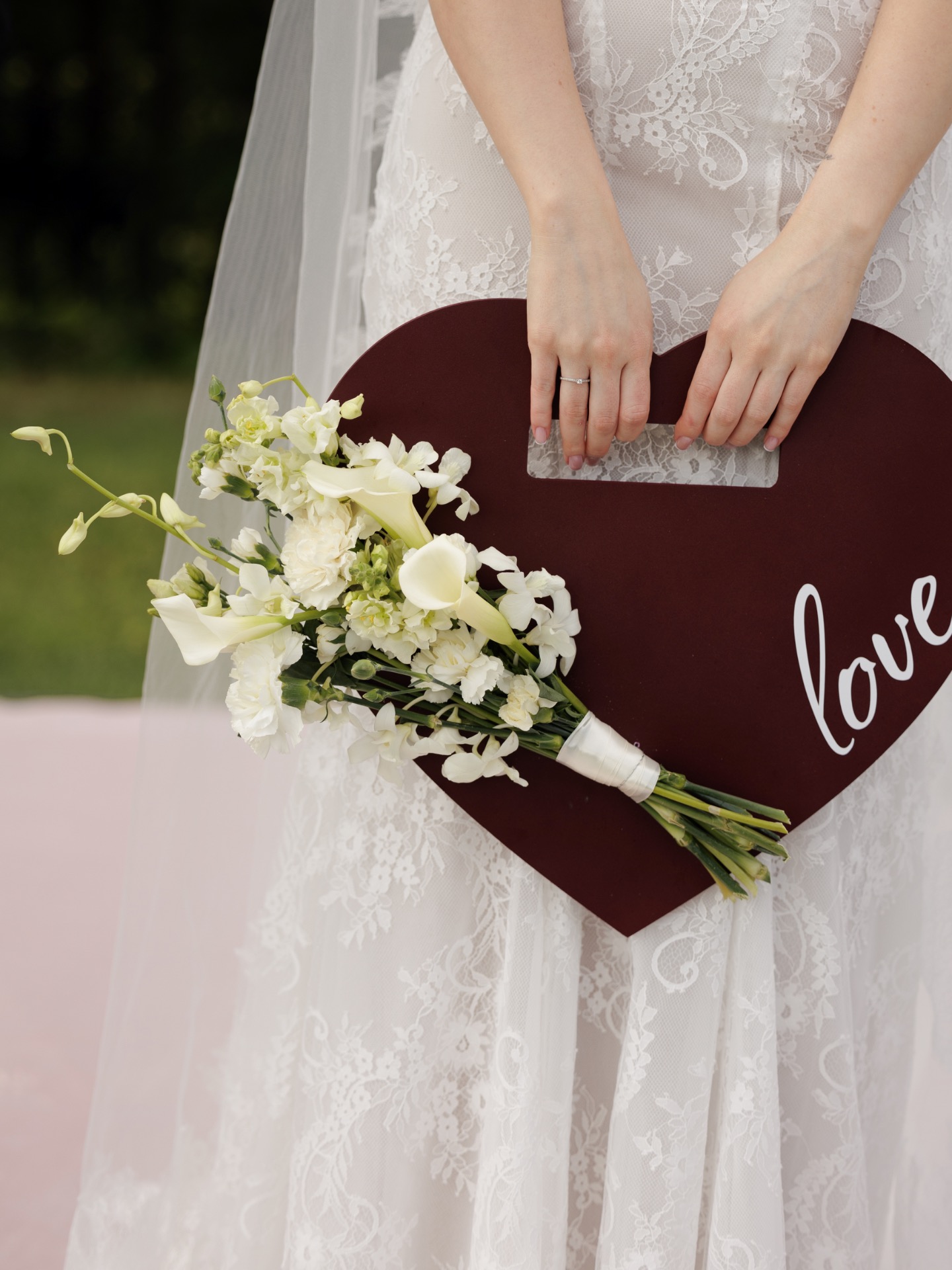 Особенностью моего образа стало отсутствие классического букета невесты. Я сразу знала, что хочу добавить к своему наряду что-то необычное. Поэтому я решила сделать сумочку из дерева в виде сердечка, к которому крепились цветы. Именно их я и бросила подружкам невесты в конце вечера.