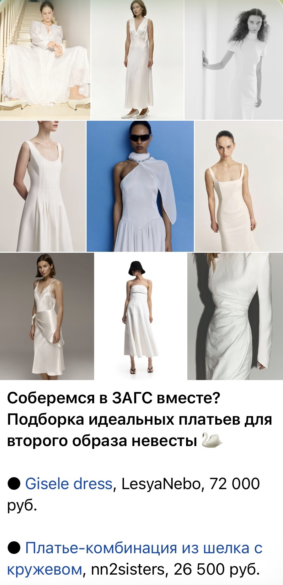 Пользуйся готовыми подборками для невест в специальном шопинг-листе. 1000+ находок, 200+ брендов, обновления каждый день. Всё уже отобрано для тебя!
