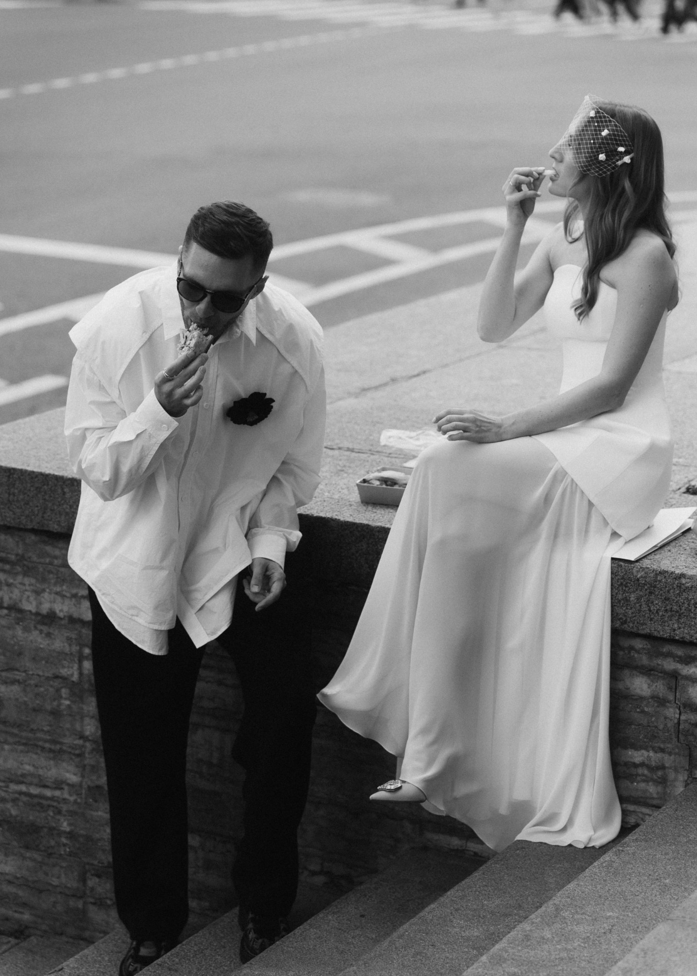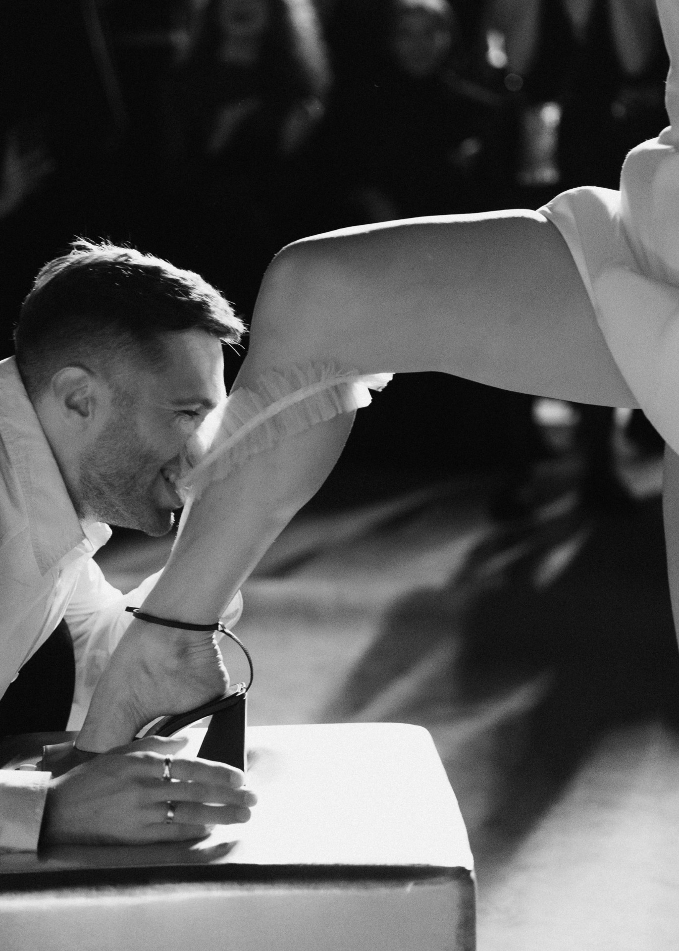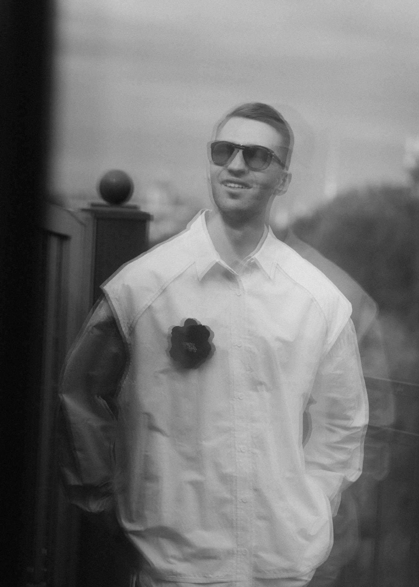Образ жениха строился на деталях. Ботинки от Camper Lab добавили нужную долю дерзости, а роза стала настоящим арт-объектом: её вручную изготовили на заказ по подобию броши Dolce & Gabbana. Этот элемент стал тихим, но выразительным акцентом образа.