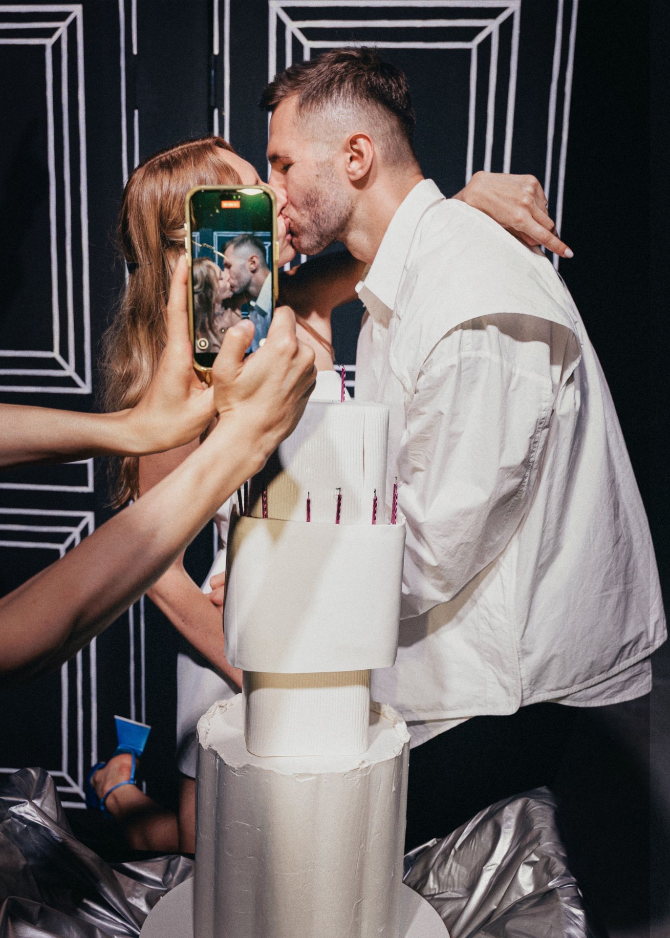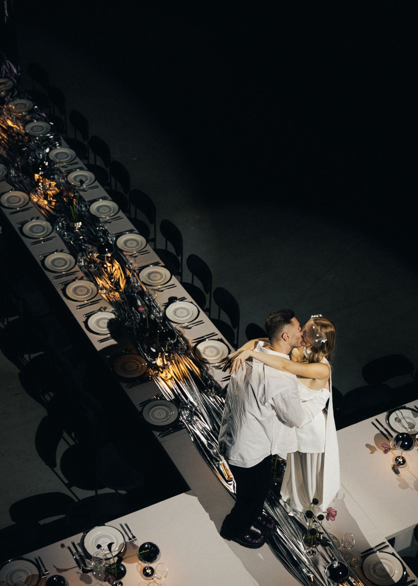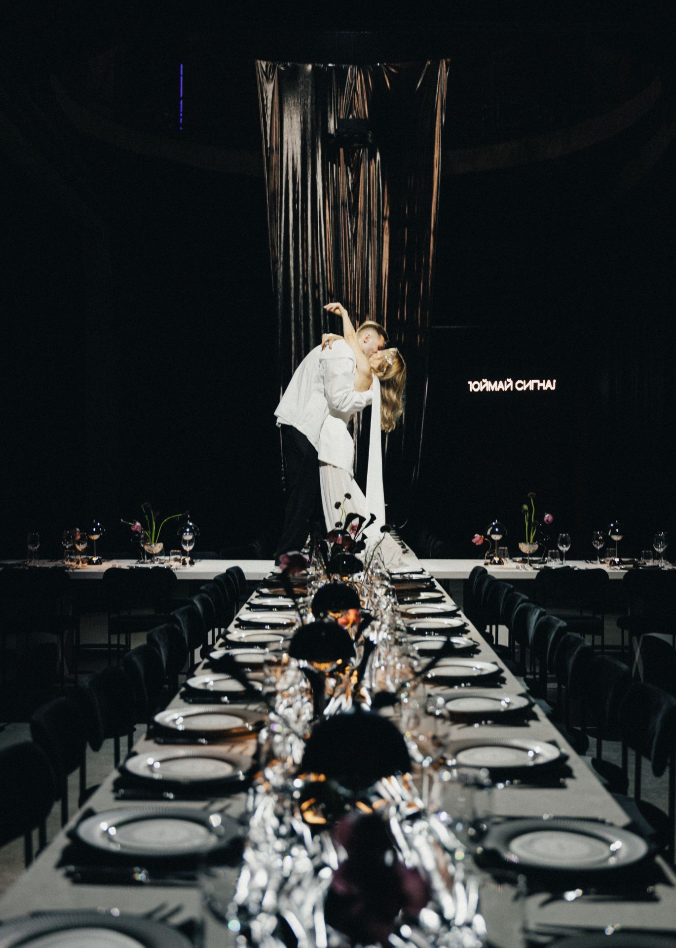 Стол-крест отсылал к Грузии — месту, где было сделано предложение. Обручальные кольца повторили форму фестивального промо-кольца, но уже в золоте. А звуковая инсталляция, демонстрировавшая важность языка прикосновений и музыки, которую гости «создавали» объятиями, поглаживаниями и поцелуями, продолжала главный манифест этой пары.