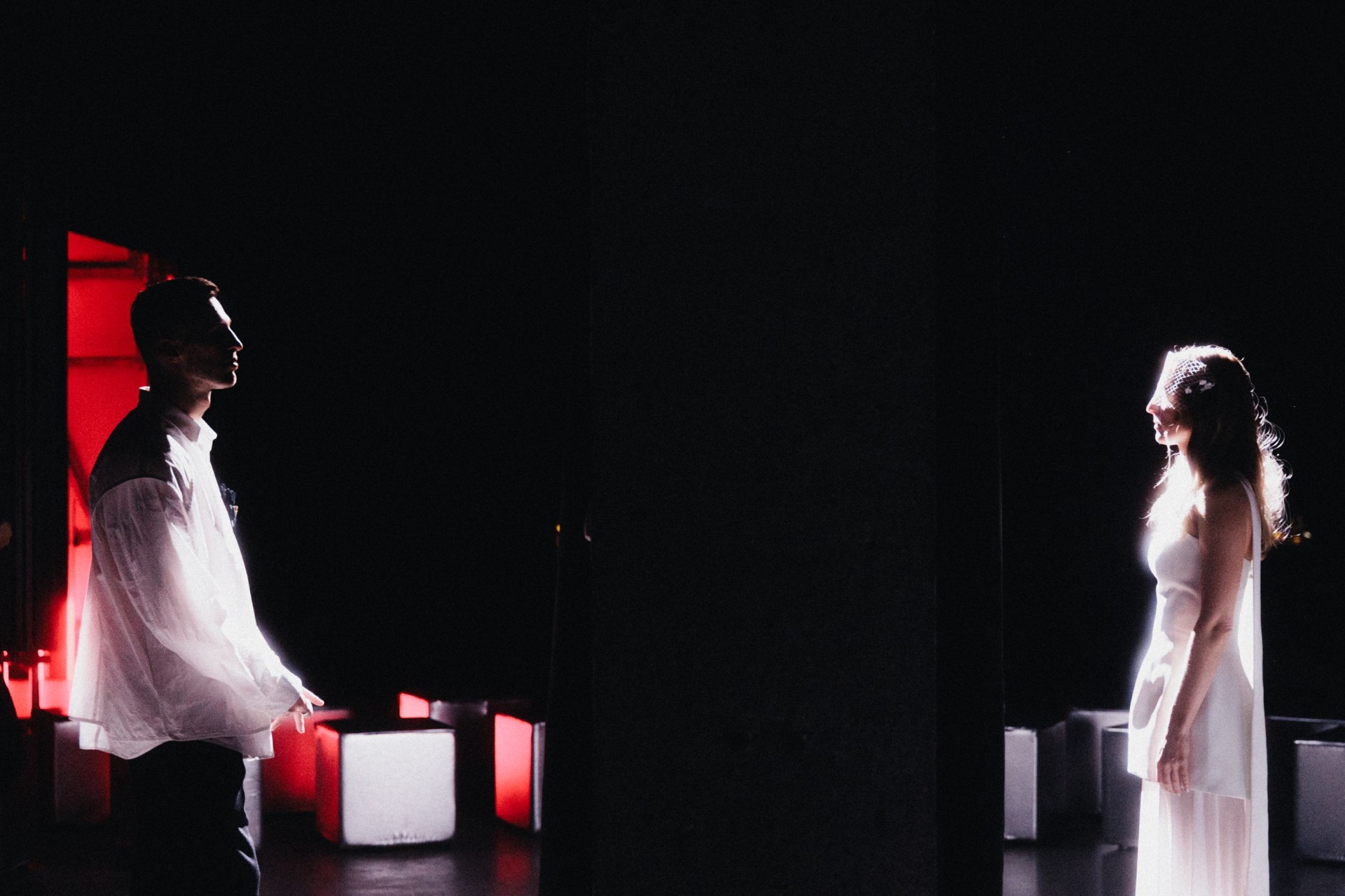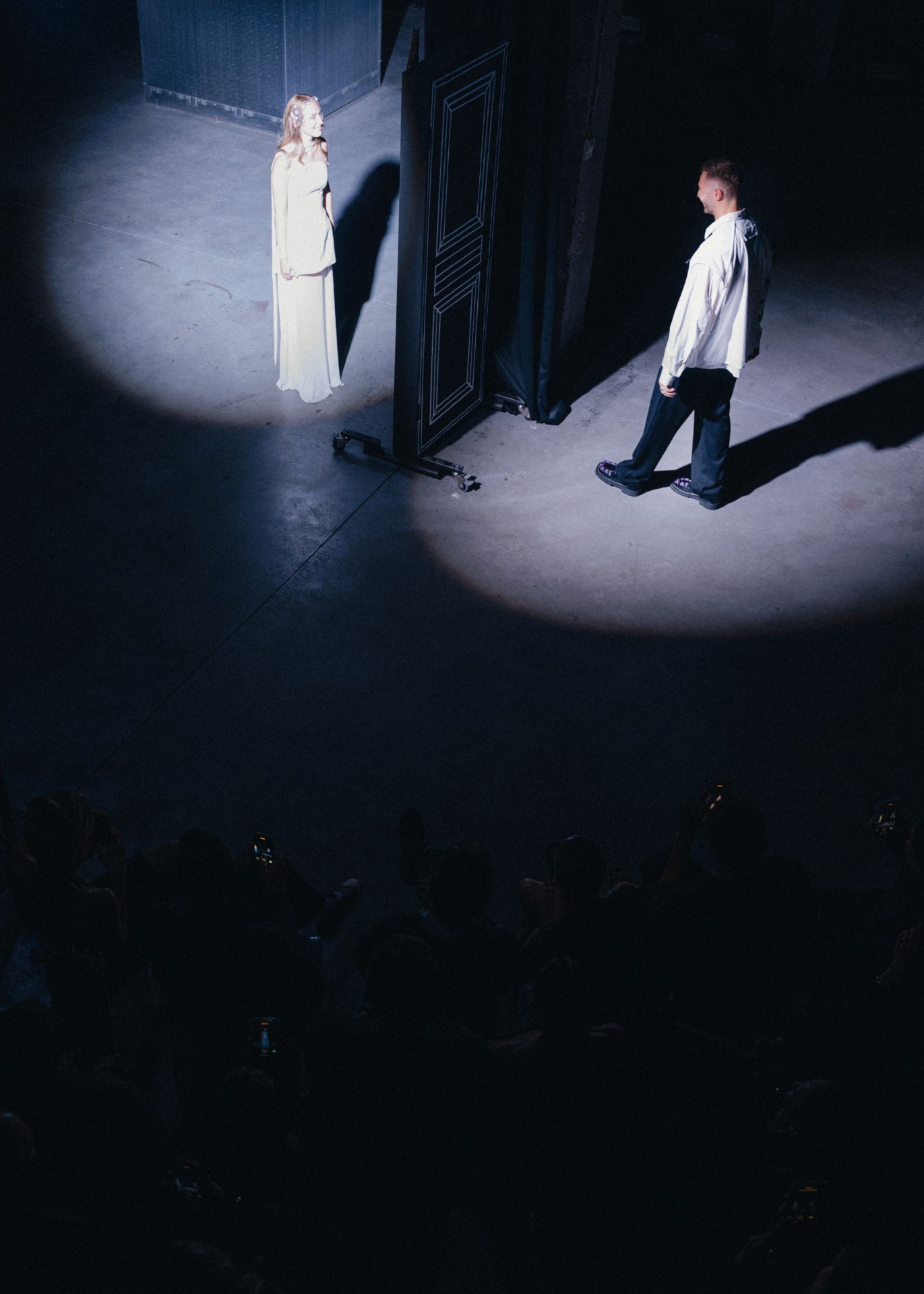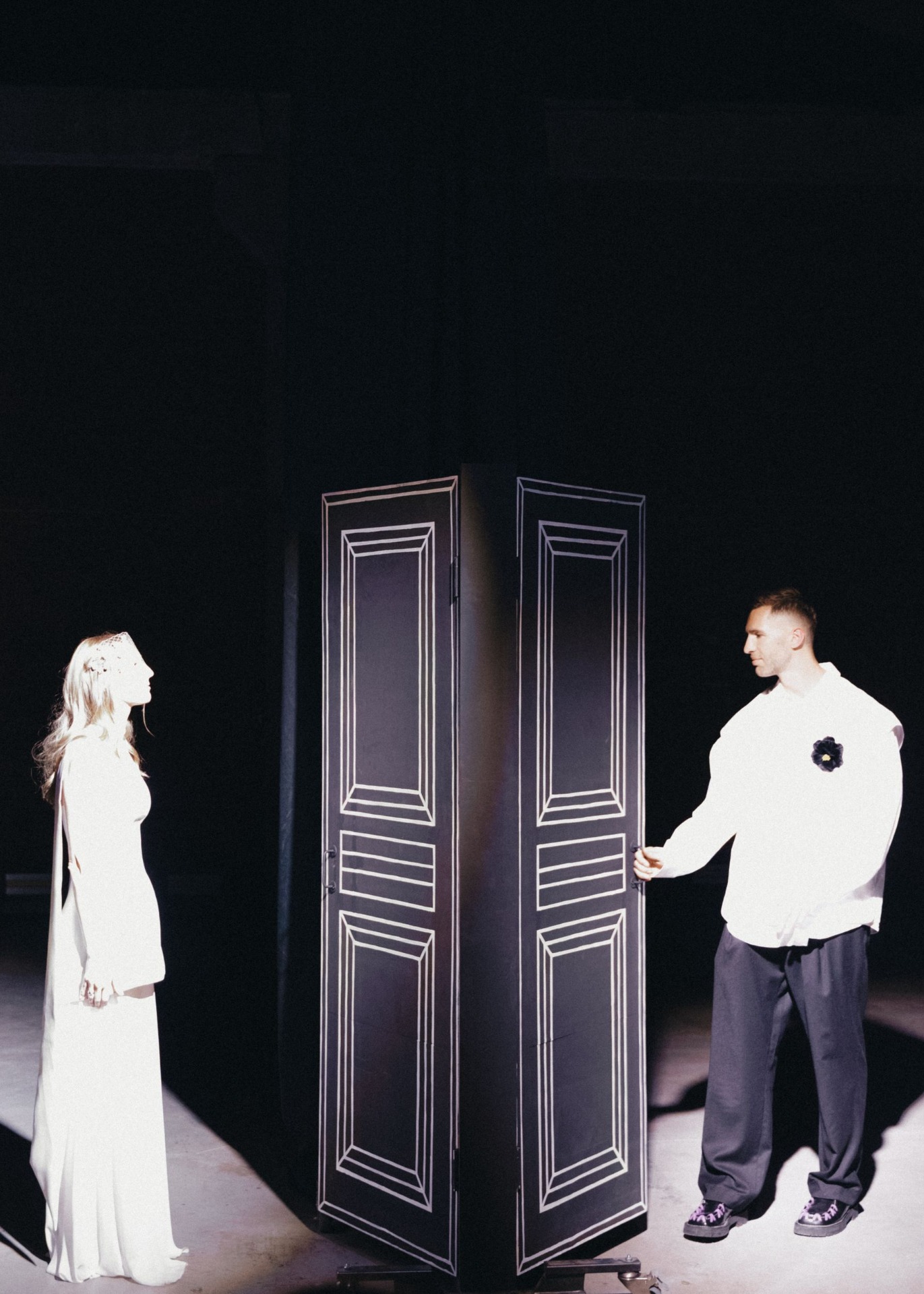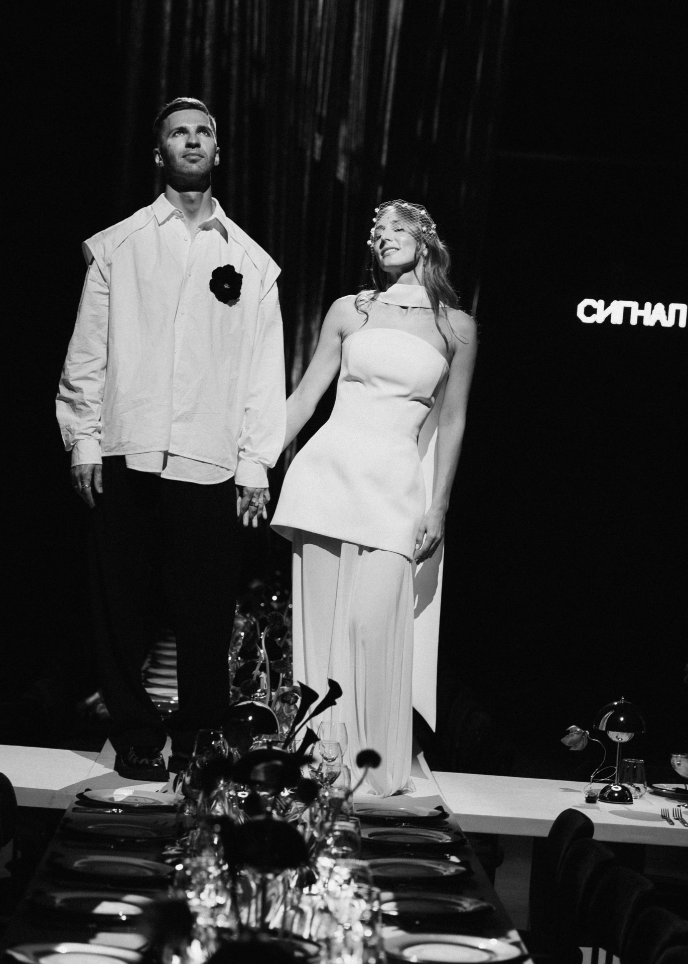 Перформативная церемония прошла перед двумя дверями — отсылкой к месту их знакомства. Гости слушали заранее записанное аудио с этапами их жизни, после которых герои дня открывали двери, но оставались одиноки. В финале прозвучали строки из трека «Кто ты? Может, ты моя судьба?» группы Крем Сода — и в этот миг, получив сигнал, двери распахнулись одновременно. Они увидели друг друга, произнесли признание в любви.