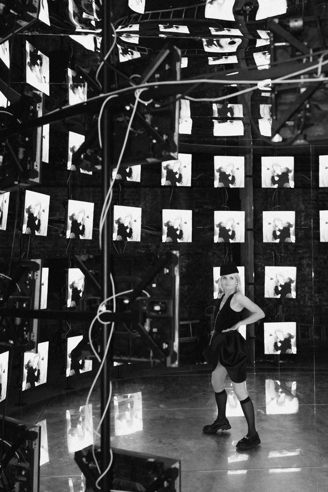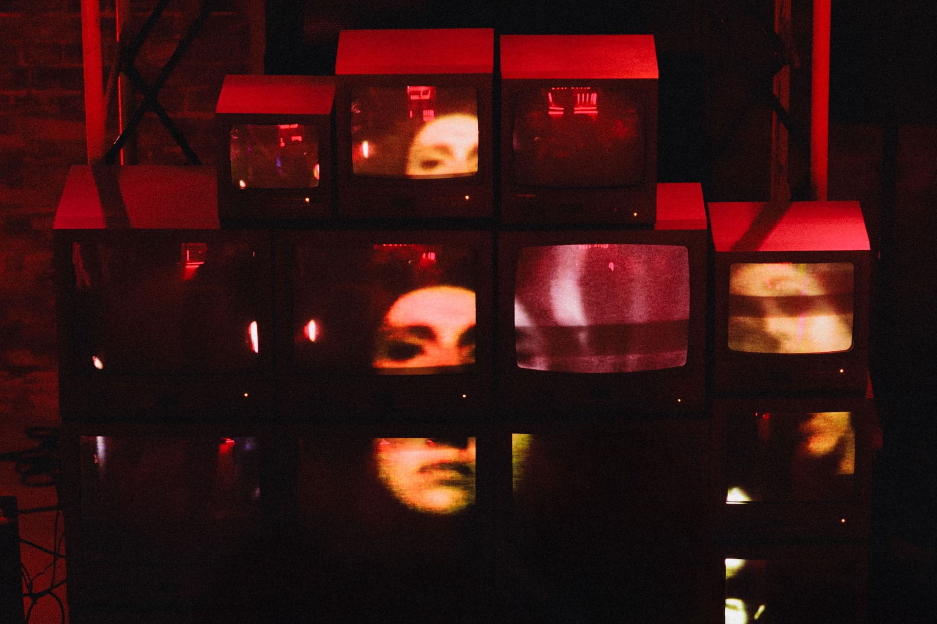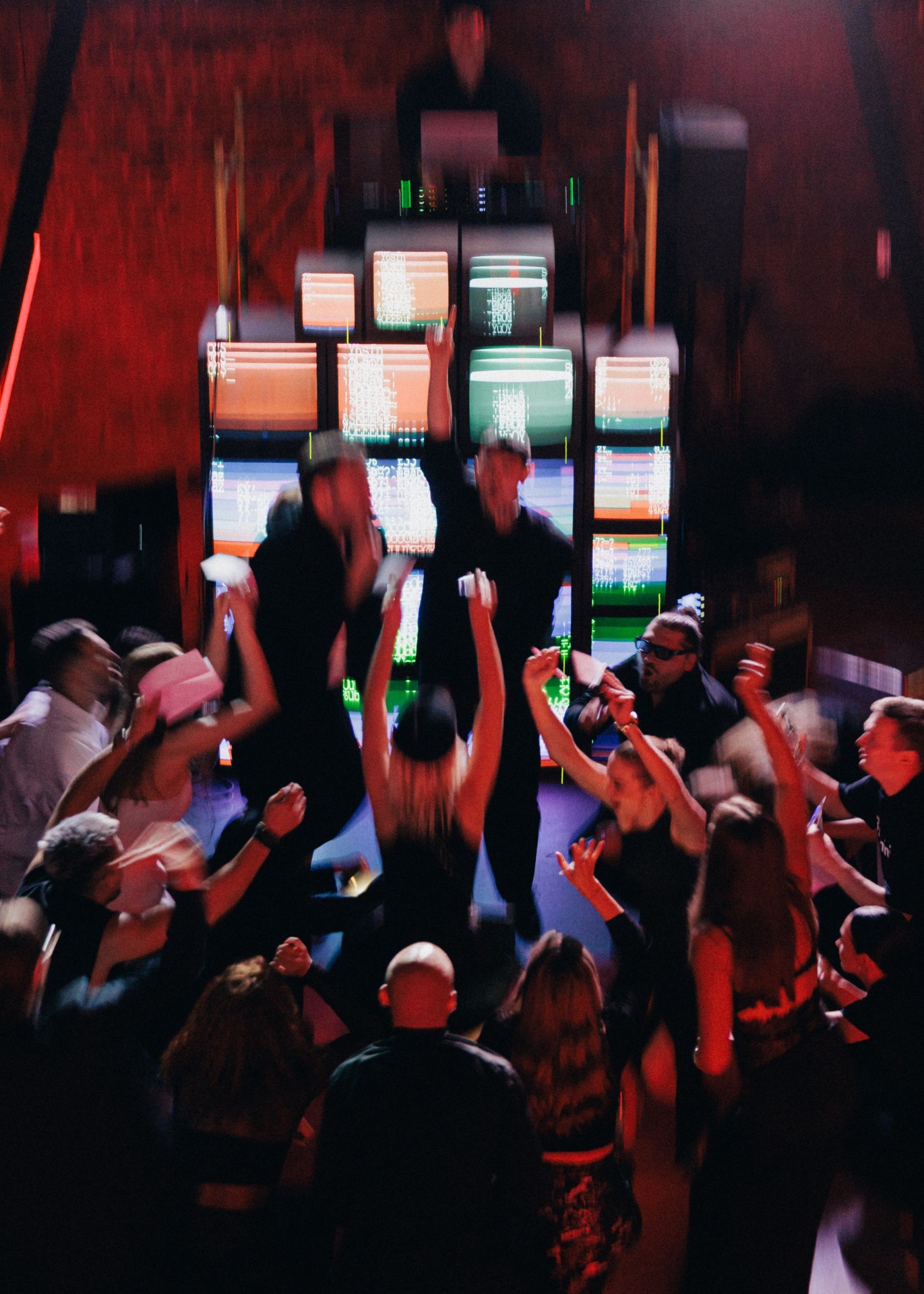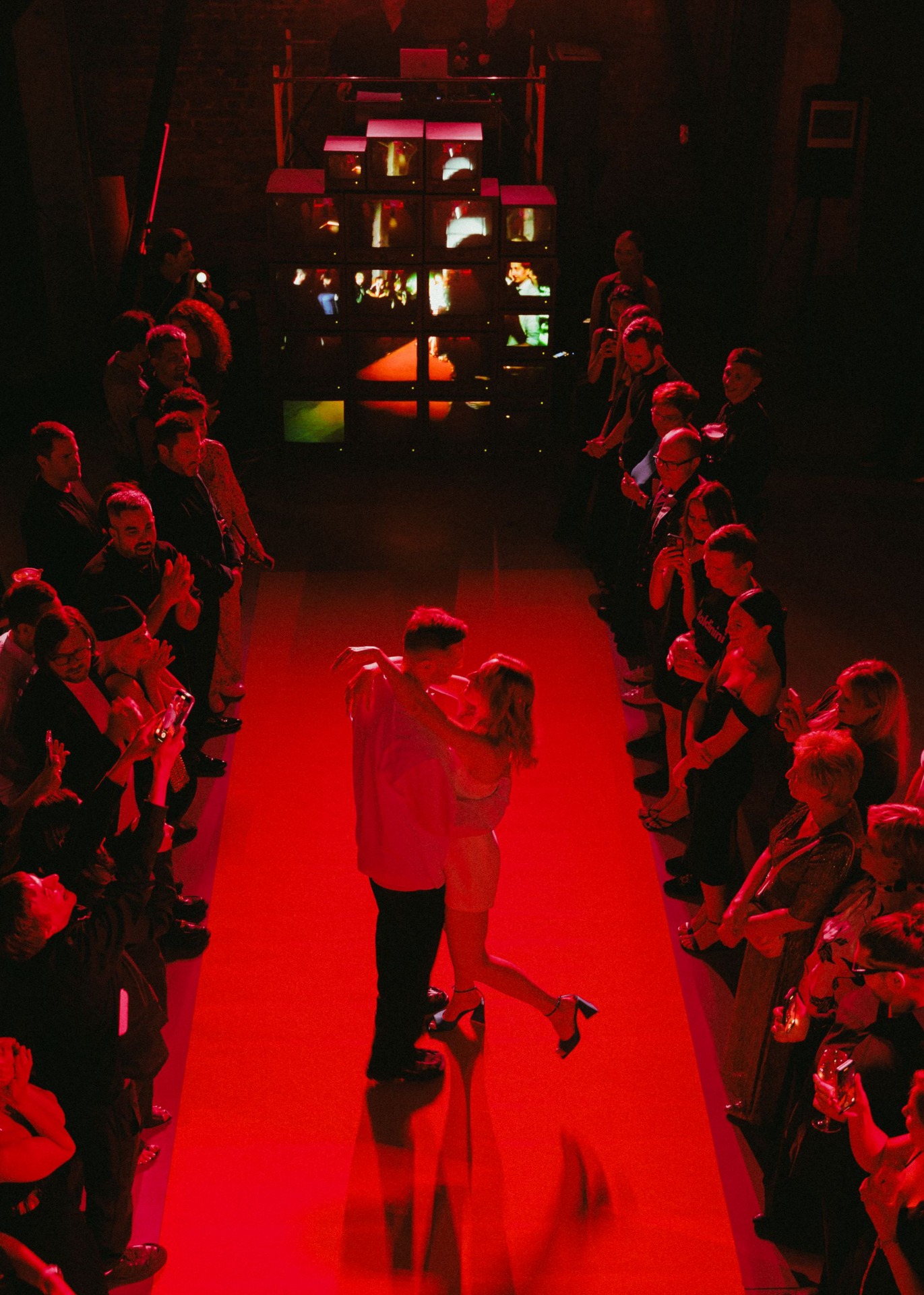 Медиа-объект из телевизоров на танцполе с аналоговой камерой создавал живой репортаж. А бегущая строка отсылала к зоне «Маяк» с фестиваля, собирая сигналы гостей: «Целуйтесь».