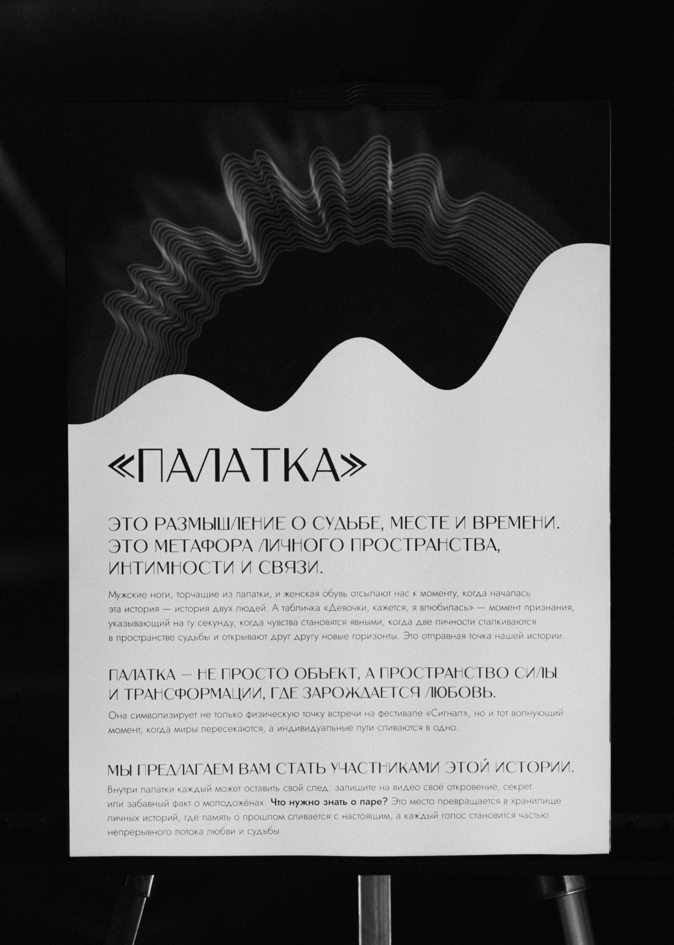 Пространство продолжало их историю: палатка-инсталляция с камерой для видеопосланий символизировала рождение любви и их первую ночь на фестивале — ту самую маленькую палатку Вали с длинными ногами Андрея и фразу: «Девочки, кажется, я влюбилась».