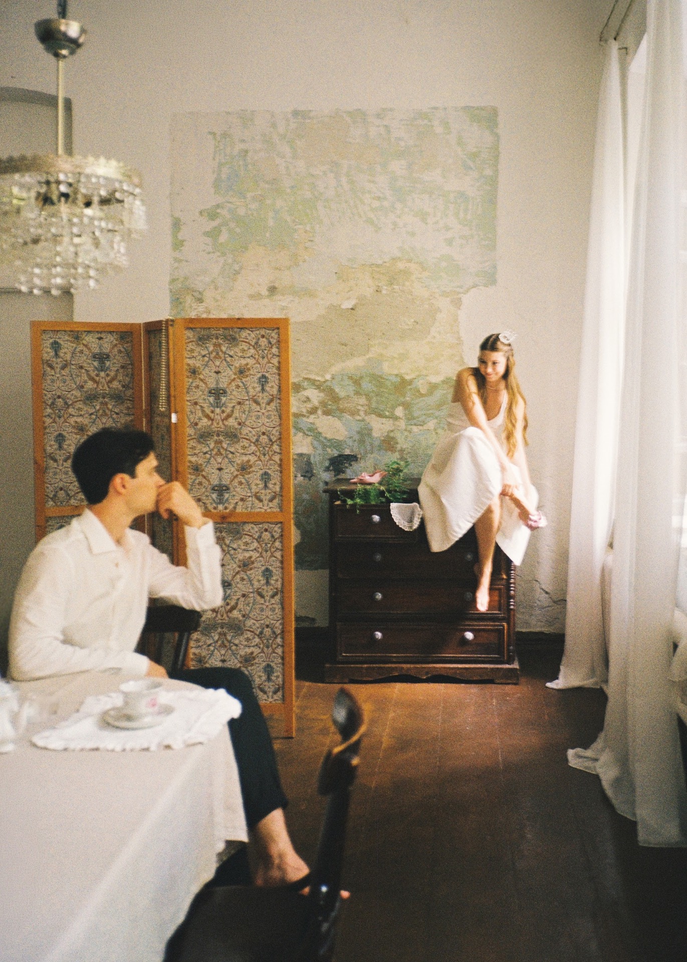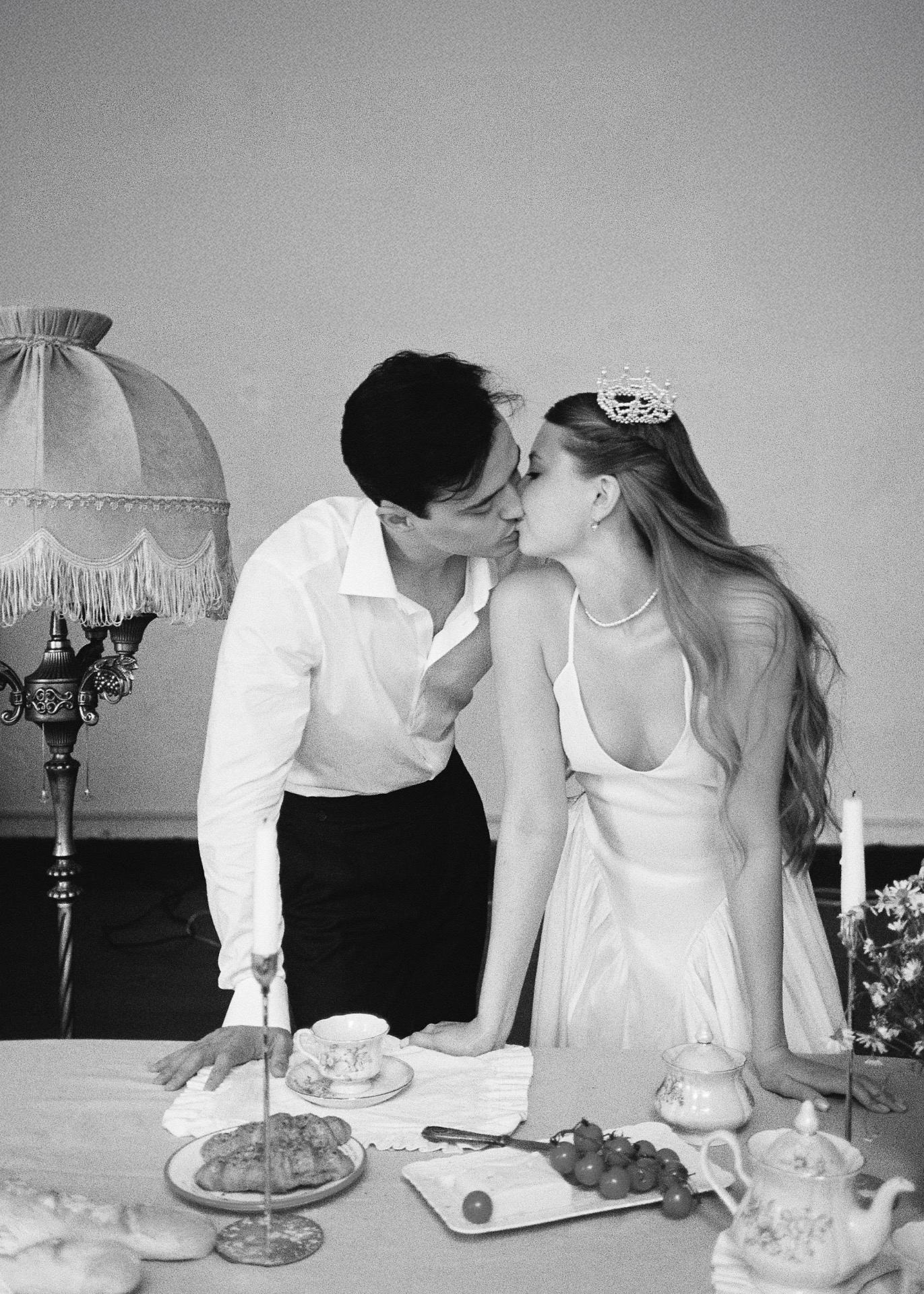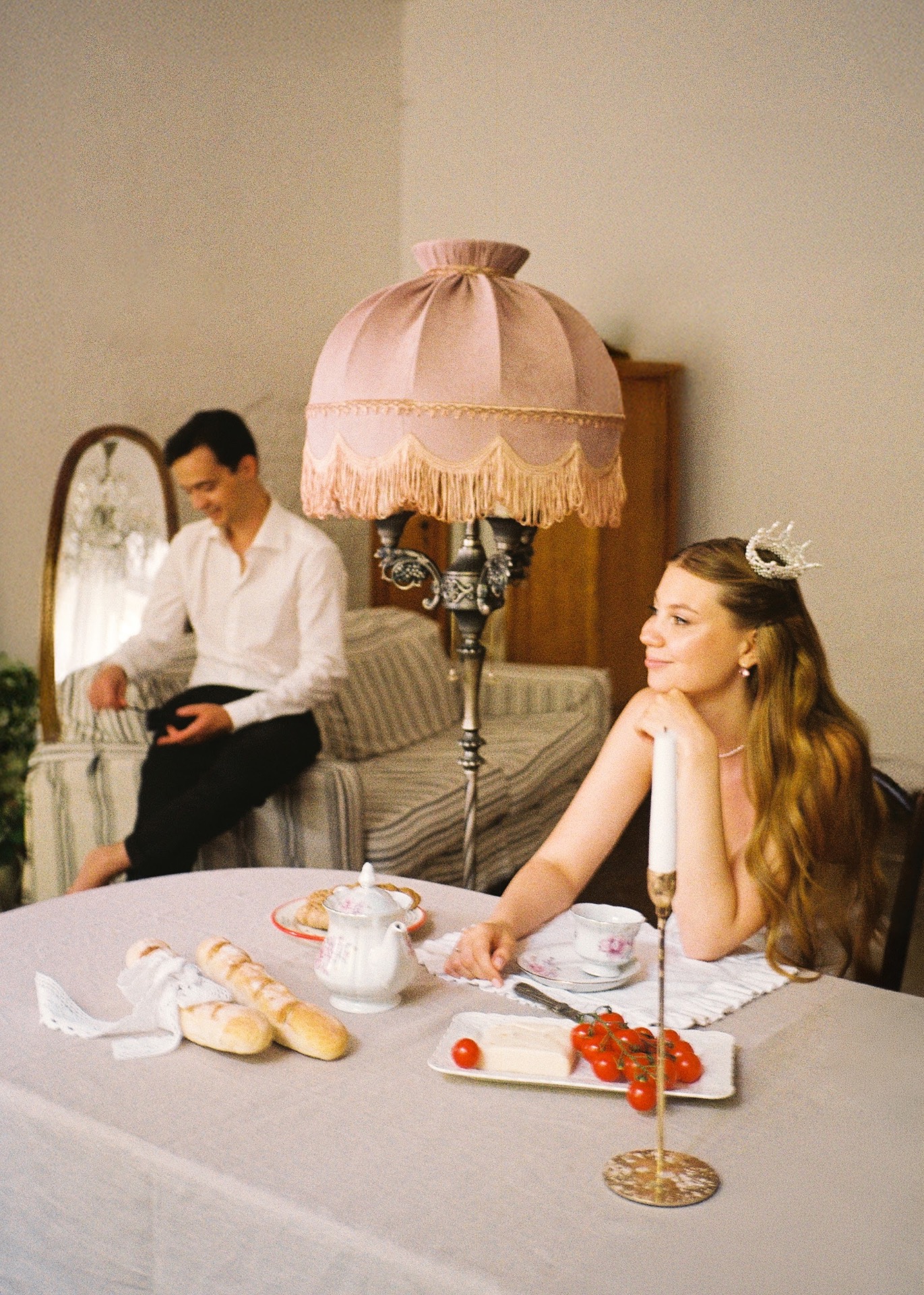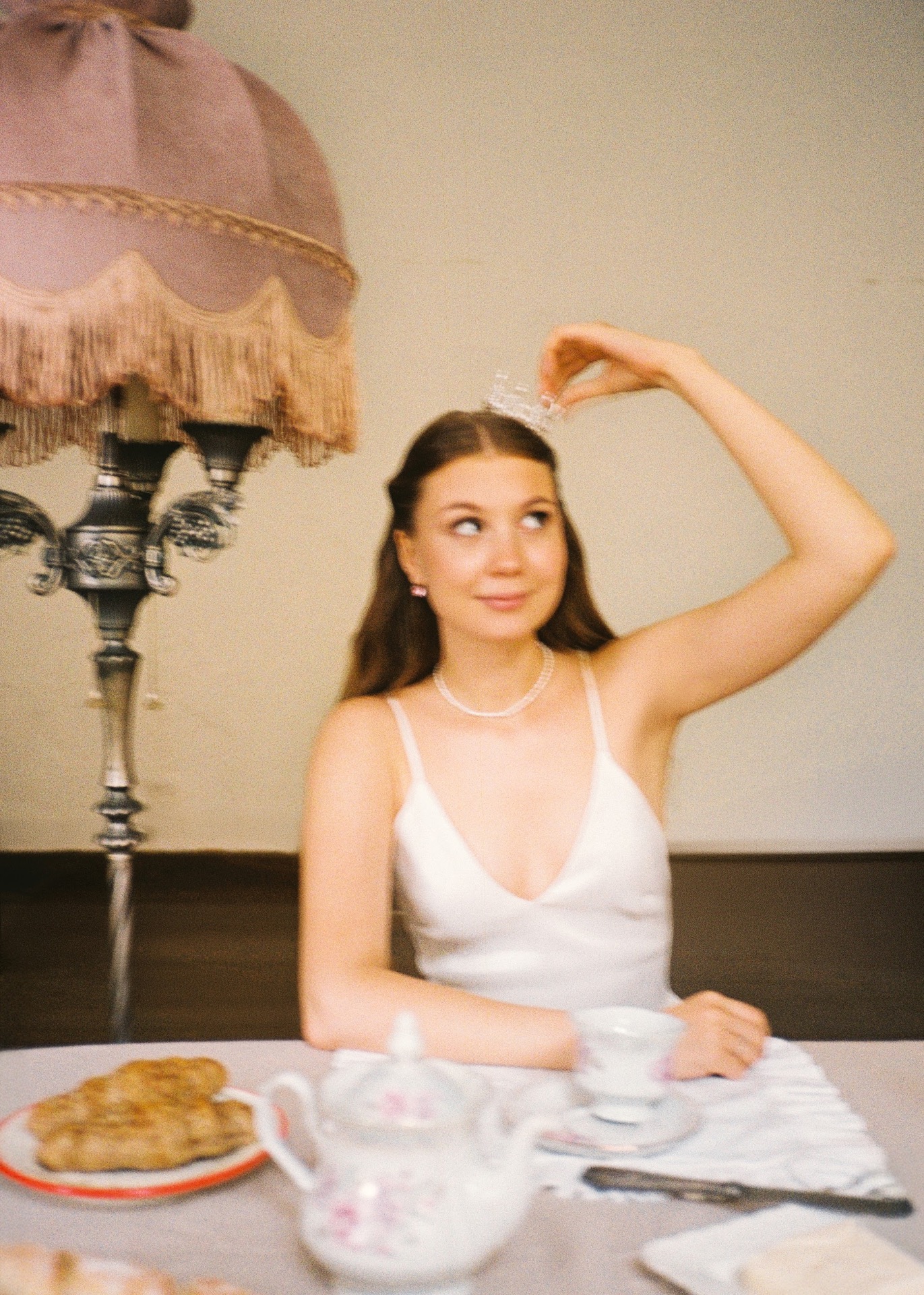 На утро невесты я выбрала платье с драпировкой, «съехавшую» на бок корону и розовые атласные туфли с бантом как символ лёгкости и наивности. А главным аксессуаром стала сумка-чайник, в которой читалась отсылка к моей профессии.
