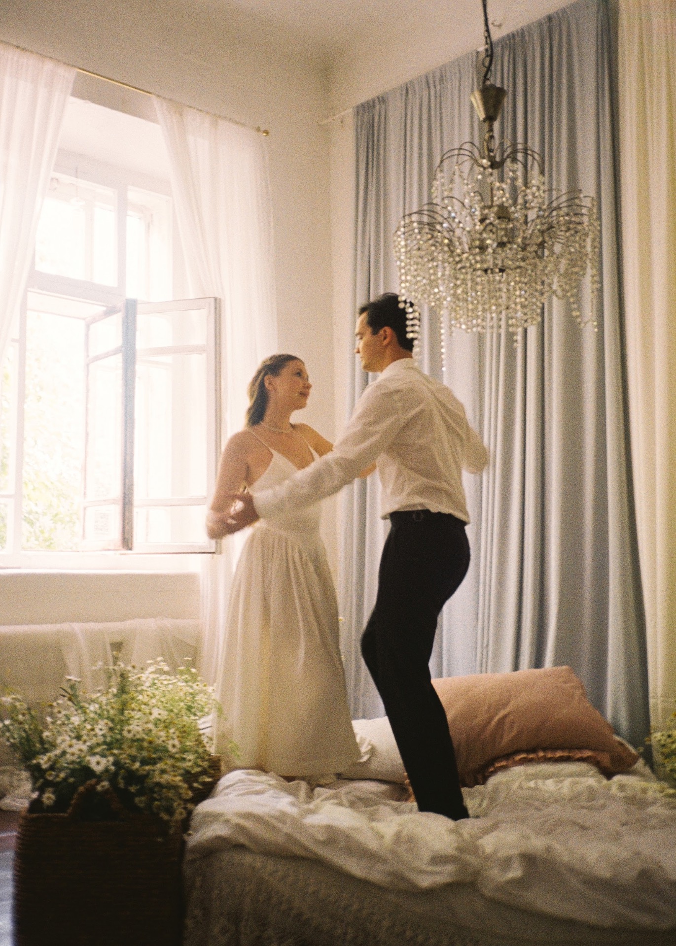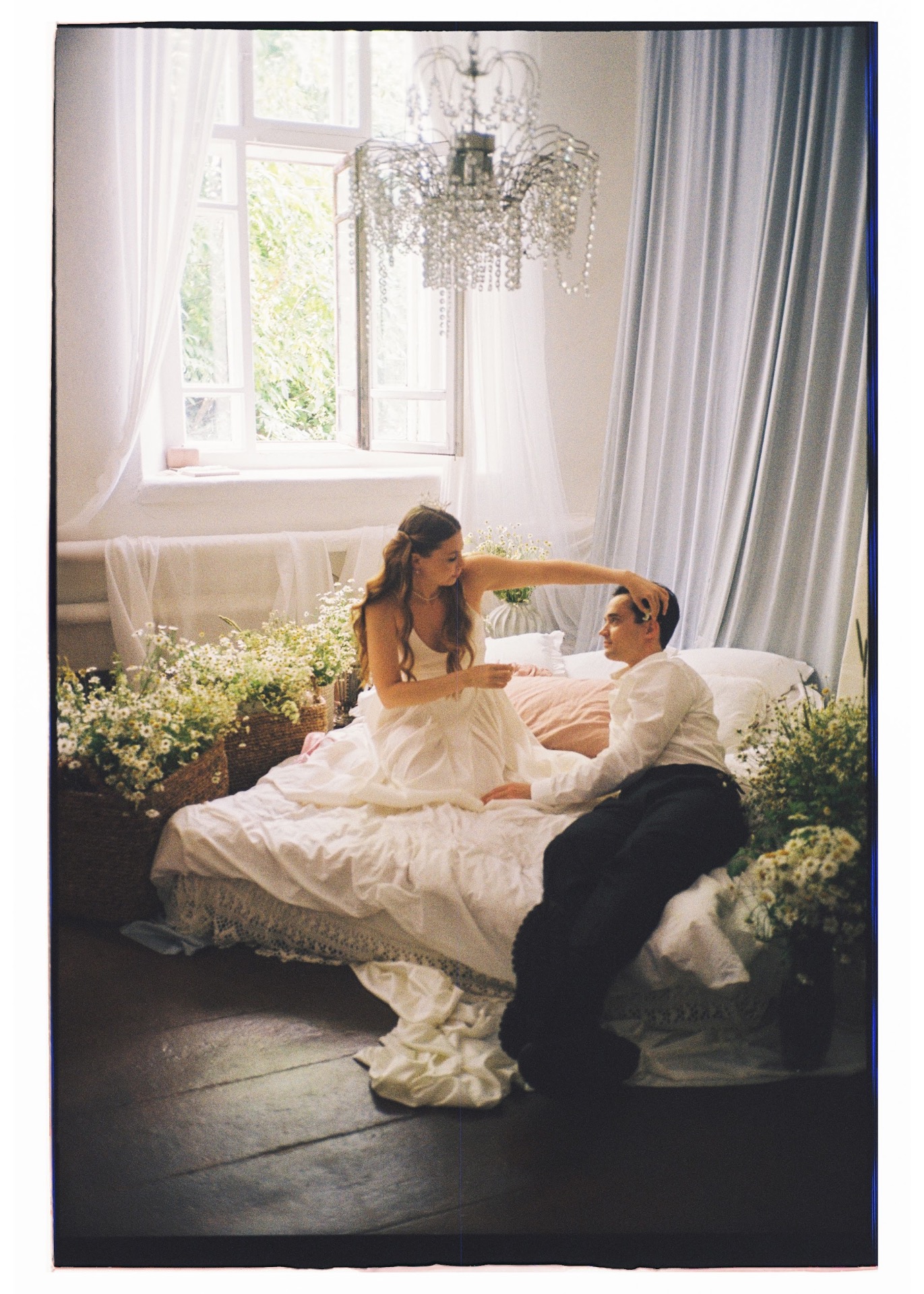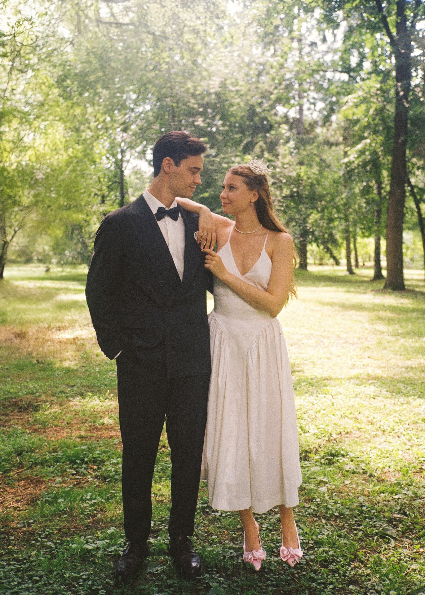Основным образом стали юбка и корсет из тафты от Sovanna Atelier. Длина была специально укорочена, чтобы были видны туфельки и было удобно бесконечно танцевать. На церемонии мой образ дополнял атласный шарфик, позже сменившийся на жемчужный цветок, который перекликался с бутоньеркой Сени. Вечером наряд трансформировался в платье длины мини с помощью розовых атласных лент в цвет к туфелькам.