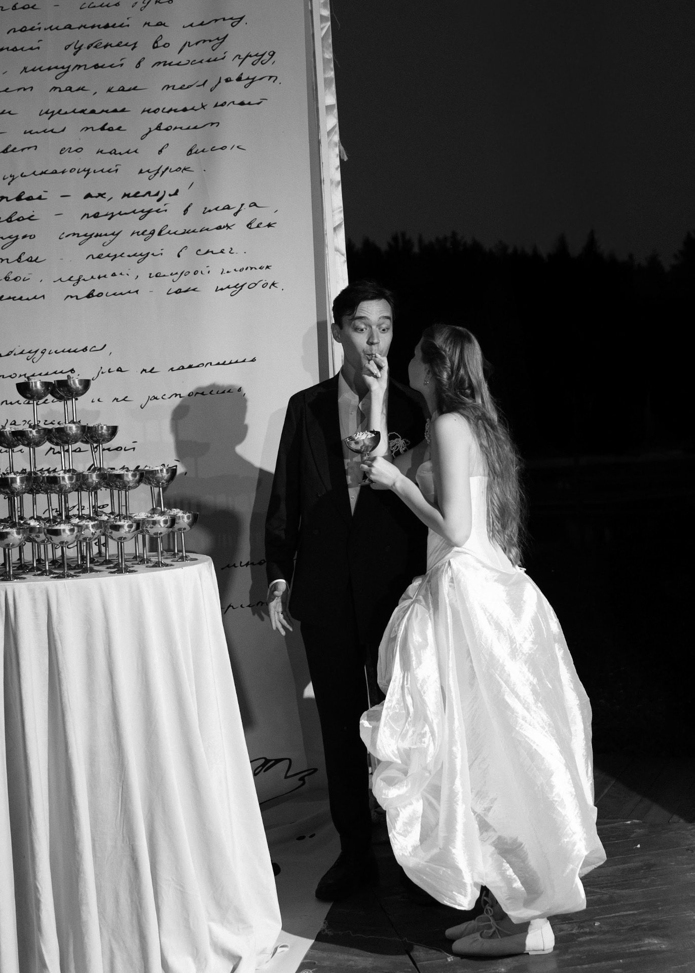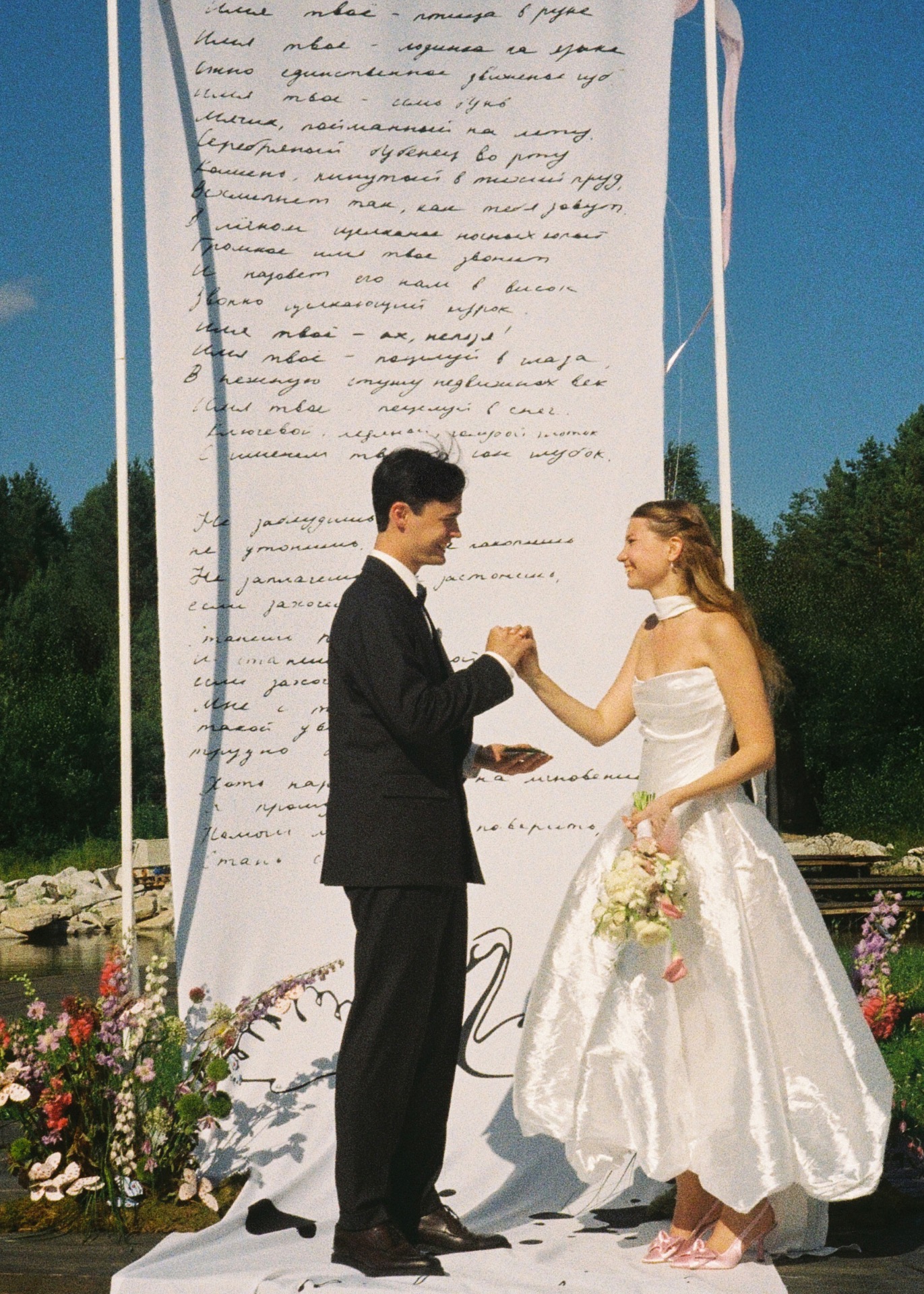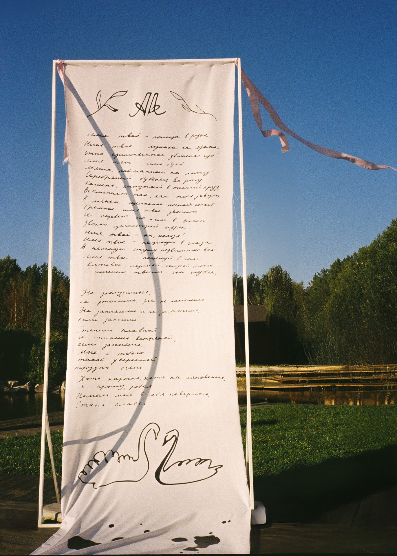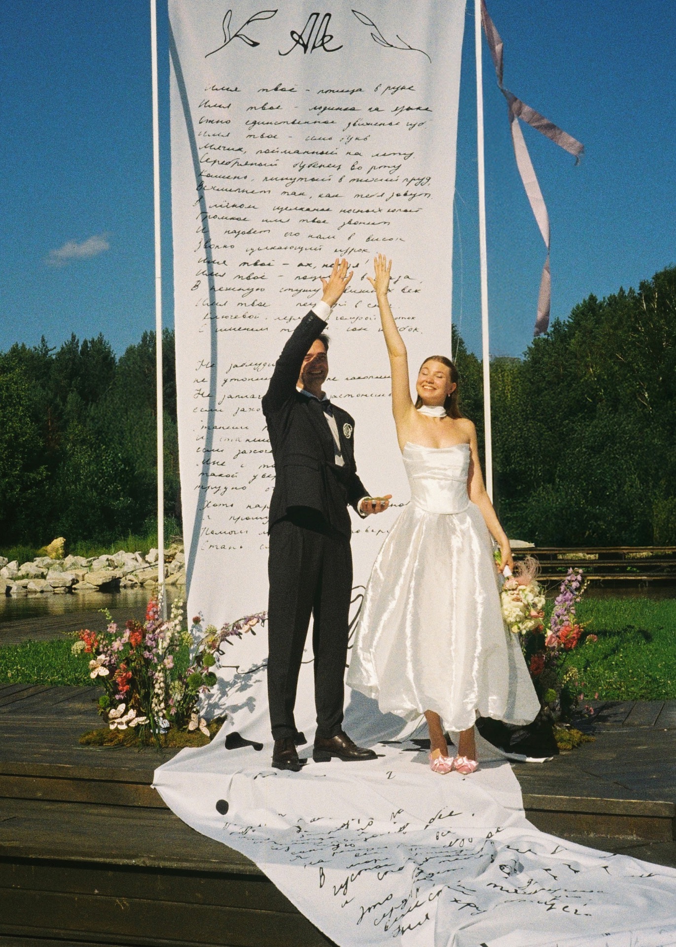 Концепция родилась из моей мечты быть принцессой. Мы вдохновлялись иллюстрациями из советских сказок, которые отражают лёгкость, молодость и волшебство. Наша свадьба наполнилась различными сказочными атрибутами: крыльями фей, волшебными палочками, бабочками в композициях на столах, яркими «зельями»-коктейлями и стихами в зоне церемонии, написанными мной от руки пером. Это стало моей отсылкой к воспоминаниям о том, что в детстве бабушка читала мне много поэзии.