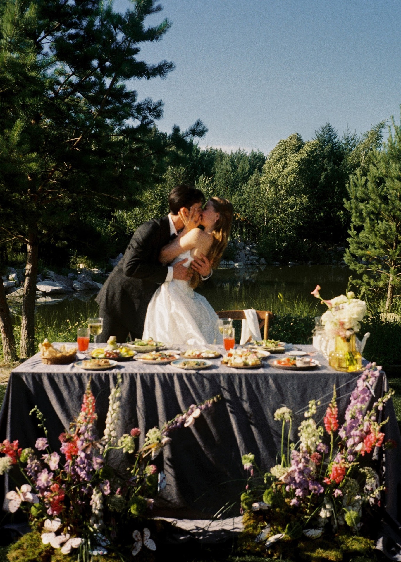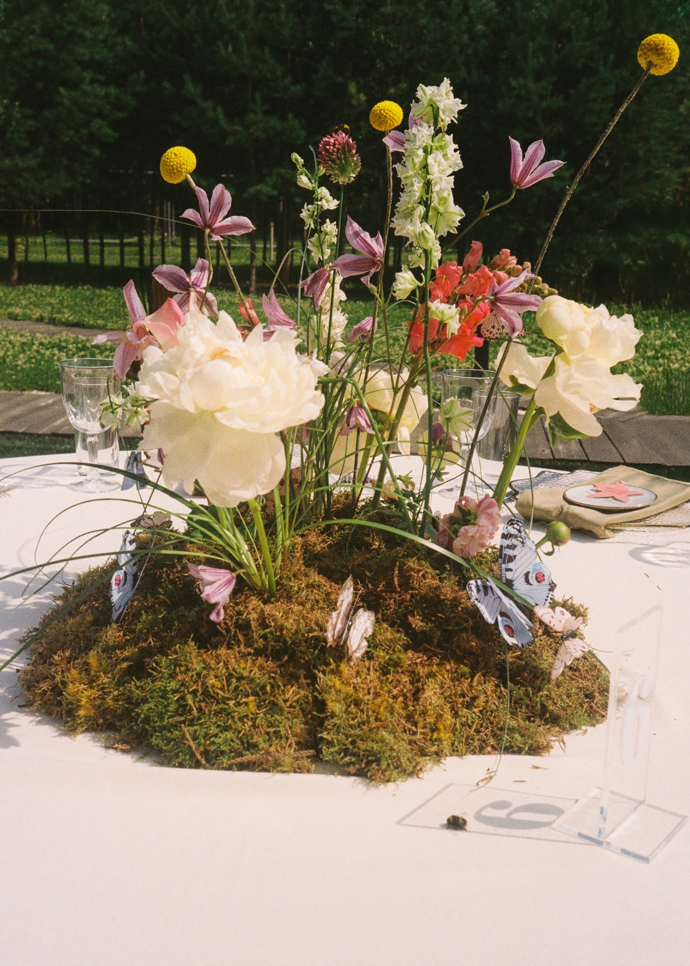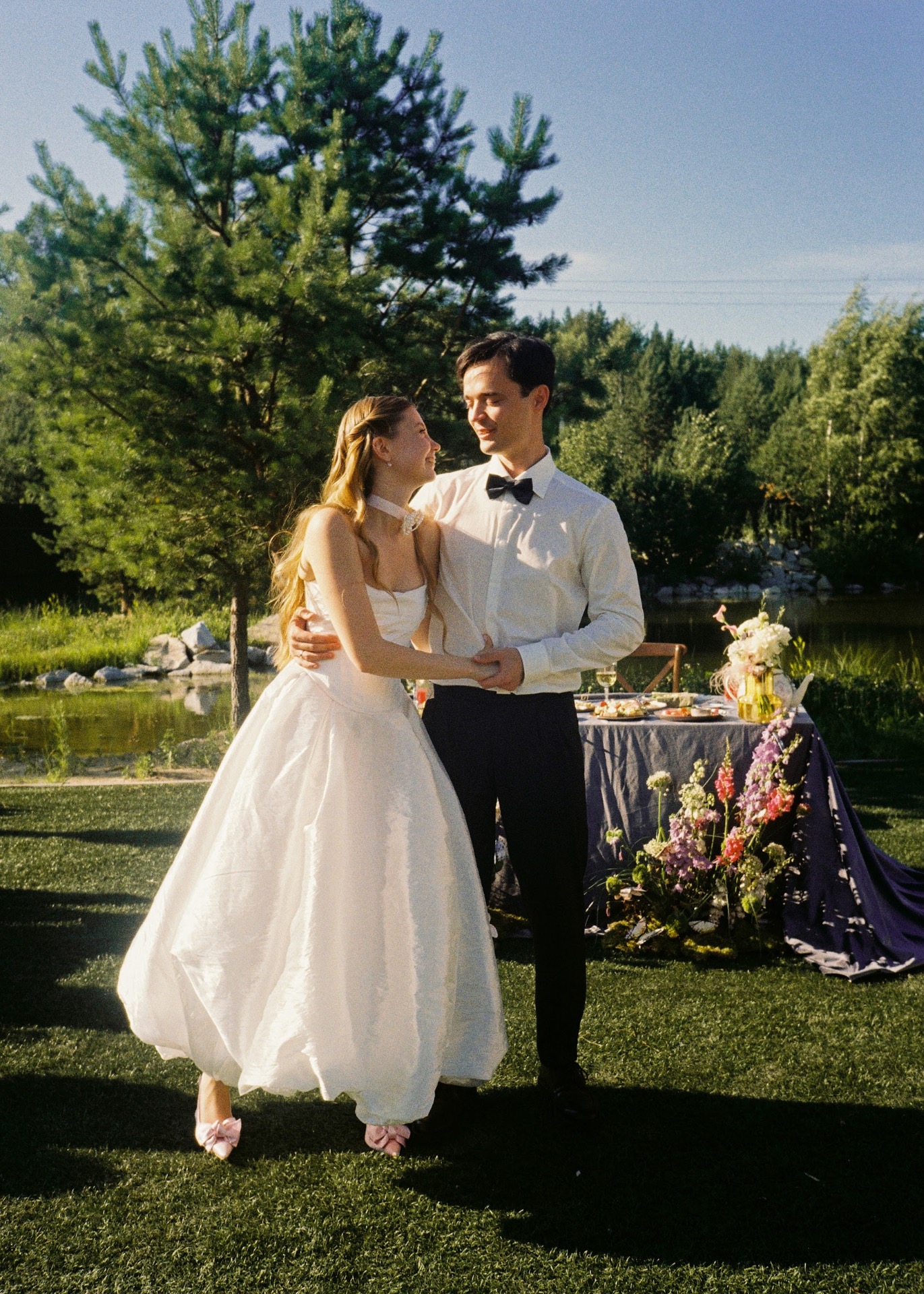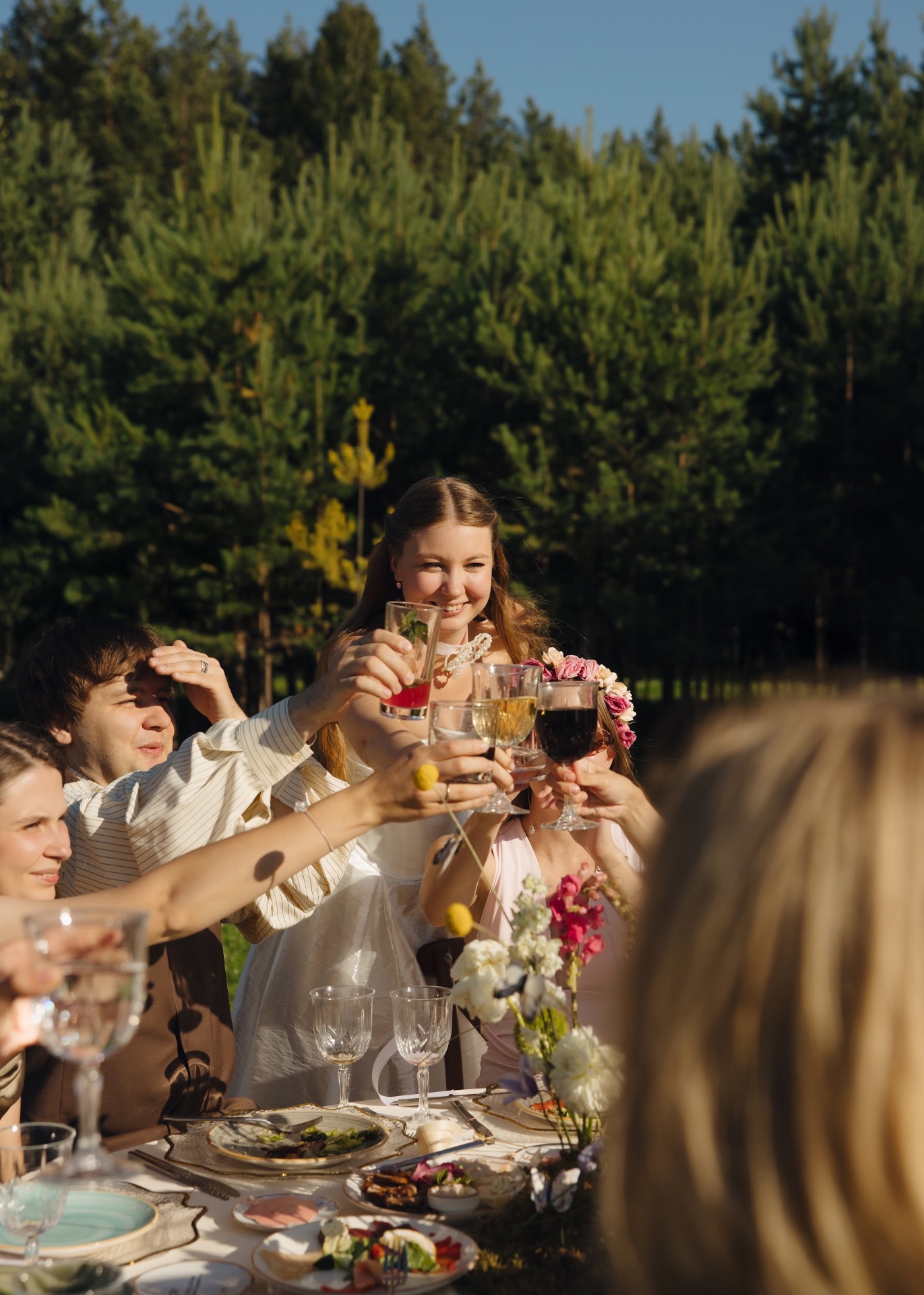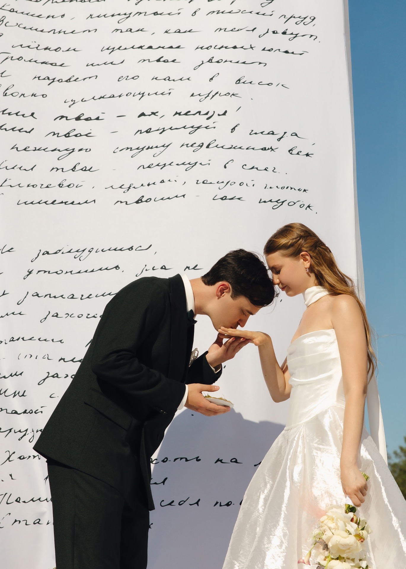 Концепция родилась из моей мечты быть принцессой. Мы вдохновлялись иллюстрациями из советских сказок, которые отражают лёгкость, молодость и волшебство. Наша свадьба наполнилась различными сказочными атрибутами: крыльями фей, волшебными палочками, бабочками в композициях на столах, яркими «зельями»-коктейлями и стихами в зоне церемонии, написанными мной от руки пером. Это стало моей отсылкой к воспоминаниям о том, что в детстве бабушка читала мне много поэзии.