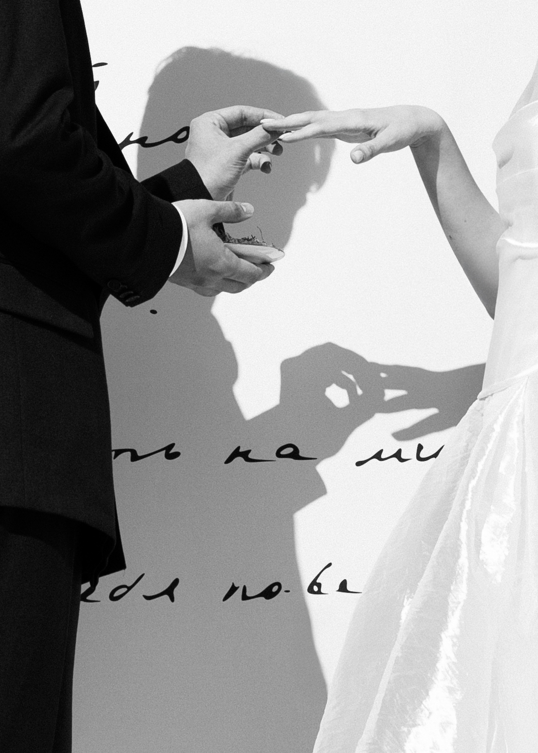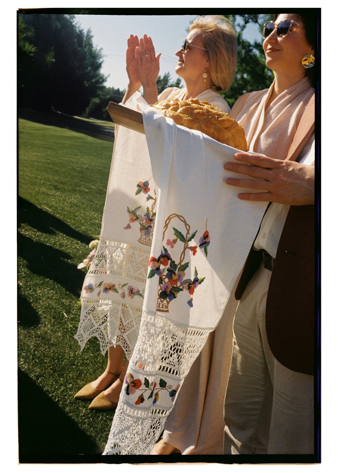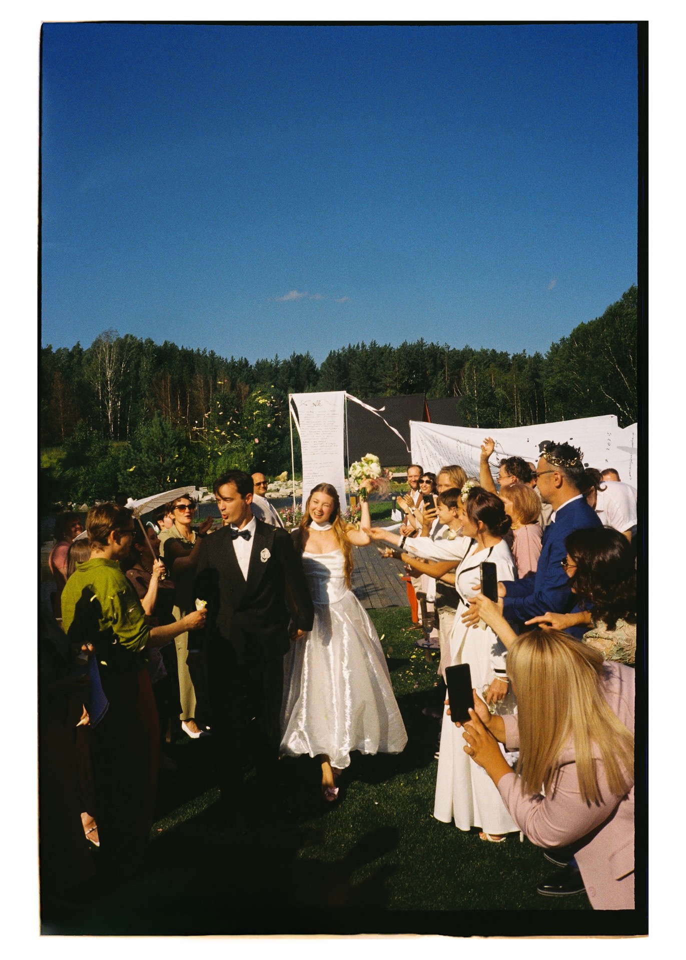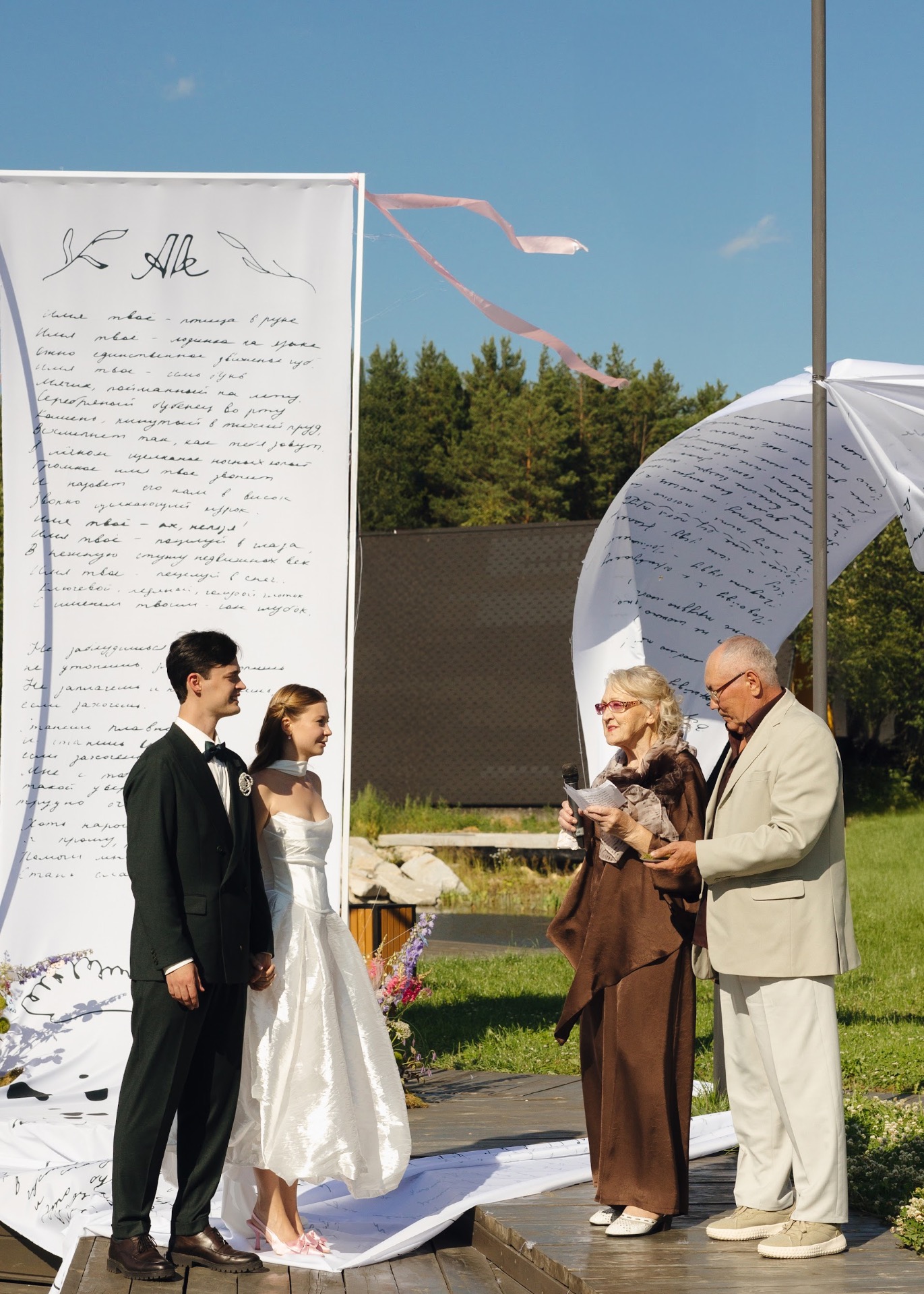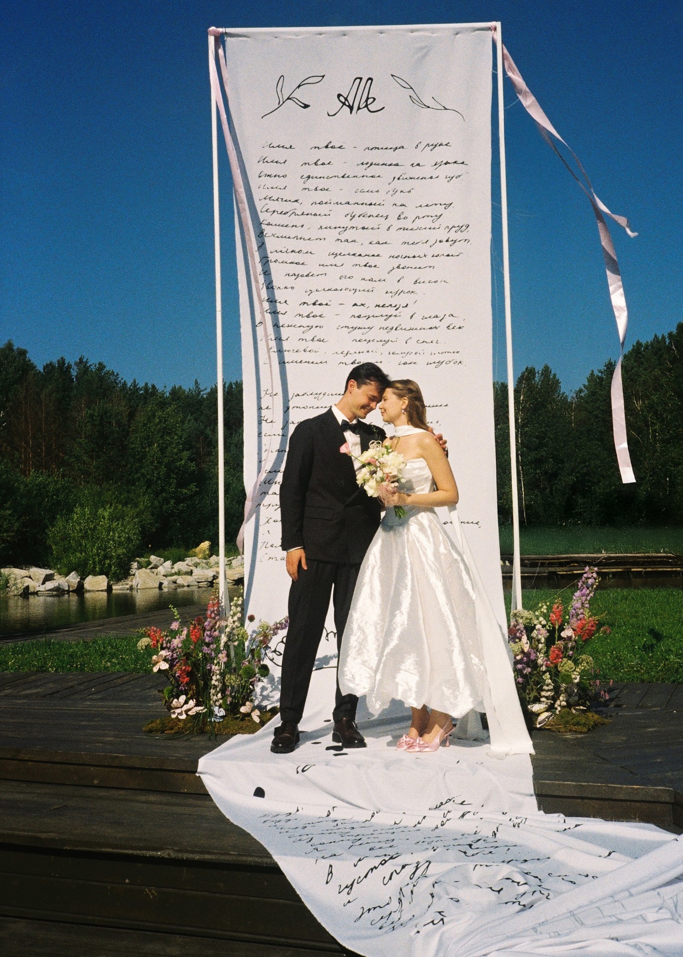 Церемония прошла трогательно и волшебно: ветер развевал полотно со стихами, а ведущий пересказывал всем присутствующим нашу историю взросления и любви. Кольца вынесли бабушка и дедушка, которые вместе уже 52 года. Для меня было важно отдать дань традициям, поэтому на нашей свадьбе был настоящий каравай на рушнике, который моя прабабушка вышила своими руками.