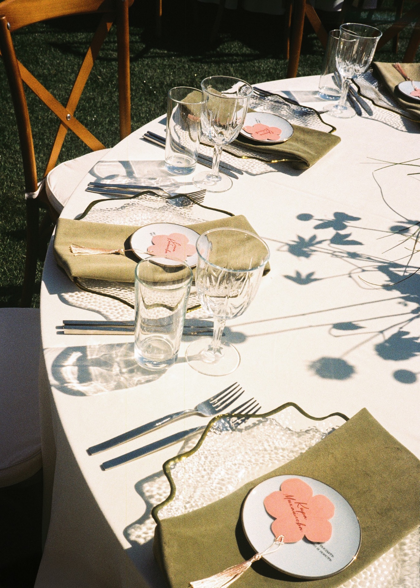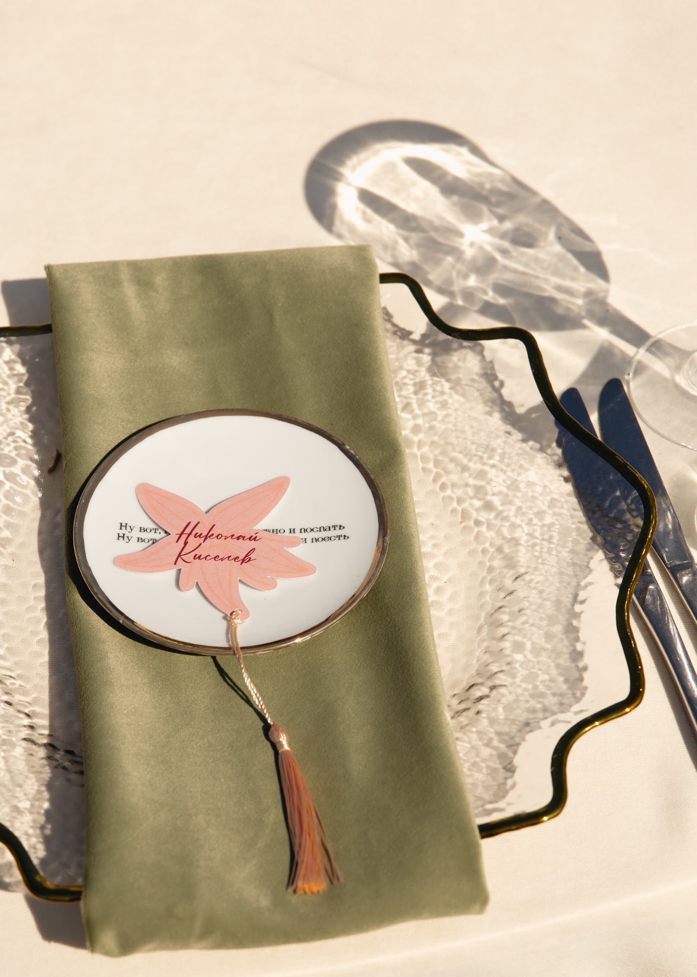 Ещё одна особенная деталь в декоре нашей свадьбы была связана с моей работой. Так как я занимаюсь производством фарфора, в сервировке мы использовали фарфоровые блюдца с золотой каёмочкой и цитатами из сказки «Дюймовочка». В конце вечера гости забрали их с собой в качестве маленьких предсказаний.
