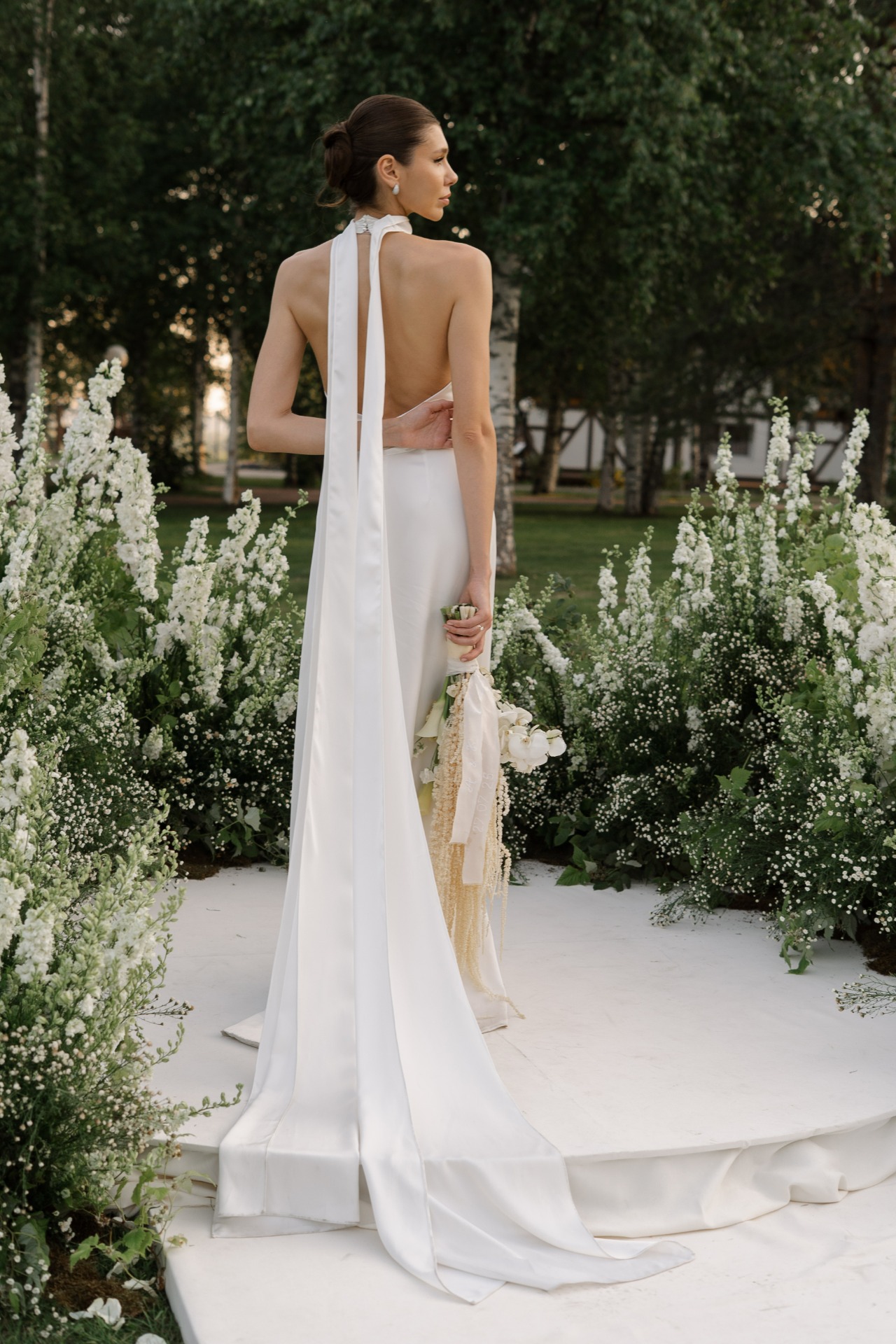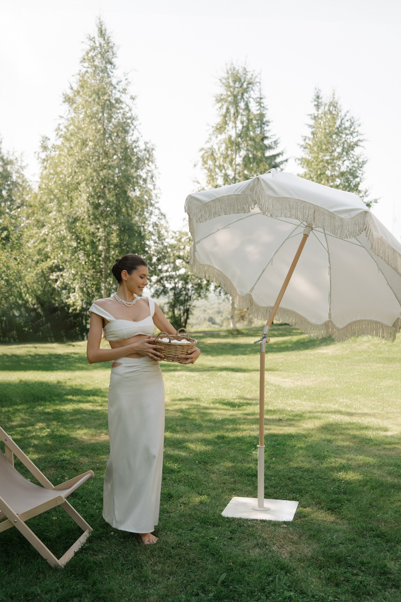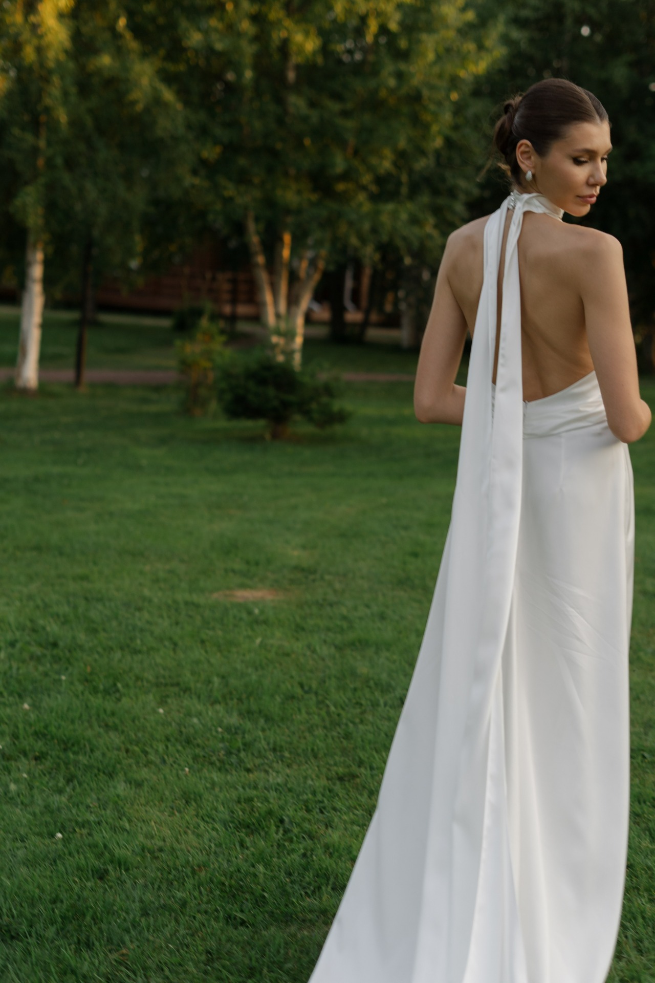 Всего у меня было 4 свадебных образа. На утро невесты я выбрала атласный топ и юбку в пол в цвете сливочного масла.