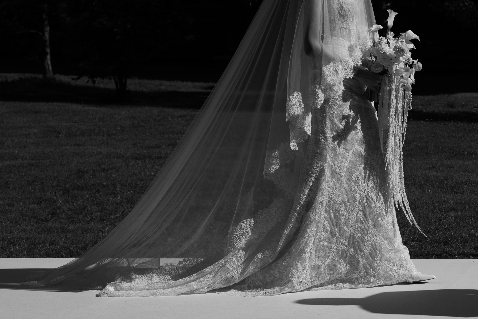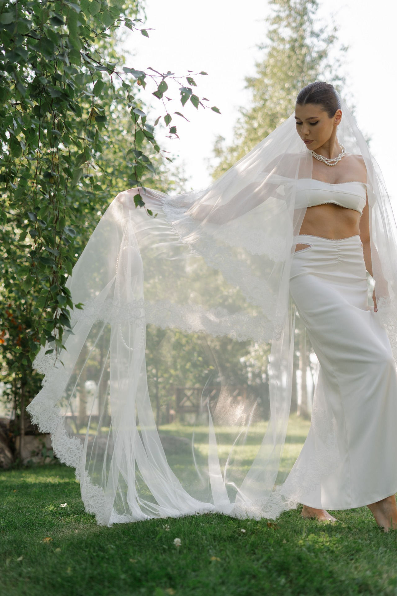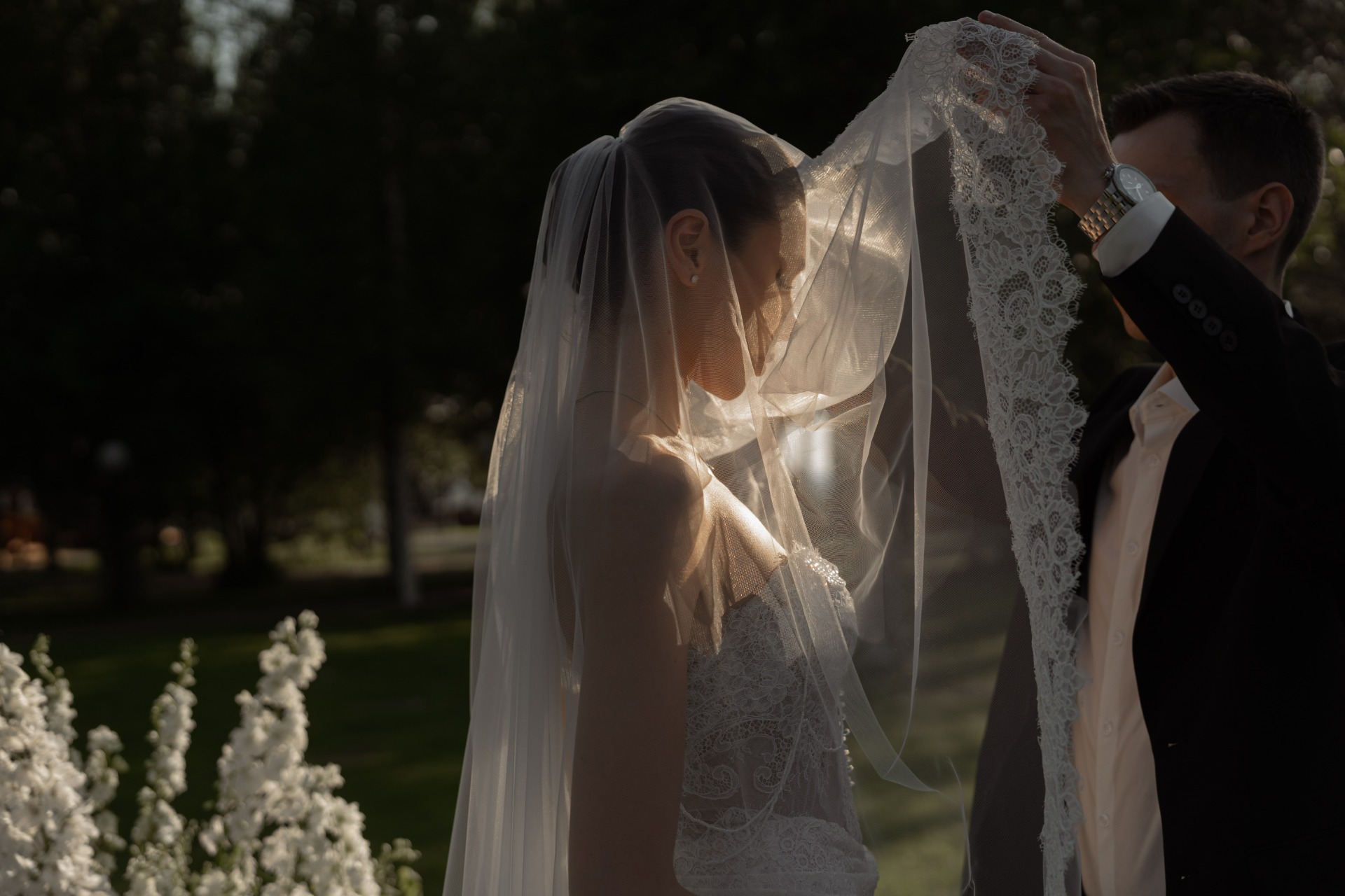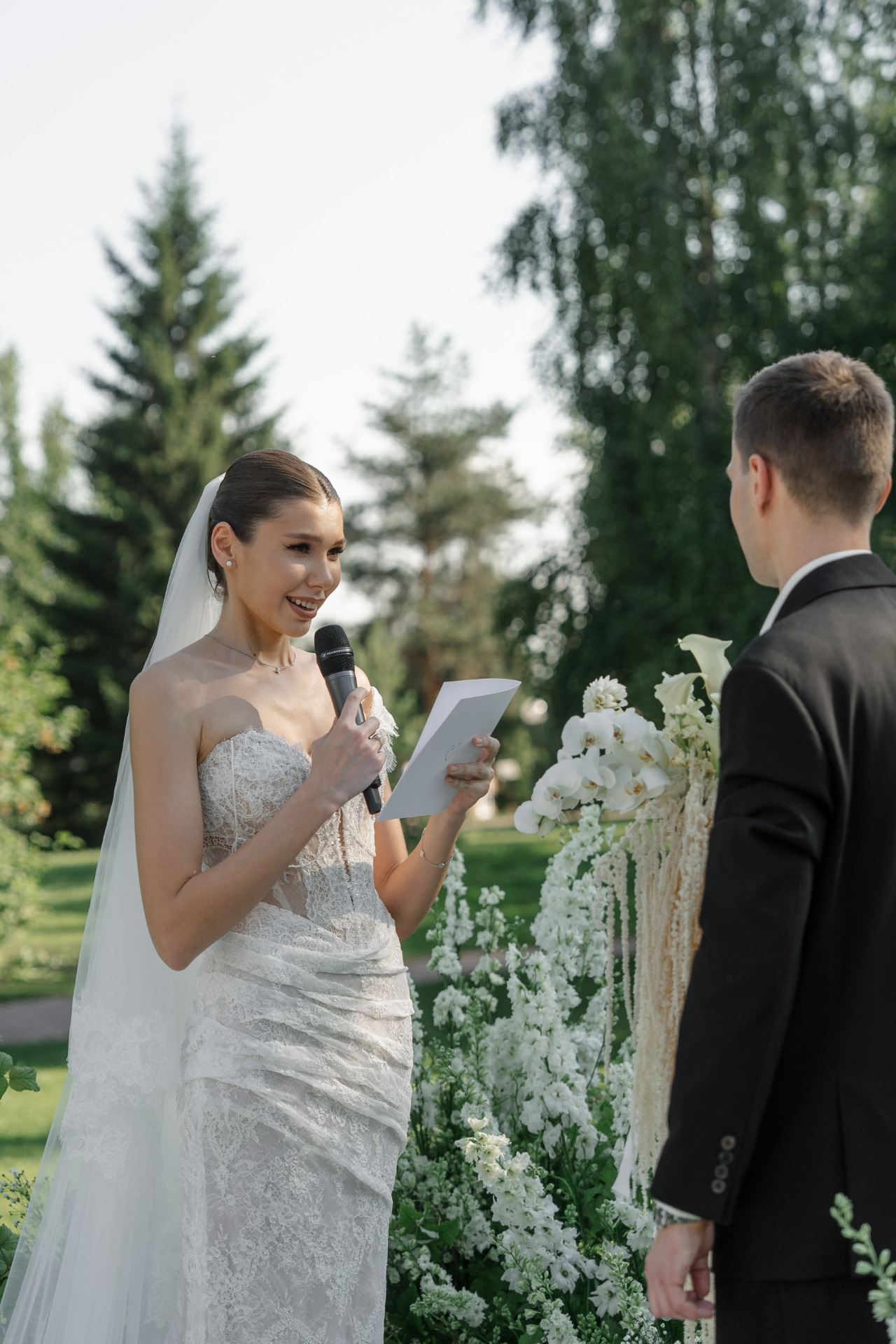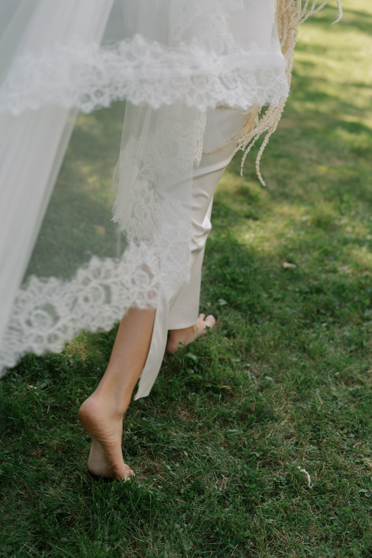Мой свадебный образ для церемонии был создан вручную. Я выбрала для себя дизайнерское платье, и после его изготовления почти 3 месяца ушло на подшив и подгонку, чтобы всё выглядело идеально. Я дополнила образ фатой из кружева, которая вручную изготавливалась мастерами в том же ателье, где я заказывала платье.