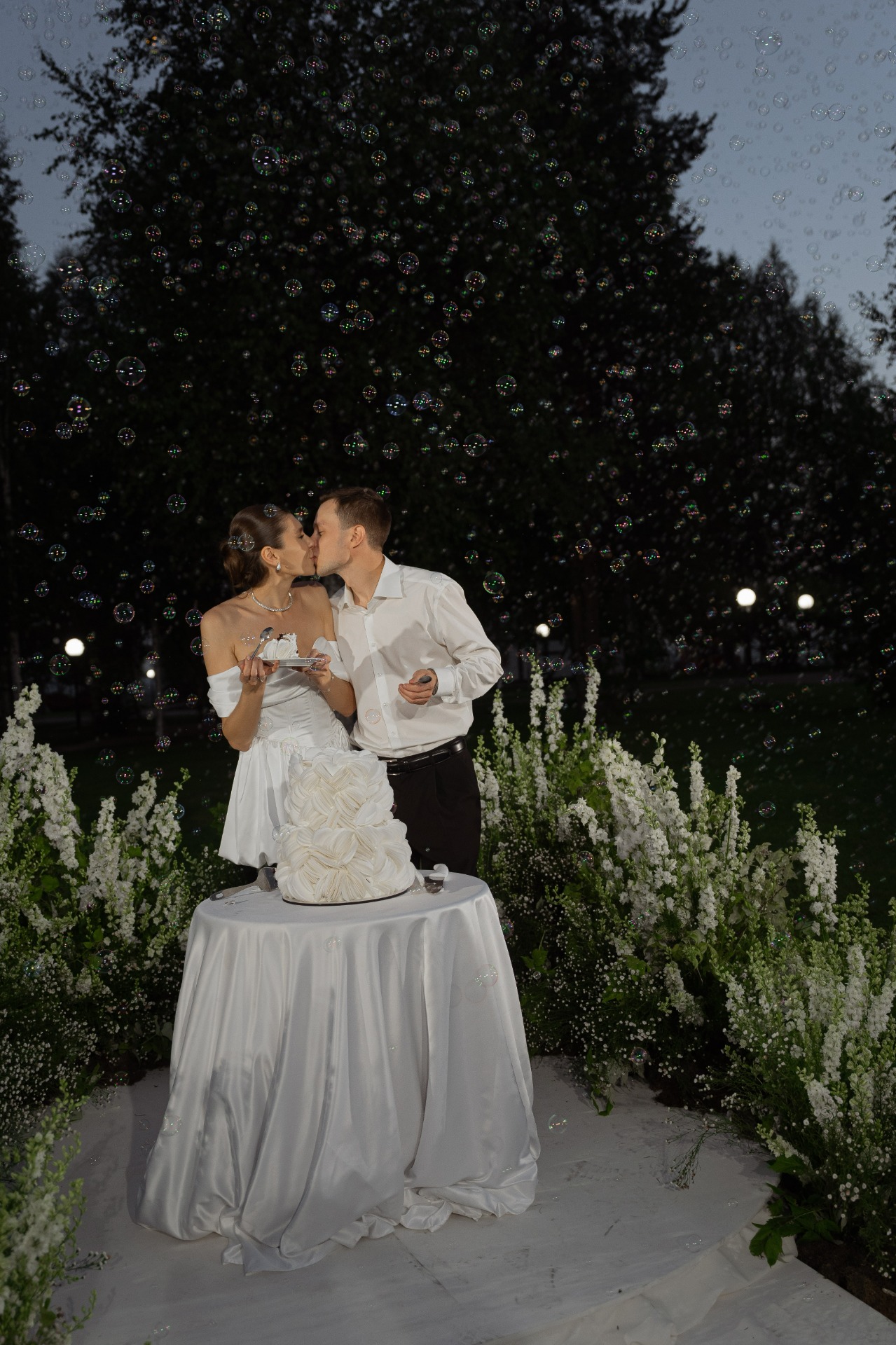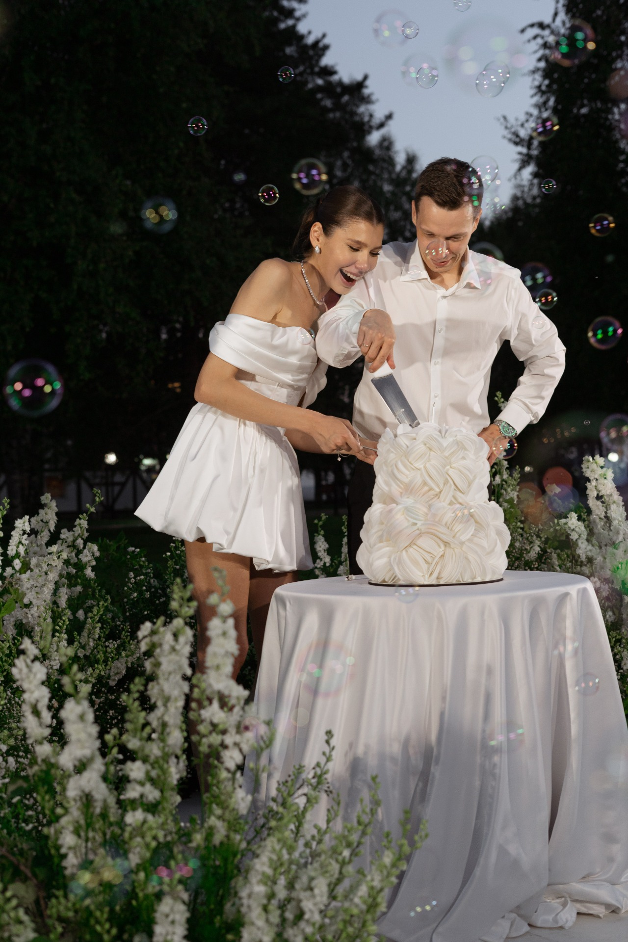 На наш первый танец я надела более лёгкое и лаконичное платье со шлейфом и открытой спиной из московского ателье. А на завершающую, но не менее важную часть, наш первый семейный торт, я выбрала лёгкое мини-платье с объёмной юбкой. Оно идеально сочеталось с воздушным тортом и мыльными пузырями, которые украсили этот момент.